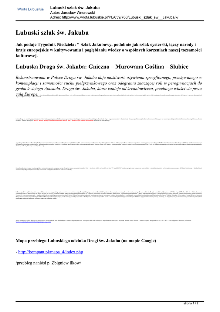 Lubuski szlak św. Jakuba Autor: Jarosław Wnorowski Adres: http://www.wrota.lubuskie.pl/PL/639/763/Lubuski_szlak_sw__Jakuba/k/ Lubuski szlak św. Jakuba Jak podaje Tygodnik Niedziela: " Szlak Jakubowy, podobnie jak szlak cysterski, łączy narody i kraje europejskie w kultywowaniu i pogłębianiu wiedzy o wspólnych korzeniach naszej tożsamości kulturowej. Lubuska Droga św. Jakuba: Gniezno – Murowana Goślina – Słubice Rekonstruowana w Polsce Droga św. Jakuba daje możliwość ożywienia specyficznego, przeżywanego w kontemplacji i samotności ruchu pielgrzymkowego oraz odegrania znaczącej roli w peregrynacjach do grobu świętego Apostoła. Droga św. Jakuba, która istnieje od średniowiecza, przebiega właściwie przez całą Europę. Odnowienia polskiego szlaku podjęło się w ostatnich latach wiele osób i organizacji. Zainteresowanie wędrówkami do Composteli zaowocowało również ogólnopolską konferencją, na której omówiono stan badań z zakresu dróg św. Jakuba w Polsce. Była to także okazja do wymiany doświadczeń w zakresie rekonstrukcji tych dróg i ich projektów w różnych częściach Polski." Lubuska Droga św. Jakuba łączy już istniejącą i od kilku lat służącą pielgrzymom Wielkopolską drogę św. Jakuba, która biegnie z Gniezna przez Poznań, Głogów, Zgorzelec do Pragi z drogami niemieckimi w Brandenburgii. Zaczyna się w Murowanej Goślinie od kościoła parafialnego pw. św. Jakuba i prowadzi przez Oborniki, Szamotuły, Ostroróg, Obrzycko, Wronki, Biezdrowo, Sieraków, Międzychód, Pszczew, Rokitno, Międzyrzecz, Bledzew, Lubniewice, Sulęcin, Ośno Lubuskie, Rzepin do Słubic (w lubuskiem) i Frankurtu nad Odrą (Niemcy). Jej przebieg w Lubuskiem i w Zachodniej Wielkopolsce w większości wyznacza Europejski Długodystansowy Szlak Pieszy E11. Jest ona naturalnym przedłużeniem Drogi Polskiej (Camino Polacco) z Olsztyna przez Toruń do Gniezna i najkrótszym szlakiem pątniczym prowadzącym z Wielkopolski w kierunku zachodnim. Liczy ok. 250 km (z odcinkami alternatywnymi trochę więcej), łączy ponad 50 miejscowości. Wiedzie wpierw przez rolnicze krajobrazy Wielkopolski , aby od okolic Wronek i Sierakowa skrajem Puszczy Noteckiej wnikać coraz głębiej w rozległe lasy Ziemi Lubuskiej z rzadka tylko ukazując szersze widoki pól i jezior. Te piękne okolice mają także niezwykle ciekawą historię, o której świadczą nie tylko dokumenty, ale też wspaniałe zabytki kultury materialnej i duchowej. Droga Lubuska stanowi część wspólnego polsko – niemieckiego projektu noszącego nazwę: „Drogi św. Jakuba na wschód i zachód od Odry – Jakobsweg östlich und westlich der Oder“. W latach 2005-07 został on przygotowany i opracowany przez polskich i niemieckich studentów pod kierunkiem naukowym prof. dr Ulricha Knefelkampa z Katedry Historii Średniowiecznej i Regionalnej Historii Kultury Uniwersytetu Europejskiego Viadrina we Frankfurcie nad Odrą. Podczas wyjazdów i wędrówek projektowanym szlakiem wytyczono jego przebieg, wykonano opis i stosowną dokumentację. Zostały także przeprowadzone badania źródeł i przekazów historycznych pozwalających na odtworzenie przebiegu dawnych traktów handlowych oraz szlaków pielgrzymkowych. W dniu 4 lipca 2007 roku odbyło się w Słubicach uroczyste symboliczne otwarcie Lubuskiej Drogi św. Jakuba, ale wtedy nie poszły za tym dalsze działania. Brakowało oznakowania i infrastruktury. Nie wydano też przewodnika ani żadnych materiałów promocyjnych. Te drogi istniały tylko wirtualnie, a skąpa i trudno dostępna informacja w internecie znana była bardzo nielicznym. Ostatnio jednak sytuacja zaczęła się zmieniać. Wiosną 2010 roku ruszyło znakowanie w Brandenburgii i w dwóch polskich przygranicznych powiatach Słubice i Sulęcin, które ukończono jesienią. Instalowane są też tablice informacyjne i miejsca odpoczynku. Jest to współdziałanie strony polskiej i niemieckiej w ramach Euroregionu „Pro Europa Viadrina” obejmujace 114 km szlaku w Polsce i 221 km w Niemczech. Dlatego Stowarzyszenie „Przyjaciele Dróg św. Jakuba w Polsce” podjęło inicjatywę mającą na celu realizację pozostałej części szlaku w Wielkopolsce i powiecie międzyrzeckim. Chodzi o stworzenie komplementarnej przestrzeni Drogi św. Jakuba, ze spójnym oznakowaniem, promocją, informacją, itd. Przygotowywane jest również wydanie przewodnika w języku polskim i niemieckim opisującego całą Drogę Lubuską od Murowanej Gośliny do granicy. Więcej informacji o Drodze Lubuskiej oraz możliwościach dalszej wędrówki przez Brandenburgię w kierunku Magdeburga, Kolonii, Akwizgranu i dalej aż do Santiago de Compostela można przeczytać w artykule pt. „Śladami cesarzy i królów…” zamieszczonym w „Pielgrzymku” nr. 1(7)/2011, str. 9 -11 oraz w tygodniku "Niedziela" pod adresem: http://www.niedziela.pl/artykul/86699/nd/Najpiekniejsza-droga-swiata Mapa przebiegu Lubuskiego odcinka Drogi św. Jakuba (na mapie Google) - http://kompant.pl/mapa_4/index.php /przebieg naniósł p. Zbigniew llkow/ strona 1 / 2 Lubuski szlak św. Jakuba Autor: Jarosław Wnorowski Adres: http://www.wrota.lubuskie.pl/PL/639/763/Lubuski_szlak_sw__Jakuba/k/ Mapa szlaków Jakubowych w Polsce strona 2 / 2 Powered by TCPDF (www.tcpdf.org)