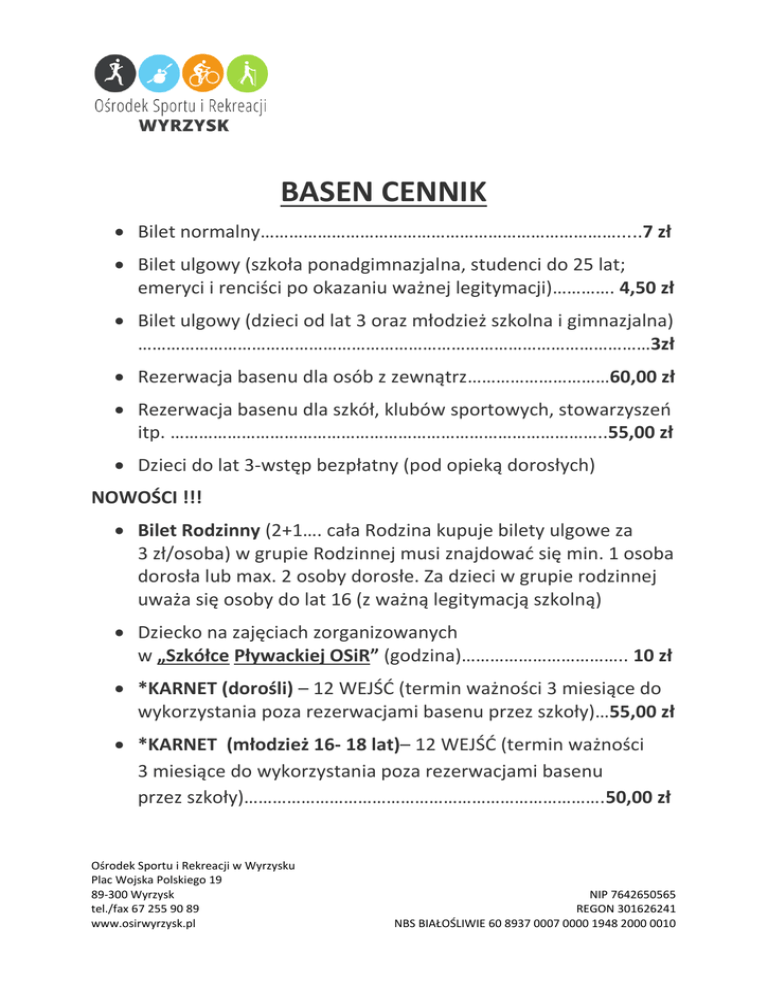 BASEN CENNIK Bilet normalny………………………………………………………………….....7 zł Bilet ulgowy (szkoła ponadgimnazjalna, studenci do 25 lat; emeryci i renciści po okazaniu ważnej legitymacji)…………. 4,50 zł Bilet ulgowy (dzieci od lat 3 oraz młodzież szkolna i gimnazjalna) ………………………………………………………………………………………………3zł Rezerwacja basenu dla osób z zewnątrz…………………………60,00 zł Rezerwacja basenu dla szkół, klubów sportowych, stowarzyszeń itp. ………………………………………………………………………………..55,00 zł Dzieci do lat 3-wstęp bezpłatny (pod opieką dorosłych) NOWOŚCI !!! Bilet Rodzinny (2+1…. cała Rodzina kupuje bilety ulgowe za 3 zł/osoba) w grupie Rodzinnej musi znajdować się min. 1 osoba dorosła lub max. 2 osoby dorosłe. Za dzieci w grupie rodzinnej uważa się osoby do lat 16 (z ważną legitymacją szkolną) Dziecko na zajęciach zorganizowanych w „Szkółce Pływackiej OSiR” (godzina)…………………………….. 10 zł *KARNET (dorośli) – 12 WEJŚĆ (termin ważności 3 miesiące do wykorzystania poza rezerwacjami basenu przez szkoły)…55,00 zł *KARNET (młodzież 16- 18 lat)– 12 WEJŚĆ (termin ważności 3 miesiące do wykorzystania poza rezerwacjami basenu przez szkoły)………………………………………………………………….50,00 zł Ośrodek Sportu i Rekreacji w Wyrzysku Plac Wojska Polskiego 19 89-300 Wyrzysk tel./fax 67 255 90 89 www.osirwyrzysk.pl NIP 7642650565 REGON 301626241 NBS BIAŁOŚLIWIE 60 8937 0007 0000 1948 2000 0010