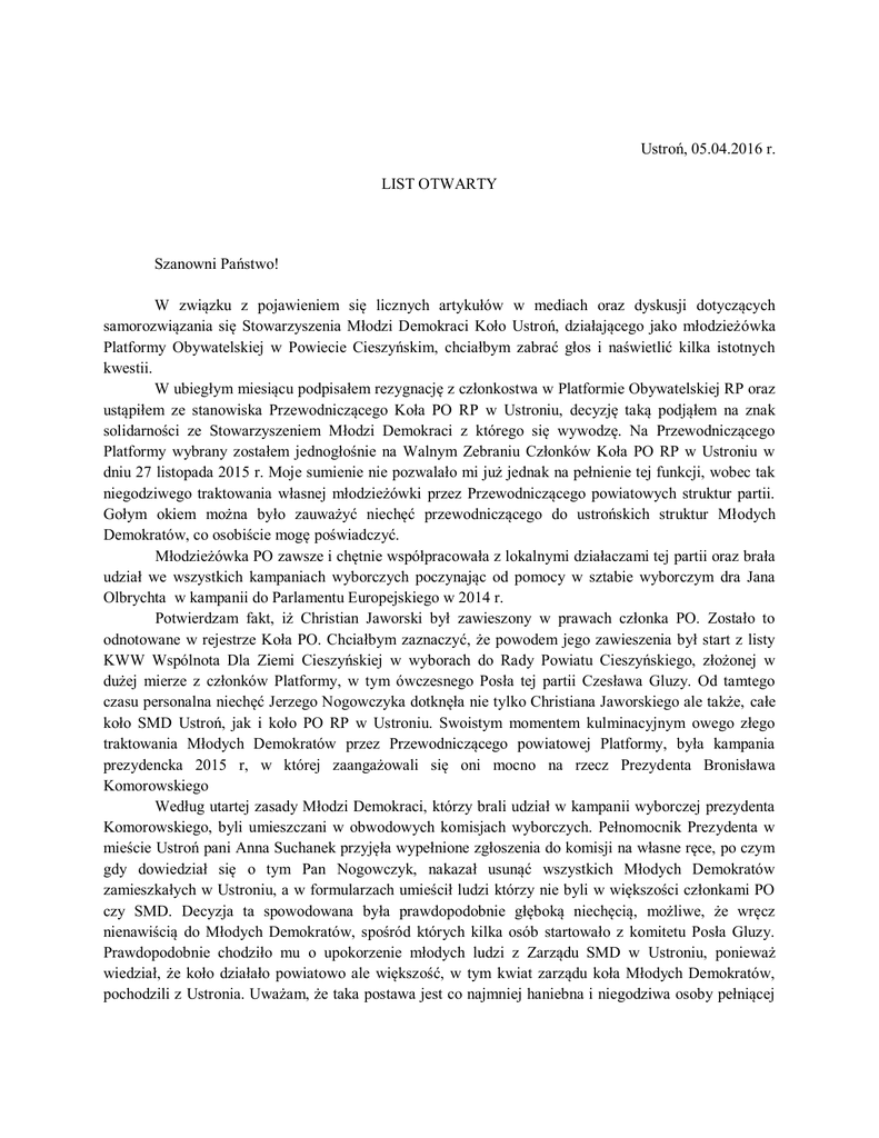 Ustroń, 05.04.2016 r. LIST OTWARTY Szanowni Państwo! W związku z pojawieniem się licznych artykułów w mediach oraz dyskusji dotyczących samorozwiązania się Stowarzyszenia Młodzi Demokraci Koło Ustroń, działającego jako młodzieżówka Platformy Obywatelskiej w Powiecie Cieszyńskim, chciałbym zabrać głos i naświetlić kilka istotnych kwestii. W ubiegłym miesiącu podpisałem rezygnację z członkostwa w Platformie Obywatelskiej RP oraz ustąpiłem ze stanowiska Przewodniczącego Koła PO RP w Ustroniu, decyzję taką podjąłem na znak solidarności ze Stowarzyszeniem Młodzi Demokraci z którego się wywodzę. Na Przewodniczącego Platformy wybrany zostałem jednogłośnie na Walnym Zebraniu Członków Koła PO RP w Ustroniu w dniu 27 listopada 2015 r. Moje sumienie nie pozwalało mi już jednak na pełnienie tej funkcji, wobec tak niegodziwego traktowania własnej młodzieżówki przez Przewodniczącego powiatowych struktur partii. Gołym okiem można było zauważyć niechęć przewodniczącego do ustrońskich struktur Młodych Demokratów, co osobiście mogę poświadczyć. Młodzieżówka PO zawsze i chętnie współpracowała z lokalnymi działaczami tej partii oraz brała udział we wszystkich kampaniach wyborczych poczynając od pomocy w sztabie wyborczym dra Jana Olbrychta w kampanii do Parlamentu Europejskiego w 2014 r. Potwierdzam fakt, iż Christian Jaworski był zawieszony w prawach członka PO. Zostało to odnotowane w rejestrze Koła PO. Chciałbym zaznaczyć, że powodem jego zawieszenia był start z listy KWW Wspólnota Dla Ziemi Cieszyńskiej w wyborach do Rady Powiatu Cieszyńskiego, złożonej w dużej mierze z członków Platformy, w tym ówczesnego Posła tej partii Czesława Gluzy. Od tamtego czasu personalna niechęć Jerzego Nogowczyka dotknęła nie tylko Christiana Jaworskiego ale także, całe koło SMD Ustroń, jak i koło PO RP w Ustroniu. Swoistym momentem kulminacyjnym owego złego traktowania Młodych Demokratów przez Przewodniczącego powiatowej Platformy, była kampania prezydencka 2015 r, w której zaangażowali się oni mocno na rzecz Prezydenta Bronisława Komorowskiego Według utartej zasady Młodzi Demokraci, którzy brali udział w kampanii wyborczej prezydenta Komorowskiego, byli umieszczani w obwodowych komisjach wyborczych. Pełnomocnik Prezydenta w mieście Ustroń pani Anna Suchanek przyjęła wypełnione zgłoszenia do komisji na własne ręce, po czym gdy dowiedział się o tym Pan Nogowczyk, nakazał usunąć wszystkich Młodych Demokratów zamieszkałych w Ustroniu, a w formularzach umieścił ludzi którzy nie byli w większości członkami PO czy SMD. Decyzja ta spowodowana była prawdopodobnie głęboką niechęcią, możliwe, że wręcz nienawiścią do Młodych Demokratów, spośród których kilka osób startowało z komitetu Posła Gluzy. Prawdopodobnie chodziło mu o upokorzenie młodych ludzi z Zarządu SMD w Ustroniu, ponieważ wiedział, że koło działało powiatowo ale większość, w tym kwiat zarządu koła Młodych Demokratów, pochodzili z Ustronia. Uważam, że taka postawa jest co najmniej haniebna i niegodziwa osoby pełniącej funkcję Przewodniczącego Platformy Obywatelskiej w powiecie Cieszyńskim, byłego Starosty Cieszyńskiego. W związku z niesprawiedliwym i głęboko krzywdzącym potraktowaniem Młodych Demokratów, ja oraz dwóch pozostałych członków PO będących wówczas jednocześnie w zarządzie koła SMD Ustroń postanowiliśmy podpisać skargę do władz wojewódzkich Platformy oraz Regionalnego Pełnomocnika komitetu wyborczego Prezydenta na Śląsk. Po wysłaniu skargi Młodych Demokratów, Przewodniczący Nogowczyk, zaczął czuć jeszcze głębszy uraz do nich, na co skarżyli mi się młodzi działacze. Wyrażam głębokie ubolewanie, nad sposobem potraktowania młodych ludzi przez Przewodniczącego powiatowej Platformy. Pragnę zaznaczyć, że przypadek złego traktowania działaczy Platformy Obywatelskiej z Ustronia nie był jedyny. Jerzy Nogowczyk na mocy orzeczenia Regionalnego Sądu Koleżeńskiego PO RP w Katowicach z dnia 15.07.2015 r. został zawieszony na rok w prawach członka Platformy Obywatelskiej. Został wtedy uznany winnym naruszenia § 7 pkt. 1 ust. 3,4 Statutu PO RP, co oznacza, że nie przestrzegał koleżeńskich relacji z pozostałymi członkami partii oraz postępował w życiu publicznym w sposób, który naraził na szwank dobre imię Platformy. Orzeczenie sądu miało związek z wyjątkowym podłym i haniebnym potraktowaniem Anny Bednarskiej-Czerwińskiej Przewodniczącej Koła Środowiskowego PO RP w Powiecie Cieszyńskim. Przez tą toksyczną atmosferę w lokalnych strukturach partii, uważam, że nie ma się co dziwić decyzji Młodych Demokratów o zakończeniu współpracy z Platformą Obywatelską, a w konsekwencji jednogłośnie podjętym samorozwiązaniu Koła SMD w Ustroniu. Przykro mi, że prywatne urazy wzięły górę nad dobrem partii, dlatego podjąłem decyzję o odejściu z Platformy Obywatelskiej RP. Arkadiusz Błahut Były Przewodniczący Koła PO RP w Ustroniu -------------------------------------------------------------------------------------------------------------------------------