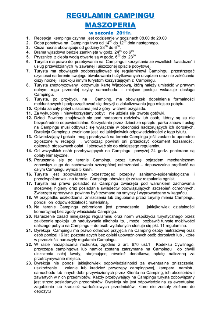 REGULAMIN CAMPINGU MASZOPERIA w sezonie 2011r. 1. 2. 3. 4. 5. 6. 7. 8. 9. 10. 11. 12. 13. 14. 15. 16. 17. 18. 19. 20. 21. 22. 23. Recepcja kempingu czynna jest codziennie w godzinach 08.00 do 20.00 Doba pobytowa na Campingu trwa od 1400 do 1200 dnia następnego. Cisza nocna obowiązuje od godziny 2300 do 600. Brama wjazdowa będzie zamknięta w godz. 2400 do 600 Prysznice z ciepła wodą otwarte są w godz. 600 do 2300 Turysta ma prawo do przebywania na Campingu i korzystania ze wszelkich świadczeń i usług przewidzianych w zawartej i uiszczonej opłacie pobytowej. Turysta ma obowiązek podporządkować się regulaminowi Campingu, przestrzegać czystości na terenie swojego biwakowania i użytkowanych urządzeń oraz nie zakłócania ciszy nocnej i spokoju innym turystom korzystającym z Campingu. Turysta zmotoryzowany otrzymuje Kartę Wjazdową, którą należy umieścić w prawym dolnym rogu przedniej szyby samochodu – miejsce postoju wskazuje obsługa Campingu. Turysta, po przybyciu na Camping, ma obowiązek dopełnienia formalności meldunkowych i podporządkować się decyzji o zlokalizowaniu jego miejsca pobytu. Opłata za cały pobyt uiszczana jest z góry w chwili przyjazdu. Za wykupiony i niewykorzystany pobyt nie udziela się zwrotu gotówki. Dzieci Powinny znajdować się pod nadzorem rodziców lub osób, którzy są za nie bezpośrednio odpowiedzialne. Korzystanie przez dzieci ze sprzętu, parku zabaw i usług na Campingu musi odbywać się wyłącznie w obecności nadzorujących ich dorosłych. Dyrekcja Campingu zwolniona jest od jakiejkolwiek odpowiedzialności z tego tytułu. Odwiedzający i goście mogą przebywać na terenie Campingu jeśli zostało to uprzednio zgłoszone w recepcji , wchodząc powinni oni przedłożyć dokument tożsamości, dokonać stosownych opłat i stosować się do niniejszego regulaminu. Od wszystkich osób przebywających na Campingu powyżej 24 godz. pobierane są opłaty klimatyczne. Poruszanie się po terenie Campingu przez turystę pojazdem mechanicznym zobowiązuje go do zachowania szczególnej ostrożności – dopuszczalna prędkość na całym Campingu wynosi 5 km/h. Turysta jest zobowiązany przestrzegać przepisy sanitarno-epidemiologiczne i przeciwpożarowe - na terenie Campingu obowiązuje zakaz rozpalania ognisk. Turysta ma prawo posiadać na Campingu zwierzęta pod warunkiem zachowania stosownej higieny oraz posiadania świadectw obowiązujących szczepień ochronnych. Zwierzęta agresywne powinny być trzymane na smyczy i wyprowadzane w kagańcu. W przypadku uszkodzenia, zniszczenia lub zagubienia przez turystę mienia Campingu, ponosi on odpowiedzialność materialną. Na terenie Campingu zabronione jest prowadzenie jakiejkolwiek działalności komercyjnej bez zgody właściciela Campingu. Naruszenie zasad niniejszego regulaminu oraz norm współżycia turystycznego przez zakłócenie spokoju lub nadużywania alkoholu itp. , może pozbawić turystę możliwości dalszego pobytu na Campingu – do osób wydalonych stosuje się pkt. 11 regulaminu. Dyrekcja Campingu ma prawo odmówić przyjęcia na Camping osoby nietrzeźwej oraz osób poniżej 16 lat pozostających bez opieki upoważnionych osób dorosłych lub , które w przeszłości naruszyły regulamin Campingu. W razie niezapłacenia rachunku, zgodnie z art. 670 ust.1 Kodeksu Cywilnego, przyczepa campingowa lub namiot zostaną zatrzymane na Campingu do chwili uiszczenia całej kwoty, obejmującej również dodatkową opłatę naliczoną za przetrzymywanie miejsca. Dyrekcja nie ponosi jakiejkolwiek odpowiedzialności za ewentualne zniszczenie, uszkodzenie , zalanie lub kradzież przyczepy campingowej, kampera, namiotu, samochodu lub innych dóbr przywiezionych przez Klienta na Camping, ich akcesoriów i zawartych w nich przedmiotów. Każdy przebywający na Campingu turysta zobowiązany jest strzec posiadanych przedmiotów. Dyrekcja nie jest odpowiedzialna za ewentualne zagubienie lub kradzież wartościowych przedmiotów, które nie zostały złożone do depozytu