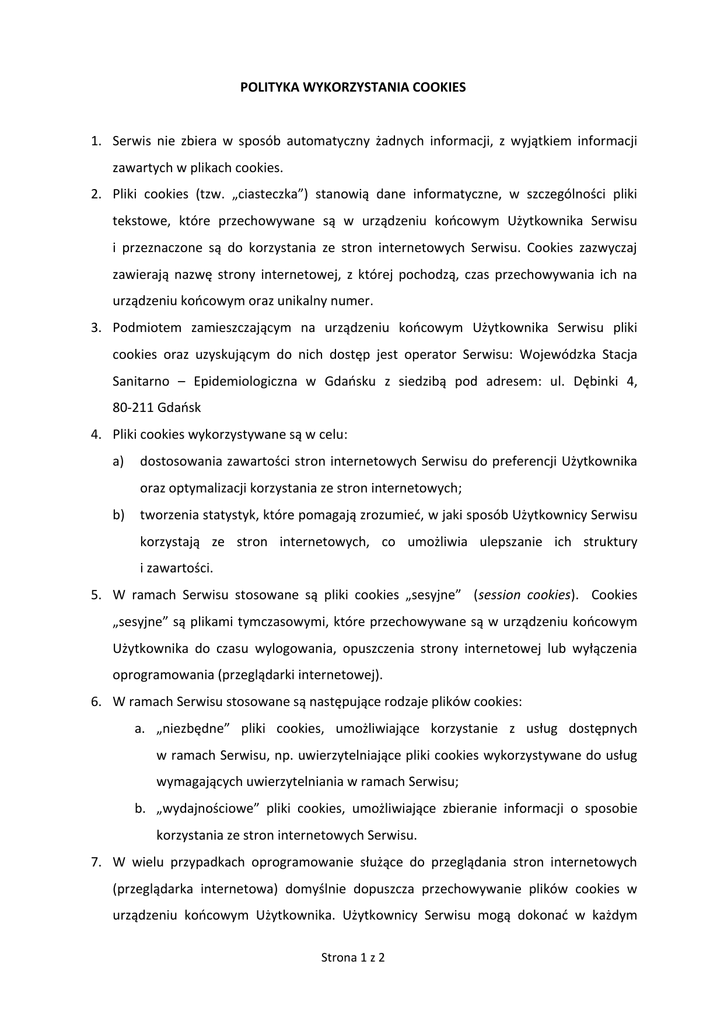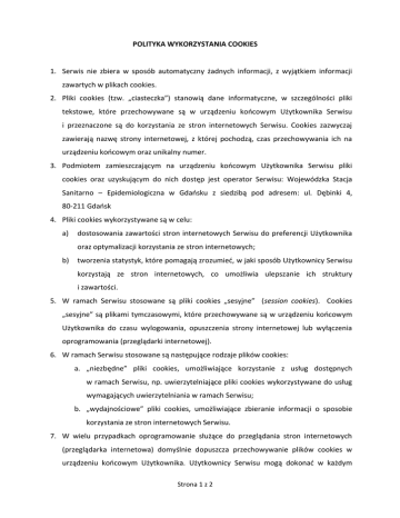 POLITYKA WYKORZYSTANIA COOKIES 1. Serwis nie zbiera w sposób automatyczny żadnych informacji, z wyjątkiem informacji zawartych w plikach cookies. 2. Pliki cookies (tzw. „ciasteczka”) stanowią dane informatyczne, w szczególności pliki tekstowe, które przechowywane są w urządzeniu końcowym Użytkownika Serwisu i przeznaczone są do korzystania ze stron internetowych Serwisu. Cookies zazwyczaj zawierają nazwę strony internetowej, z której pochodzą, czas przechowywania ich na urządzeniu końcowym oraz unikalny numer. 3. Podmiotem zamieszczającym na urządzeniu końcowym Użytkownika Serwisu pliki cookies oraz uzyskującym do nich dostęp jest operator Serwisu: Wojewódzka Stacja Sanitarno – Epidemiologiczna w Gdańsku z siedzibą pod adresem: ul. Dębinki 4, 80-211 Gdańsk 4. Pliki cookies wykorzystywane są w celu: a) dostosowania zawartości stron internetowych Serwisu do preferencji Użytkownika oraz optymalizacji korzystania ze stron internetowych; b) tworzenia statystyk, które pomagają zrozumieć, w jaki sposób Użytkownicy Serwisu korzystają ze stron internetowych, co umożliwia ulepszanie ich struktury i zawartości. 5. W ramach Serwisu stosowane są pliki cookies „sesyjne” (session cookies). Cookies „sesyjne” są plikami tymczasowymi, które przechowywane są w urządzeniu końcowym Użytkownika do czasu wylogowania, opuszczenia strony internetowej lub wyłączenia oprogramowania (przeglądarki internetowej). 6. W ramach Serwisu stosowane są następujące rodzaje plików cookies: a. „niezbędne” pliki cookies, umożliwiające korzystanie z usług dostępnych w ramach Serwisu, np. uwierzytelniające pliki cookies wykorzystywane do usług wymagających uwierzytelniania w ramach Serwisu; b. „wydajnościowe” pliki cookies, umożliwiające zbieranie informacji o sposobie korzystania ze stron internetowych Serwisu. 7. W wielu przypadkach oprogramowanie służące do przeglądania stron internetowych (przeglądarka internetowa) domyślnie dopuszcza przechowywanie plików cookies w urządzeniu końcowym Użytkownika. Użytkownicy Serwisu mogą dokonać w każdym Strona 1 z 2 czasie zmiany ustawień dotyczących plików cookies. Ustawienia te mogą zostać zmienione w szczególności w taki sposób, aby blokować automatyczną obsługę plików cookies w ustawieniach przeglądarki internetowej bądź informować o ich każdorazowym zamieszczeniu w urządzeniu Użytkownika Serwisu. Szczegółowe informacje o możliwości i sposobach obsługi plików cookies dostępne są w ustawieniach oprogramowania (przeglądarki internetowej). 8. Operator Serwisu informuje, że ograniczenia stosowania plików cookies mogą wpłynąć na niektóre funkcjonalności dostępne na stronach internetowych Serwisu. 9. Więcej informacji na temat plików cookies dostępnych jest w sekcji „Pomoc” w menu przeglądarki internetowej. Strona 2 z 2