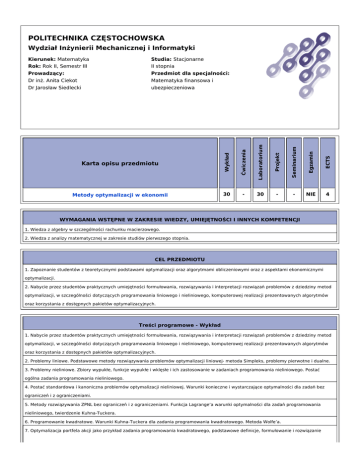 Metody optymalizacji w ekonomii - Wydział Inżynierii Mechanicznej i