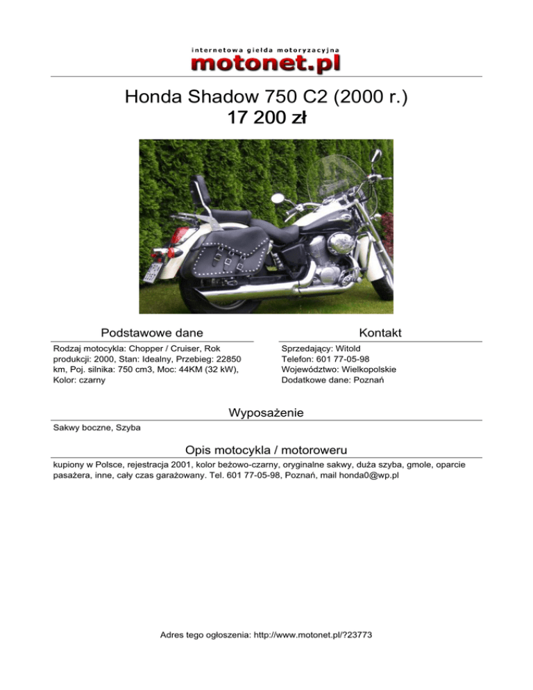 Honda Shadow 750 C2 (2000 r.) 17 200 zł Podstawowe dane Kontakt Rodzaj motocykla: Chopper / Cruiser, Rok produkcji: 2000, Stan: Idealny, Przebieg: 22850 km, Poj. silnika: 750 cm3, Moc: 44KM (32 kW), Kolor: czarny Sprzedający: Witold Telefon: 601 77-05-98 Województwo: Wielkopolskie Dodatkowe dane: Poznań Wyposażenie Sakwy boczne, Szyba Opis motocykla / motoroweru kupiony w Polsce, rejestracja 2001, kolor beżowo-czarny, oryginalne sakwy, duża szyba, gmole, oparcie pasażera, inne, cały czas garażowany. Tel. 601 77-05-98, Poznań, mail [email protected] Adres tego ogłoszenia: http://www.motonet.pl/?23773