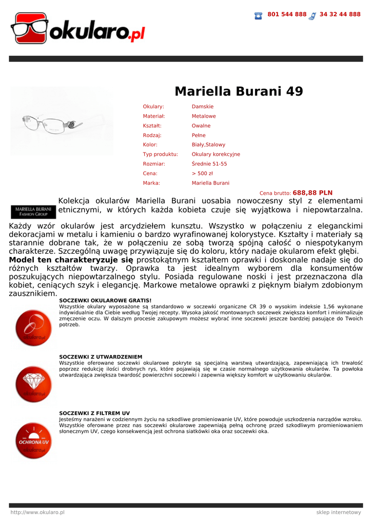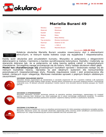801 544 888 34 32 44 888 Mariella Burani 49 Okulary: Damskie Materiał: Metalowe Kształt: Owalne Rodzaj: Pełne Kolor: Biały,Stalowy Typ produktu: Okulary korekcyjne Rozmiar: Średnie 51-55 Cena: > 500 zł Marka: Mariella Burani Cena brutto: 688,88 PLN Kolekcja okularów Mariella Burani uosabia nowoczesny styl z elementami etnicznymi, w których każda kobieta czuje się wyjątkowa i niepowtarzalna. Każdy wzór okularów jest arcydziełem kunsztu. Wszystko w połączeniu z eleganckimi dekoracjami w metalu i kamieniu o bardzo wyrafinowanej kolorystyce. Kształty i materiały są starannie dobrane tak, że w połączeniu ze sobą tworzą spójną całość o niespotykanym charakterze. Szczególną uwagę przywiązuje się do koloru, który nadaje okularom efekt głębi. Model ten charakteryzuje się prostokątnym kształtem oprawki i doskonale nadaje się do różnych kształtów twarzy. Oprawka ta jest idealnym wyborem dla konsumentów poszukujących niepowtarzalnego stylu. Posiada regulowane noski i jest przeznaczona dla kobiet, ceniących szyk i elegancję. Markowe metalowe oprawki z pięknym białym zdobionym zausznikiem. SOCZEWKI OKULAROWE GRATIS! Wszystkie okulary wyposażone są standardowo w soczewki organiczne CR 39 o wysokim indeksie 1,56 wykonane indywidualnie dla Ciebie według Twojej recepty. Wysoka jakość montowanych soczewek zwiększa komfort i minimalizuje zmęczenie oczu. W dalszym procesie zakupowym możesz wybrać inne soczewki jeszcze bardziej pasujące do Twoich potrzeb. SOCZEWKI Z UTWARDZENIEM Wszystkie oferowane soczewki okularowe pokryte są specjalną warstwą utwardzającą, zapewniającą ich trwałość poprzez redukcję ilości drobnych rys, które pojawiają się w czasie normalnego użytkowania okularów. Ta powłoka utwardzająca zwiększa twardość powierzchni soczewki i zapewnia większy komfort w użytkowaniu okularów. SOCZEWKI Z FILTREM UV Jesteśmy narażeni w codziennym życiu na szkodliwe promieniowanie UV, które powoduje uszkodzenia narządów wzroku. Wszystkie oferowane przez nas soczewki okularowe zapewniają pełną ochronę przed szkodliwym promieniowaniem słonecznym UV, czego konsekwencją jest ochrona siatkówki oka oraz soczewki oka. http://www.okularo.pl sklep internetowy 801 544 888 34 32 44 888 SOCZEWKI Z POWŁOKĄ ANTY-REFLEX Opcjonalnie do każdych soczewek można zastosować powłokę AR. Wysokiej jakości powłoka anty-refleksyjna eliminuje refleksy świetlne poprzez maksymalizację transmisji światła przez soczewkę, jednocześnie zapewniając czyste i ostre widzenie. Z naszą wysokiej jakości powłoką anty-refleksyjną Twoje soczewki zawsze będą przeźroczyste, pozwalając innym widzieć Twoje oczy, a nie refleksy świetlne. SOCZEWKI Z POLARYZACJĄ Zastosowane soczewki posiadają filtr polaryzacyjny, który redukuje odblaski i poprawia kontrast. Zdecydowanie podnosi komfort widzenia. Zadaniem soczewek polaryzacyjnych jest niedopuszczanie do zniekształceń obrazu czy oślepień wywoływanych przez różnego rodzaju odbicia światła słonecznego, odblaski i olśnienia. FLEX Okulary posiadają elastyczne zawiasy tzw. flexy w zausznikach, zwiększające odporność oprawki na uszkodzenia i zwiększające komfort użytkowania okularów. ETUI I MIKROFIBRA GRATIS! Do każdej zamówionej pary dołączony jest zestaw oryginalnych akcesoriów (markowe etui i ściereczkę z mikrofibry). Etui może różnić się od przedstawionego na zdjęciu ze względu na pojawiające się nowe modele etui u producentów. WYSYŁKA 24H Towar dostępny w naszym magazynie. Wysyłamy w ciągu 24h. W przypadku okularów korekcyjnych termin może ulec zmianie w zależności od wybranych soczewek okularowych. 100% SATYSFAKCJI Z ZAKUPU Dokładamy wszelkich starań aby satysfakcja z zakupów u nas była 100-procentowa! Dlatego do każdego zamówionego u nas towaru dajemy 10-dniową gwarancję satysfakcji. Gwarantujemy Ci możliwość rezygnacji z dokonanego zakupu bez podania przyczyny w ciągu 10 dni od daty odebrania przesyłki. Zwracany towar nie może być używany, opakowanie ani żaden inny element wyposażenia nie mogą nosić śladów użytkowania ani zniszczenia, powinien być kompletny i zwrócony w oryginalnym opakowaniu firmowym producenta wraz z wszelkimi dodatkami. Przed wysłaniem przesyłki należy skontaktować sie z działem obsługi klientów okularo.pl. WYSOKA JAKOŚĆ Wszystkie oferowane przez nas okulary wykonujemy w naszych profesjonalnie wyposażonych pracowniach optycznych. Na najwyższej jakości sprzęcie przez doświadczonych Mistrzów Optyki Okularowej. Każde wykonane okulary przechodzą dokładne testy jakości, przez co otrzymujesz od nas wysoki komfort widzenia i ochronę swojego wzroku. http://www.okularo.pl sklep internetowy 801 544 888 34 32 44 888 GWARANCJA 12 MIESIĘCY Zwracamy szczególną uwagę na jakość wykonując okulary na zamówienie zgodnie z Twoją receptą. Jeśli w okresie 1 roku od zakupu pojawią się jakiekolwiek wady w zakupionych okularach, będziemy je naprawiać lub wymieniać na nowe bez żadnych opłat. Wszystkie oferowane przez nas towary posiadają gwarancję producenta, dystrybutora lub sprzedawcy na okres co najmniej 12 miesięcy. 100% ORYGINAŁ Wszystkie oferowane przez nas produkty są fabrycznie nowe w oryginalnych opakowaniach z gwarancją jakości i oryginalności. PRZESYŁKA GRATIS! Zamawiając ten produkt nie płacisz za przesyłkę. ZESTAW DO PIELĘGNACJI OKULARÓW GRATIS! W prezencie otrzymujesz zestaw do pielęgnacji okularów o wartości 30zł! http://www.okularo.pl sklep internetowy