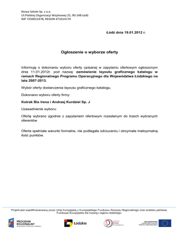 Nowa Szkoła Sp. z o.o. Ul.Polskiej Organizacji Wojskowej 25, 90-248 Łódź NIP 7250013378, REGON 471014170 Łódź dnia 19.01.2012 r. Ogłoszenie o wyborze oferty Informuję o dokonaniu wyboru oferty opisanej w zapytaniu ofertowym ogłoszonym dnia 11.01.2012r. pod nazwą: zamówienie layoutu graficznego katalogu w ramach Regionalnego Programu Operacyjnego dla Województwa Łódzkiego na lata 2007-2013. Wybór oferty dostarczenia layoutu graficznego katalogu. Dokonano wyboru oferty firmy: Kotrak Bis Irena i Andrzej Kurdziel Sp. J Uzasadnienie wyboru: Ofertę wybrano zgodnie z zapytaniem ofertowym rozesłanym do trzech wybranych oferentów Oferta spełniała warunki formalne, nie podlegała odrzuceniu i otrzymała maksymalną ilość punktów.