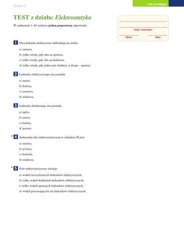Testy sprawdzajàce Grupa C TEST z działu: Elektrostatyka W zadaniach 1–16 wybierz jednà poprawnà odpowiedê. imi´ i nazwisko klasa 1 Dwa ładunki elektryczne oddziałujà na siebie: a) zawsze, b) tylko wtedy, gdy oba sà ujemne, c) tylko wtedy, gdy oba sà dodatnie, d) tylko wtedy, gdy jeden jest dodatni, a drugi – ujemny. 2 Ładunku elektrycznego nie posiada: a) anion, b) kation, c) neutron, d) elektron. 3 Ładunku dodatniego nie posiada: a) jàdro, b) anion, c) kation, d) proton. 4 Jednostkà siły elektrostatycznej w układzie SI jest: a) niuton, b) proton, c) kulomb, d) elektron. 5 Pole elektrostatyczne istnieje: a) wokół nieruchomych ładunków elektrycznych, b) tylko wokół dodatnich ładunków elektrycznych, c) tylko wokół ujemnych ładunków elektrycznych, d) wokół poruszajàcych si´ ładunków elektrycznych. data Testy sprawdzajàce 6 Grupa C Linie pola elektrostatycznego poprawnie przedstawia rysunek: c) b) a) d) 7 W wyniku pocierania szklanej pałeczki o jedwab pałeczka i jedwab elektryzujà si´ ró˝noimiennie. Oznacza to, ˝e: a) elektrony z jedwabiu przeszły na szklanà pałeczk´, b) ciepło zostaje przekształcone w ładunki elektryczne, c) jony dodatnie przeszły z jedwabiu na szklanà pałeczk´, d) elektrony ze szklanej pałeczki przemieÊciły si´ na jedwab. 8 Na ekranie telewizora szybko gromadzi si´ kurz. Jest to zjawisko podobne do: a) pocierania szklanej pałeczki o jedwab, b) przyciàgania przedmiotów metalowych przez magnes, c) przyciàgania skrawków papieru przez ciało naelektryzowane, d) elektryzowania si´ włosów podczas czesania plastikowym grzebieniem. 9 Niemo˝liwe jest elektryzowanie ciał przez: a) dotyk, b) indukcj´, c) pocieranie, d) uziemienie. 10 JeÊli kulka w górnej cz´Êci pr´ta elektroskopu jest naładowana ujemnie, to oznacza, ˝e: a) elektroskop uziemiono, b) do kulki elektroskopu zbli˝ono metalowy pr´t, c) do kulki elektroskopu zbli˝ono naelektryzowanà dodatnio szklanà pałeczk´, d) do kulki elektroskopu zbli˝ono naelektryzowanà ujemnie pałeczk´ ebonitowà. 11 JeÊli naelektryzowany ujemnie metal zostanie uziemiony, to: a) protony z ziemi dopłynà do metalu, b) z metalu odpłynie nadmiar elektronów, c) do metalu dopłynie pewna liczba jonów ujemnych, d) do metalu dopłynie pewna liczba jonów dodatnich. Testy sprawdzajàce Grupa C 12 Siła wzajemnego oddziaływania elektrostatycznego zale˝y: a) od masy naelektryzowanych ciał, b) od kształtu naelektryzowanych ciał, c) od odległoÊci mi´dzy naelektryzowanymi ciałami, d) od materiału, z jakiego zbudowane sà naelektryzowane ciała. 13 Je˝eli odległoÊç mi´dzy ciałami naelektryzowanymi wzroÊnie dwukrotnie, to siła oddziaływania mi´dzy nimi: a) zmaleje dwukrotnie, b) wzroÊnie dwukrotnie, c) zmaleje czterokrotnie, d) wzroÊnie czterokrotnie. 14 Elektroskop jest naelektryzowany ujemnie. Gdy zbli˝ysz do niego kulk´ naładowanà ujemnie, to listki elektroskopu: a) lekko opadnà, b) całkowicie opadnà, c) rozchylà si´ bardziej, d) nie zmienià wychylenia. 15 Kulki dwóch identycznych elektroskopów połàczono cienkim przewodem, co spowodowało, ˝e ich listki całkowicie opadły. Oznacza to, ˝e przed połàczeniem ładunki zgromadzone na elektroskopach były: a) jednakowego znaku i o ró˝nej wartoÊci, b) jednakowego znaku i o jednakowej wartoÊci, c) ró˝nego znaku i o ró˝nej wartoÊci bezwzgl´dnej, d) ró˝nego znaku i o jednakowej wartoÊci bezwzgl´dnej. 16 Pod wpływem pola elektrostatycznego wytworzonego przez ciało B ciała A i C naelektryzowały si´ dzi´ki indukcji. A B Z rozmieszczenia ładunków wynika, ˝e: a) oba ciała sà izolatorami, b) oba ciała sà przewodnikami, c) ciało A jest przewodnikiem, a ciało C – izolatorem, d) ciało A jest izolatorem, a ciało C – przewodnikiem. C Testy sprawdzajàce Grupa C 17 Dwie metalowe kule zawieszone na izolujàcych niciach naelektryzowano: pierwszà ładunkiem –2 C, a drugà +2 C. Kule zetkni´to, a nast´pnie rozsuni´to na takà samà odległoÊç. Oblicz, jak zmieniła si´ siła wzajemnego oddziaływania mi´dzy kulami. 18 Siła wzajemnego oddziaływania mi´dzy ciałami naelektryzowanymi wynosi 0,8 N. Czy wartoÊç siły ulegnie zmianie, je˝eli zwi´kszy si´ dwukrotnie ładunek jednego z ciał, a nast´pnie odsunie si´ te ciała na dwa razy wi´kszà odległoÊç? Odpowiedê uzasadnij, wykonujàc odpowiednie obliczenia.