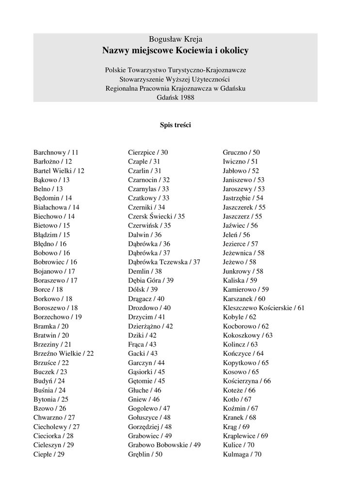 Bogusław Kreja Nazwy miejscowe Kociewia i okolicy Polskie Towarzystwo Turystyczno-Krajoznawcze Stowarzyszenie Wyższej Użyteczności Regionalna Pracownia Krajoznawcza w Gdańsku Gdańsk 1988 Spis treści Barchnowy / 11 Barłożno / 12 Bartel Wielki / 12 Bąkowo / 13 Belno / 13 Będomin / 14 Białachowa / 14 Biechowo / 14 Bietowo / 15 Błądzim / 15 Błędno / 16 Bobowo / 16 Bobrowiec / 16 Bojanowo / 17 Boraszewo / 17 Borce / 18 Borkowo / 18 Boroszewo / 18 Borzechowo / 19 Bramka / 20 Bratwin / 20 Brzeziny / 21 Brzeźno Wielkie / 22 Brzuśce / 22 Buczek / 23 Budyń / 24 Buśnia / 24 Bytonia / 25 Bzowo / 26 Chwarzno / 27 Ciecholewy / 27 Cieciorka / 28 Cieleszyn / 29 Ciepłe / 29 Cierzpice / 30 Czaple / 31 Czarlin / 31 Czarnocin / 32 Czarnylas / 33 Czatkowy / 33 Czerniki / 34 Czersk Świecki / 35 Czerwińsk / 35 Dalwin / 36 Dąbrówka / 36 Dąbrówka / 37 Dąbrówka Tczewska / 37 Demlin / 38 Dębia Góra / 39 Dólsk / 39 Drągacz / 40 Drozdowo / 40 Drzycim / 41 Dzierżążno / 42 Dziki / 42 Frąca / 43 Gacki / 43 Garczyn / 44 Gąsiorki / 45 Gętomie / 45 Głuche / 46 Gniew / 46 Gogolewo / 47 Gołuszyce / 48 Gorzędziej / 48 Grabowiec / 49 Grabowo Bobowskie / 49 Gręblin / 50 Gruczno / 50 Iwiczno / 51 Jabłowo / 52 Janiszewo / 53 Jaroszewy / 53 Jastrzębie / 54 Jaszczerek / 55 Jaszczerz / 55 Jaźwiec / 56 Jeleń / 56 Jezierce / 57 Jeżewnica / 58 Jeżewo / 58 Junkrowy / 58 Kaliska / 59 Kamierowo / 59 Karszanek / 60 Kleszczewo Kościerskie / 61 Kobyle / 62 Kocborowo / 62 Kokoszkowy / 63 Kolincz / 63 Kończyce / 64 Kopytkowo / 65 Kosowo / 65 Kościerzyna / 66 Koteże / 66 Kotło / 67 Koźmin / 67 Kranek / 68 Krąg / 69 Krąplewice / 69 Kulice / 70 Kulmaga / 70 Lalkowy / 71 Laskowice / 71 Leśna Jania / 72 Lignowy Szlacheckie / 72 Liniewo / 73 Linowiec / 74 Lipinki Królewskie / 74 Lipinki Szlacheckie / 75 Lipna / 75 Lniano / 76 Lubichowo / 76 Lubiszewo / 77 Lubodzież / 77 Łążek / 78 Łuby / 79 Malenin / 79 Małociechowo / 80 Małzewo / 80 Markocin / 81 Mermet / 82 Miedzno / 82 Mieliczki / 82 Mieścin / 83 Międzyłęż / 83 Miłobądz / 84 Miradowo / 85 Mirotki / 85 Miryce / 86 Młyńsk / 86 Morzeszczyn / 87 Mościska / 88 Mszano / 88 Mukrz / 88 Narkowy / 89 Niedźwiedź / 89 Nowa Wieś Rzeczna / 90 Nowe / 90 Obozin / 91 Ocypel / 92 Okarpiec / 92 Opalenie / 92 Osie / 93 Osieczna / 94 Osiek / 94 Osowo Leśne / 95 Ostrowite / 95 Owidz / 96 Pałubin / 96 Parlin / 97 Pazda / 98 Pączewo / 98 Pelplin / 99 Piaseczno / 100 Pieniążkowo / 100 Piesienica / 100 Pinczyn / 101 Piskarki / 101 Plewno / 102 Płochocin / 103 Płociczno / 103 Pogódki / 103 Pomyje / 104 Pruszcz / 105 Przechowo / 106 Przysiersk / 107 Radogoszcz / 107 Radostowo / 108 Radziejewo / 108 Rajkowy / 109 Rakocin / 110 Rudno / 110 Rukosin / 110 Rywałd / 111 Ryzowie / 112 Rzeżęcin / 112 Sartowice / 113 Semlin / 114 Siemkowo / 114 Sierosław / 115 Skarszewo / 116 Skarszewy / 117 Skórcz / 117 Smętowo Graniczne / 118 Smoląg / 118 Smolążek / 118 Smolniki / 119 Stanisławie / 120 Stara Jania / 121 Stara Kiszewa / 121 Starogard Gdański / 122 Stary Wiec / 123 Wysin / 124 Subkowy / 124 Suchobrzeźnica / 125 Sucumin / 125 Sulnowo / 126 Sumni / 127 Swarożyn / 127 Szczerbięcin / 128 Szpęgawsk / 129 Szteklin / 129 Śliwiny / 130 Świecie / 131 Świekatowo / 131 Taszewo / 132 Tczew / 133 Topolno / 134 Trzcińsk / 134 Trzebiechowo / 135 Turze / 135 Tymawa / 136 Udzierz / 137 Waćmierz / 138 Warlubie / 139 Wda / 139 Wędkowy / 139 Wiąg / 140 Widlice / 141 Wielbrandowo / 141 Wielgłowy / 142 Wielka Słońca / 142 Wielki Bukowiec / 143 Wielki Garc / 143 Wielki Komorsk / 144 Wielki Konopat / 145 Wielki Lubień / 146 Wielkie Walichnowy / 147 Wierzchy / 147 Więckowo / 148 Wolental / 148 Wysoka / 149 Zajączkowo / 149 Ząbrsko Górne / 150 Zblewo / 151 Zbrachlin / 151 Zelgoszcz / 152 Zła Wieś / 153 Żabno / 154 Uwagi końcowe / 155