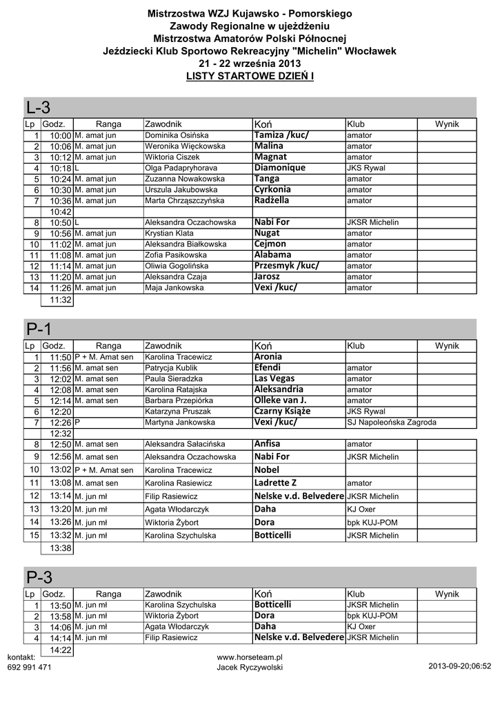 Mistrzostwa WZJ Kujawsko - Pomorskiego Zawody Regionalne w ujeżdżeniu Mistrzostwa Amatorów Polski Północnej Jeździecki Klub Sportowo Rekreacyjny "Michelin" Włocławek 21 - 22 września 2013 LISTY STARTOWE DZIEŃ I L-3 Lp Godz. 1 10:00 2 10:06 3 10:12 4 10:18 5 10:24 6 10:30 7 10:36 10:42 8 10:50 9 10:56 10 11:02 11 11:08 12 11:14 13 11:20 14 11:26 11:32 M. amat jun M. amat jun M. amat jun L M. amat jun M. amat jun M. amat jun Dominika Osińska Weronika Więckowska Wiktoria Ciszek Olga Padapryhorava Zuzanna Nowakowska Urszula Jakubowska Marta Chrząszczyńska Koń Tamiza /kuc/ Malina Magnat Diamonique Tanga Cyrkonia Radżella L M. amat jun M. amat jun M. amat jun M. amat jun M. amat jun M. amat jun Aleksandra Oczachowska Krystian Klata Aleksandra Białkowska Zofia Pasikowska Oliwia Gogolińska Aleksandra Czaja Maja Jankowska Nabi For Nugat Cejmon Alabama Przesmyk /kuc/ Jarosz Vexi /kuc/ JKSR Michelin amator amator amator amator amator amator Zawodnik Koń Aronia Efendi Las Vegas Aleksandria Olleke van J. Czarny Książe Vexi /kuc/ Klub Ranga Zawodnik Klub Wynik amator amator amator JKS Rywal amator amator amator P-1 Lp Godz. 1 11:50 2 11:56 3 12:02 4 12:08 5 12:14 6 12:20 7 12:26 12:32 8 12:50 9 12:56 10 11 12 13 14 15 Ranga P + M. Amat sen M. amat sen M. amat sen M. amat sen M. amat sen P Karolina Tracewicz Patrycja Kublik Paula Sieradzka Karolina Ratajska Barbara Przepiórka Katarzyna Pruszak Martyna Jankowska M. amat sen Aleksandra Sałacińska M. amat sen Aleksandra Oczachowska 13:02 P + M. Amat sen 13:08 M. amat sen Karolina Tracewicz 13:14 M. jun mł 13:20 M. jun mł Filip Rasiewicz 13:26 M. jun mł 13:32 M. jun mł 13:38 Wiktoria Żybort Karolina Rasiewicz Agata Włodarczyk Karolina Szychulska Wynik amator amator amator amator JKS Rywal SJ Napoleońska Zagroda Anfisa amator Nabi For JKSR Michelin Nobel Ladrette Z amator Nelske v.d. Belvedere JKSR Michelin Daha KJ Oxer Dora bpk KUJ-POM Botticelli JKSR Michelin P-3 Lp Godz. 1 13:50 2 13:58 3 14:06 4 14:14 14:22 kontakt: 692 991 471 Ranga M. jun mł M. jun mł M. jun mł M. jun mł Zawodnik Karolina Szychulska Wiktoria Żybort Agata Włodarczyk Filip Rasiewicz Klub Koń Botticelli JKSR Michelin Dora bpk KUJ-POM Daha KJ Oxer Nelske v.d. Belvedere JKSR Michelin www.horseteam.pl Jacek Ryczywolski Wynik 2013-09-20;06:52 P-2 cz.1 Lp Godz. 1 15:15 P 2 15:23 P 15:39 Ranga Zawodnik Karolina Tracewicz Alina Kłosowska Koń Nobel Malina Klub Koń Salerio Klub Koń Ares Watson Klub Koń Salerio Klub Koń Aronia Klub Wynik Koń Watson Willa Nova Eliot Eliot' Donnerwill Humaniska Konklawa P Alabama Klub Wynik Wynik JKSR Michelin N-6 Lp Godz. Ranga 1 15:40 M. jun Zawodnik Wiktoria Wiśniewska Wynik JKSR Michelin CC-1 Lp Godz. Ranga 1 15:50 CC 2 15:58 CC Zawodnik Karina Uszyńska Olga Padapryhorava Wynik SKJ Legia Kozielska JKS Rywal N-7 Lp Godz. Ranga 1 16:10 M. Jun Zawodnik Wiktoria Wiśniewska Wynik JKSR Michelin P-2 cz.2 Lp Godz. 1 16:20 P Ranga Zawodnik Karolina Tracewicz C-3 Lp Godz. 1 16:30 2 16:37 3 16:44 4 16:51 5 16:58 6 17:05 7 17:12 8 17:19 17:26 kontakt: 692 991 471 Ranga M. sen C M. sen M. sen C C C C Zawodnik Olga Padapryhorava Renata Michalska Zbigniew Bedliński Monika Wróblewska Olga Kulesza Grzegorz Mrozek Karolina Gogolińska Renata Michalska www.horseteam.pl Jacek Ryczywolski JKS Rywal JKSR Michelin bpk MAZ LKJ Arabika ŁKJ 2013-09-20;06:52