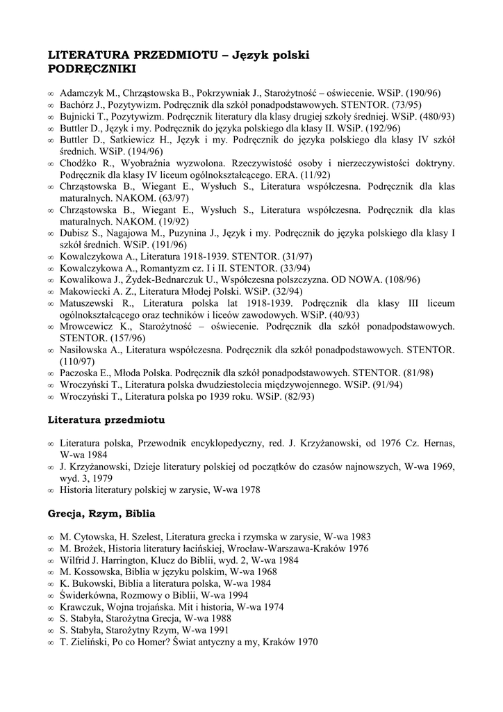 LITERATURA PRZEDMIOTU – Język polski PODRĘCZNIKI • • • • • • • • • • • • • • • • • • • Adamczyk M., Chrząstowska B., Pokrzywniak J., StaroŜytność – oświecenie. WSiP. (190/96) Bachórz J., Pozytywizm. Podręcznik dla szkół ponadpodstawowych. STENTOR. (73/95) Bujnicki T., Pozytywizm. Podręcznik literatury dla klasy drugiej szkoły średniej. WSiP. (480/93) Buttler D., Język i my. Podręcznik do języka polskiego dla klasy II. WSiP. (192/96) Buttler D., Satkiewicz H., Język i my. Podręcznik do języka polskiego dla klasy IV szkół średnich. WSiP. (194/96) Chodźko R., Wyobraźnia wyzwolona. Rzeczywistość osoby i nierzeczywistości doktryny. Podręcznik dla klasy IV liceum ogólnokształcącego. ERA. (11/92) Chrząstowska B., Wiegant E., Wysłuch S., Literatura współczesna. Podręcznik dla klas maturalnych. NAKOM. (63/97) Chrząstowska B., Wiegant E., Wysłuch S., Literatura współczesna. Podręcznik dla klas maturalnych. NAKOM. (19/92) Dubisz S., Nagajowa M., Puzynina J., Język i my. Podręcznik do języka polskiego dla klasy I szkół średnich. WSiP. (191/96) Kowalczykowa A., Literatura 1918-1939. STENTOR. (31/97) Kowalczykowa A., Romantyzm cz. I i II. STENTOR. (33/94) Kowalikowa J., śydek-Bednarczuk U., Współczesna polszczyzna. OD NOWA. (108/96) Makowiecki A. Z., Literatura Młodej Polski. WSiP. (32/94) Matuszewski R., Literatura polska lat 1918-1939. Podręcznik dla klasy III liceum ogólnokształcącego oraz techników i liceów zawodowych. WSiP. (40/93) Mrowcewicz K., StaroŜytność – oświecenie. Podręcznik dla szkół ponadpodstawowych. STENTOR. (157/96) Nasiłowska A., Literatura współczesna. Podręcznik dla szkół ponadpodstawowych. STENTOR. (110/97) Paczoska E., Młoda Polska. Podręcznik dla szkół ponadpodstawowych. STENTOR. (81/98) Wroczyński T., Literatura polska dwudziestolecia międzywojennego. WSiP. (91/94) Wroczyński T., Literatura polska po 1939 roku. WSiP. (82/93) Literatura przedmiotu • Literatura polska, Przewodnik encyklopedyczny, red. J. KrzyŜanowski, od 1976 Cz. Hernas, W-wa 1984 • J. KrzyŜanowski, Dzieje literatury polskiej od początków do czasów najnowszych, W-wa 1969, wyd. 3, 1979 • Historia literatury polskiej w zarysie, W-wa 1978 Grecja, Rzym, Biblia • • • • • • • • • • M. Cytowska, H. Szelest, Literatura grecka i rzymska w zarysie, W-wa 1983 M. BroŜek, Historia literatury łacińskiej, Wrocław-Warszawa-Kraków 1976 Wilfrid J. Harrington, Klucz do Biblii, wyd. 2, W-wa 1984 M. Kossowska, Biblia w języku polskim, W-wa 1968 K. Bukowski, Biblia a literatura polska, W-wa 1984 Świderkówna, Rozmowy o Biblii, W-wa 1994 Krawczuk, Wojna trojańska. Mit i historia, W-wa 1974 S. Stabyła, StaroŜytna Grecja, W-wa 1988 S. Stabyła, StaroŜytny Rzym, W-wa 1991 T. Zieliński, Po co Homer? Świat antyczny a my, Kraków 1970 Średniowiecze • • • • • • T. Witczak, Literatura średniowiecza, W-wa 1990 J. Starnawski, Średniowiecze, W-wa 1989 Guriewicz, Kategorie kultury średniowiecznej, W-wa 1976 J. Le Goff, Kultura średniowiecznej Europy, W-wa 1970 S. ŚwieŜawski, Rozum i tajemnica, Kraków 1960 J. Lewański, Dramat i teatr średniowiecza i renesansu w Polsce, W-wa 1981 Renesans • • • • • • J. Ziomek, Renesans, W-wa 1977 J. Ziomek, Literatura odrodzenia, W-wa 1987 Borowski, Renesans, W-wa 1992 J. Pelc, Renesans, W-wa 1992 J. Pelc, Jan Kochanowski. Szczyt renesansu w literaturze polskiej, W-wa 1980 J. Pelc, Renesans w literaturze polskiej w kontekście europejskim, W-wa 1988 Barok • • • • • • C. Hernas, Barok, wyd. 3, W-wa 1978 C. Hernas, Literatura baroku, W-wa 1987 T. Klaniczay, Renesans, manieryzm, barok, W-wa 1986 J. Sokołowska, Dwie nieskończoności. Szkice o literaturze barokowej Europy, W-wa 1978 J. Tazbir, Rzeczpospolita i świat. Studia z dziejów kultury XVII wieku, Wrocław 1971 W. Tomkiewicz, Sztuka baroku, W-wa 1972 Oświecenie • • M. Klimowicz, Literatura oświecenia, W-wa 1988 T. Kostkiewiczowa, Klasycyzm, sentymentalizm, rokoko. Szkice o prądach literackich polskiego oświecenia, W-wa 1975 • Z. Libera, Oświecenie, W-wa 1991 • Z. Libera, śycie literackie w Warszawie w czasach Stanisława Augusta, W-wa 1971 • J. T. Pokrzywniak, Ignacy Krasicki, W-wa 1992 Romantyzm • • • • • • • • • • • • J. Kulczyk-Saloni, M. Straszewska, Romantyzm. Pozytywizm, W-wa 1990 Witkowska, Literatura romantyzmu, W-wa 1986 Studia romantyczne, Wrocław 1973 M. Straszewska, Romantyzm, W-wa 1977 Kowalczykowa, Czym był romantyzm, W-wa 1990 Urbankowski, Myśl romantyczna, W-wa 1979 Witkowska, Wielcy romantycy polscy, Sylwetki. Mickiewicz. Słowacki. Krasiński. Norwid, W-wa 1980 M. Janion, M. śmigrodzka, Romantyzm i historia, W-wa 1978 M. Janion, Gorączka romantyczna, W-wa 1975 Problemy polskiego romantyzmu, Wrocław 1971 M. Piwińska, Miłość romantyczna, Kraków 1984 Kowalczykowa, Słowacki, W-wa 1994 Pozytywizm • • • • • • • • H. Markiewicz, Pozytywizm, W-wa 1978 L. Kołakowski, Filozofia pozytywistyczna, W-wa 1966 H. Markiewicz, Teoria powieści za granicą. Od początków do naturalizmu, W-wa 1992 T. Bujnicki, Sienkiewicz i historia, W-wa 1981 E. Jankowski, Eliza Orzeszkowa, W-wa 1963 Z. Szweykowski, Twórczość Bolesława Prusa, wyd. II, W-wa 1972 T. Tyszkiewicz, Bolesław Prus, W-wa 1971 J. Tomkowski, Mój pozytywizm, W-wa 1993 Młoda Polska • • • • • • A. Z. Makowiecki, Młoda Polska, W-wa 1987 M. Podraza-Kwiatkowska, Somnambulicy, dekadenci, herosi. Studia i eseje o literaturze Młodej Polski, Kraków 1986 M. Podraza-Kwiatkowska, Symbolizm i symbolika w poezji Młodej Polski, Kraków 1995 Hutnikiewicz, Stefan śeromski, W-wa 1987 M. Głowiński, Powieść młodopolska, Studium z poetyki historycznej, W-wa 1969 K. Wyka, Reymont, czyli ucieczka od Ŝycia, W-wa 1979 Dwudziestolecie międzywojenne • • • • • Hutnikiewicz, Od czystej formy do literatury faktu. G