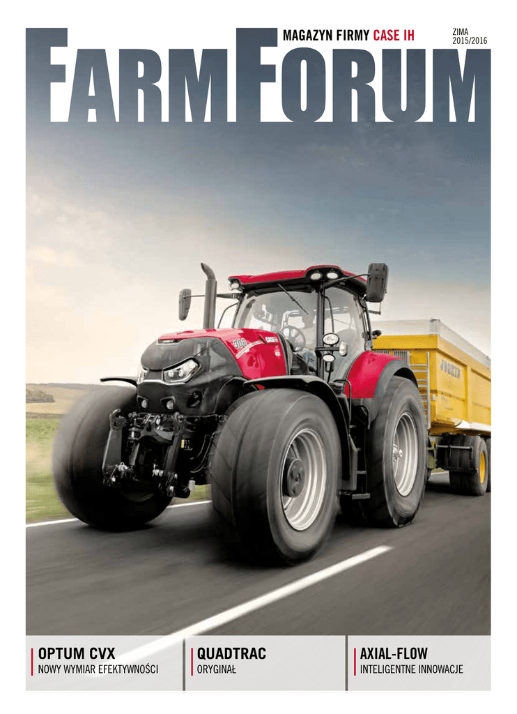 ZIMA MAGAZYN FIRMY CASE IH 2015/2016 OPTUM CVX NOWY WYMIAR EFEKTYWNOŚCI QUADTRAC ORYGINAŁ AXIAL-FLOW INTELIGENTNE INNOWACJE 1 ZAUFAJ TYLKO ORYGINAŁOWI SERIA QUADTRAC® Pierwsze ciągniki rolnicze z czterema gąsienicami wyjechały na pola dzięki marce Case IH już w 1997 r. Od tej pory bez ustanku doskonalimy technologię gąsienicową. Nasze legendarne ciągniki z serii Quadtrac wyposażono w cztery niezależne gąsienice oscylacyjne umieszczone na sprawdzonej konstrukcji dwuosiowej. Taka konstrukcja wprost stworzona dla rolnictwa zapewnia lepszą trakcję, doskonałą flotację, mniejsze ubijanie gleby i doskonałe ogólne właściwości jezdne. Dlatego jeśli pragniesz maksymalnej wydajności i doskonałych osiągów nawet w najtrudniejszych warunkach, właśnie znalazłeś rozwiązanie. Wybierz sprawdzonego lidera ciągników gąsienicowych marki Case IH. Zobacz różnicę na własne oczy u najbliższego dilera Case IH lub na stronie caseih.com. MACHINE OF THE YEAR 2014 2 www.caseih.com SPIS TREŚCI 03 Nota wydawcy NOTA WYDAWCY NARODZINY NOWEJ LEGENDY 04 Nowy Optum CVX ❙❙DRODZY CZYTELNICY FARMFORUM, 06 Nowy wymiar efektywności 08 Test wytrzymałości ciągnika Optum CVX 09 Optymalne rozwiązanie 10 Szybka droga do sukcesu - Farmall U Pro 11 Nowa apka AFS Academy 12 To gleba dyktuje warunki 14 Case IH na targach Agritechnica 2015 16 Modelowe rozwiązania - dr Reinhard Grandke (DLG) 17 Kompetencja - Lider w zakresie napędu gąsienicowego 18 Istotne udoskonalenia oryginału - Quadtrac 20 Sadzenie ziemniaków bez niszczenia gleby Quadtrac to potrafi! 22 Jaki siew, taki plon - AFS 24 Znacznie więcej niż jakieś tam udoskonalenia - Axial-Flow 2016 26Farmlift 27 Z inauguracyjną wizytą - Puma CVX 28 Rynek premiuje najlepszych - Andreas Klauser 29 Wyśmienite wyniki dzięki pracy zespołowej srebro WCM dla St. Valentin 30 Rosnąca popularność kombajnów Axial-Flow wśród firm usługowych 32 Zwycięska walka z wilgotnością gleby i wahaniami plonów poprzeczka została zawieszona naprawdę wysoko: Motto „Narodziny nowej legendy" towarzyszy wprowadzeniu na rynek Optum CVX, kompletnie nowej serii ciągników marki Case IH, zaprojektowanych i wyprodukowanych w St. Valentin w Austrii. W tym wydaniu FarmForum odsłonimy tajemnice nowego członka naszej rodziny. Minęło już ponad 170 lat od kiedy Jerome Increase Case zaprojektował i wybudował w Racine w stanie Wisconsin (USA) pierwsze maszyny żniwne. Jego wiedza praktyczna, dzięki której tworzył on rozwiązania pozwalające na wzrost wydajności w pracy, a przede wszystkim jej ułatwienie, była jedną z jego licznych zalet i źródłem inspiracji. Od tamtych czasów cechą charakterystyczną podejścia firmy Case IH jest priorytetowe traktowanie praktycznych potrzeb i wymogów. W końcu maszyny i pojazdy, które powstały w głowach projektantów i wyprodukowane zostały w fabryce są warte tyle, na ile zdadzą egzamin praktyczny na polu. Dlatego tak ważne są informacje zwrotne, które otrzymujemy bezpośrednio od naszych klientów lub od naszych koncesjonariuszy, będących dla nas wzrokiem i słuchem. Te informacje zwrotne są nieodzowne, abyśmy byli w stanie nieustannie opracowywać nowe, innowacyjne, wydajne i niezawodne rozwiązania, wychodzące naprzeciw coraz to bardziej wymagającej branży rolniczej. W przypadku zaprezentowanej w tym numerze serii ciągników Optum CVX, korzystaliśmy z opinii naszych klientów w większym zakresie niż w przeszłości i to od samego początku. Za pomocą obszernych i szczegółowych ankiet rejestrowaliśmy doświadczenia, oczekiwania oraz życzenia potencjalnych użytkowników. Potem zebraliśmy doświadczenia, oczekiwania i życzenia rolników, których pewne grono korzystało ciągle z innych maszyn i przełożyliśmy tę wiedzę na wytyczne i docelowe parametry, które nasi inżynierowie wprowadzili w życie. Jestem przekonany, że nowe ciągniki Optum CVX z nawiązką przekroczą pokładane w nich oczekiwania! Bez żadnej przesady mogę stwierdzić, że nasza aktualna oferta produktowa jest bogatsza i obejmuje najbardziej wydajne i innowacyjne maszyny w naszej historii. Choć ciągnik Optum CVX zajmuje honorowe miejsce w niniejszym tekście, to zachęcamy serdecznie do zapoznania się z innymi wyśmienitymi produktami i raportami zawartymi na kolejnych stronach. Życzę przyjemnej lektury! Z poważaniem, 33 Idealne ciągniki dla firm świadczących usługi dla rolnictwa 34 Unikalna trakcja i efektywność NOTA PRAWNA FarmForum zawiera informacje o produktach marki Case IH, trendach w branży rolniczej oraz raporty z doświadczeń praktycznych i ma na celu pomóc czytelnikom odnosić sukcesy przy prowadzeniu gospodarstwa rolnego. Wydawca: CNH Industrial Österreich GmbH, Steyrer Strasse 32, 4300 St. Valentin, Austria. Numer zimowy 2015/2016 Stefan Bogner Dyrektor handlowy niemieckiego oddziału firmy Case IH 3 FUNKCJONALNA KONSTRUKCJA ORAZ WYSOKA WYDAJNOŚĆ NOWY OPTUM CVX ❙❙PRZEBOJOWE TRIO: KONSTRUKCJA, FUNKCJONALNOŚĆ I WYDAJNOŚĆ! Oprócz atrakcyjnego wyglądu spośród grona innowacyjnych cech konstrukcyjnych ciągnika Optum CVX, które wnoszą największy wkład w wydajność nowej serii ciągników, można wymienić stosunkową niską masę podstawową maszyny, osiągniętą dzięki jej konstrukcji, która pozwala ograniczyć w dużym stopniu ubijanie ziemi przez ciągnik i pozwala chronić podłoże. Połączenie niskiej masy i kompaktowych gabarytów pozwala wykorzystać pełną moc silnika i korzystać z jego osiągów podczas transportu drogowego. Swoją fantastyczną niezawodność nawet przy długim czasie pracy model Optum CVX zawdzięcza wytrzymałej konstrukcji oraz zastosowanym podzespołom. Przebojowe trio stworzone przez konstrukcję, funkcjonalność i wydajność odcisnęło silne pięto zwłaszcza na nowej konstrukcji bloku silnika oraz miski olejowej, która stała się elementem ramy nośnej ciągnika. Taka konstrukcja pozwoliła zredukować o