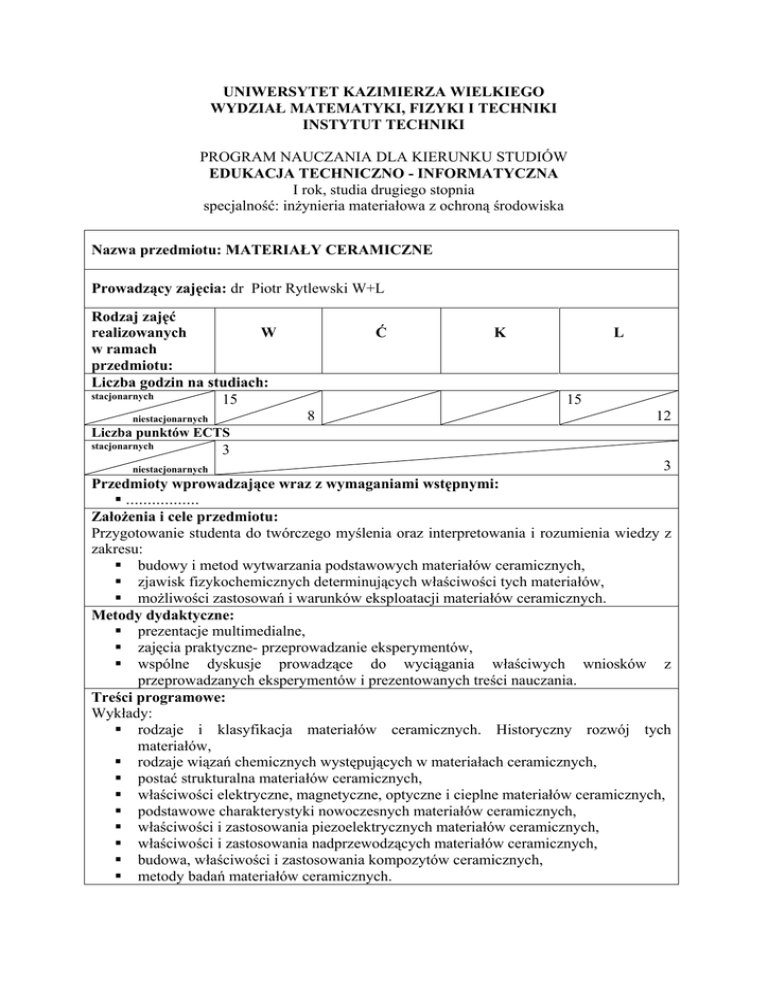 UNIWERSYTET KAZIMIERZA WIELKIEGO WYDZIAŁ MATEMATYKI, FIZYKI I TECHNIKI INSTYTUT TECHNIKI PROGRAM NAUCZANIA DLA KIERUNKU STUDIÓW EDUKACJA TECHNICZNO - INFORMATYCZNA I rok, studia drugiego stopnia specjalność: inżynieria materiałowa z ochroną środowiska Nazwa przedmiotu: MATERIAŁY CERAMICZNE Prowadzący zajęcia: dr Piotr Rytlewski W+L Rodzaj zajęć realizowanych W w ramach przedmiotu: Liczba godzin na studiach: stacjonarnych 15 Ć L 15 8 niestacjonarnych K 12 Liczba punktów ECTS stacjonarnych niestacjonarnych 3 3 Przedmioty wprowadzające wraz z wymaganiami wstępnymi: ................. Założenia i cele przedmiotu: Przygotowanie studenta do twórczego myślenia oraz interpretowania i rozumienia wiedzy z zakresu: budowy i metod wytwarzania podstawowych materiałów ceramicznych, zjawisk fizykochemicznych determinujących właściwości tych materiałów, możliwości zastosowań i warunków eksploatacji materiałów ceramicznych. Metody dydaktyczne: prezentacje multimedialne, zajęcia praktyczne- przeprowadzanie eksperymentów, wspólne dyskusje prowadzące do wyciągania właściwych wniosków z przeprowadzanych eksperymentów i prezentowanych treści nauczania. Treści programowe: Wykłady: rodzaje i klasyfikacja materiałów ceramicznych. Historyczny rozwój tych materiałów, rodzaje wiązań chemicznych występujących w materiałach ceramicznych, postać strukturalna materiałów ceramicznych, właściwości elektryczne, magnetyczne, optyczne i cieplne materiałów ceramicznych, podstawowe charakterystyki nowoczesnych materiałów ceramicznych, właściwości i zastosowania piezoelektrycznych materiałów ceramicznych, właściwości i zastosowania nadprzewodzących materiałów ceramicznych, budowa, właściwości i zastosowania kompozytów ceramicznych, metody badań materiałów ceramicznych. Laboratoria lub konwersatoria: wytwarzanie próbek ceramicznych w formie wypieków ceramicznych sporządzonych z mieszanin gliny i piasku. Próbki te stanowić będą przedmiot badań przeprowadzanych na kolejnych zajęciach, badania udarności wypieków ceramicznych, badania twardości wypieków ceramicznych, badania właściwości powierzchniowych wypieków ceramicznych metodą umieszczenia pęcherzyka powietrza na powierzchni próbki zanurzonej w cieczy. wytwarzanie próbek ceramicznych w formie odlewów gipsowych oraz badanie zmian temperatury sporządzanych zaczynów gipsowych. Próbki te stanowić będą przedmiot badań przeprowadzanych na kolejnych zajęciach, badania udarności odlewów gipsowych, badania twardości odlewów gipsowych, badania właściwości powierzchniowych odlewów gipsowych metodą umieszczenia pęcherzyka powietrza na powierzchni próbki zanurzonej w cieczy, dyskusja na temat prezentowanych multimedialnie eksperymentów, w których określane są wybrane właściwości materiałów ceramicznych, rozwiązywanie zadań rachunkowych z zakresu podstaw fizykochemii ciała stałego. Efekty kształcenia – umiejętności i kompetencje: prowadzanie badań wybranych właściwości materiałów ceramicznych, wykonywanie krytycznych analiz otrzymywanych wyników badań, szeroka wiedza z zakresu materiałoznawstwa ceramicznego i kompozytowego, pozwalająca na rozwiązywanie problemów występujących w inżynierskim projektowaniu materiałowym. LITERATURA: Podstawowa: Pampuch R.: „Materiały ceramiczne: Tworzywa nie tylko z wypalanej gliny”, PAN, Kraków 1996. Ashby M.F., Jones D.R.H.: „Materiały inżynierskie”, WNT, Warszawa 1996. Ashby M.F.: „Dobór materiałów w projektowaniu inżynierskim”, WNT, Warszawa 1996. Blicharski M.: „Wstęp do inżynierii materiałowej”, WNT, Warszawa 2001. Przybyłowicz K., Przybyłowicz J.: „Repetytorium z materiałoznawstwa”, Wyd. Pol. Świętokrzyskiej, Kielce1996. Uzupełniająca: Pampuch R.: „Współczesne materiały ceramiczne”, AGH UWND, Kraków 2005 Dobrzański L.A.: „Podstawy nauki o materiałach i metaloznawstwo”, WNT, Warszawa 2002. Celiński Z.: „Materiałoznawstwo elektrotechniczne”, OWPW, Warszawa 1998. Boczkowska A., Kapuściński J., Lindemann Z., Witemberg-Perzyk D., Wojciechowski S.: „Kompozyty”, OWPW, Warszawa 2003. Melegati L.: „Ceramika”, Arkady, Warszawa 1997. FORMA I WARUNKI ZALICZENIA PRZEDMIOTU: aktywne uczestnictwo w zajęciach i opanowanie omawianych treści, samodzielne opracowanie wyników badań eksperymentalnych, pozytywnie zdany egzamin.