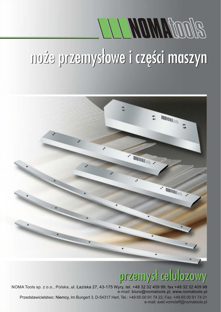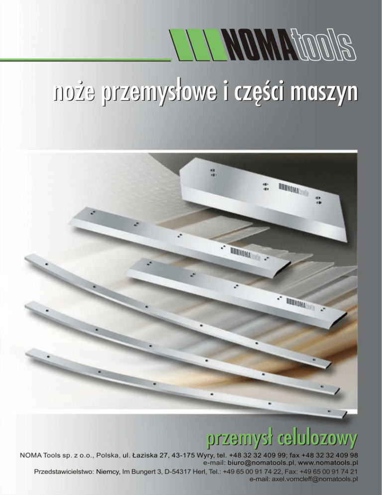 noże przemysłowe i części maszyn przemysł celulozowy NOMA Tools sp. z o.o., Polska, ul. Łaziska 27, 43-175 Wyry, tel. +48 32 32 409 99; fax +48 32 32 409 98 e-mail: [email protected], www.nomatools.pl Przedstawicielstwo: Niemcy, Im Bungert 3, D-54317 Herl, Tel.: +49 65 00 91 74 22, Fax: +49 65 00 91 74 21 e-mail: [email protected] Noże maszynowe dla przemysłu celulozowo-papierniczego NOMA Tools produkuje noże maszynowe i inne części do maszyn używanych w przemyśle papierniczym. Oferujemy optymalny dobór kąta ostrza i gatunku stali do rodzaju ciętego materiału. Wieloetapowa kontrola jakości gwarantuje dotrzymanie żądanych parametrów i długą żywotność naszych wyrobów. Produkujemy między innymi: 9 9 9 9 9 9 9 9 9 9 9 9 9 9 noże introligatorskie noże gilotynowe do papieru noże poligraficzne noże wzdłużne trójnoże noże do krajarek noże do gilotyn listwy mocujące noże przekrawacza noże do maszyn produkujących zrębki noże szarpacza kory noże rozdrabniające przeciwnoże podkładki nożowe Jeżeli jesteście Państwo zainteresowani szczegółami naszej oferty prosimy o kontakt lub przysłanie zapytania ofertowego zawierającego rysunek wyrobu, ilość oraz wszelkie informacje, które uznacie za istotne, a które pozwolą nam przygotować najlepszą ofertę. Kontakt: Dział Sprzedaży i Marketingu Tel.: +48 32 32 409 99 Fax: +48 32 32 409 98 e‐mail: [email protected] Przemysł celulozowo-paperniczy Przemysł celulozowo-papierniczy / Przemysł poligraficzny i opakowań Produkujemy noże przemysłowe i inne części linii produkcyjnych i maszyn większości występujących na rynku producentów, w tym głównie: Camura Jegenberg Uchida Inne noże i części zamienne wg indywidualnych potrzeb klientów. Przemysł celulozowo-papierniczy Przemysł celulozowo-papierniczy / Przemysł poligraficzny i opakowań Produkujemy noże maszynowe i inne części głównie do następujących krajarek: Maxima Polar Warta BRP Wohlenberg Krokodyl Perfecta Inne noże i części zamienne wg indywidualnych potrzeb klientów.