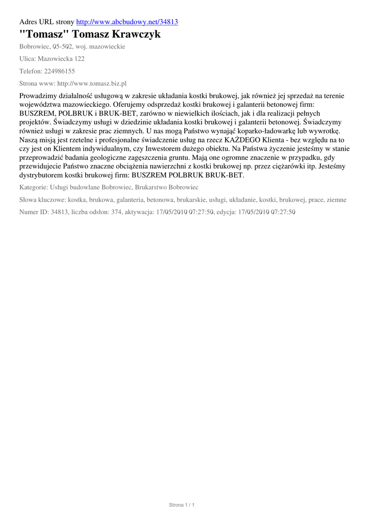 Adres URL strony http://www.abcbudowy.net/34813 "Tomasz" Tomasz Krawczyk Bobrowiec, 05-502, woj. mazowieckie Ulica: Mazowiecka 122 Telefon: 224986155 Strona www: http://www.tomasz.biz.pl Prowadzimy działalność usługową w zakresie układania kostki brukowej, jak również jej sprzedaż na terenie województwa mazowieckiego. Oferujemy odsprzedaż kostki brukowej i galanterii betonowej firm: BUSZREM, POLBRUK i BRUK-BET, zarówno w niewielkich ilościach, jak i dla realizacji pełnych projektów. Świadczymy usługi w dziedzinie układania kostki brukowej i galanterii betonowej. Świadczymy również usługi w zakresie prac ziemnych. U nas mogą Państwo wynająć koparko-ładowarkę lub wywrotkę. Naszą misją jest rzetelne i profesjonalne świadczenie usług na rzecz KAŻDEGO Klienta - bez względu na to czy jest on Klientem indywidualnym, czy Inwestorem dużego obiektu. Na Państwa życzenie jesteśmy w stanie przeprowadzić badania geologiczne zagęszczenia gruntu. Mają one ogromne znaczenie w przypadku, gdy przewidujecie Państwo znaczne obciążenia nawierzchni z kostki brukowej np. przez ciężarówki itp. Jesteśmy dystrybutorem kostki brukowej firm: BUSZREM POLBRUK BRUK-BET. Kategorie: Usługi budowlane Bobrowiec, Brukarstwo Bobrowiec Słowa kluczowe: kostka, brukowa, galanteria, betonowa, brukarskie, usługi, układanie, kostki, brukowej, prace, ziemne Numer ID: 34813, liczba odsłon: 374, aktywacja: 17/05/2010 07:27:50, edycja: 17/05/2010 07:27:50 Strona 1 / 1