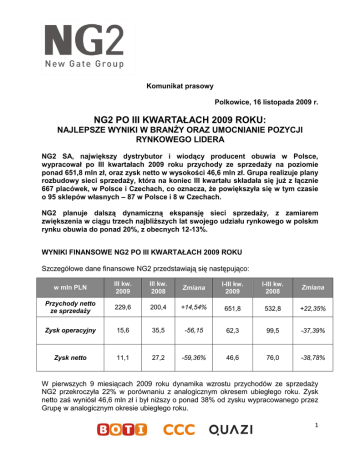 Komunikat prasowy Polkowice, 16 listopada 2009 r. NG2 PO III KWARTAŁACH 2009 ROKU: NAJLEPSZE WYNIKI W BRANŻY ORAZ UMOCNIANIE POZYCJI RYNKOWEGO LIDERA NG2 SA, największy dystrybutor i wiodący producent obuwia w Polsce, wypracował po III kwartałach 2009 roku przychody ze sprzedaży na poziomie ponad 651,8 mln zł, oraz zysk netto w wysokości 46,6 mln zł. Grupa realizuje plany rozbudowy sieci sprzedaży, która na koniec III kwartału składała się już z łącznie 667 placówek, w Polsce i Czechach, co oznacza, że powiększyła się w tym czasie o 95 sklepów własnych – 87 w Polsce i 8 w Czechach. NG2 planuje dalszą dynamiczną ekspansję sieci sprzedaży, z zamiarem zwiększenia w ciągu trzech najbliższych lat swojego udziału rynkowego w polskm rynku obuwia do ponad 20%, z obecnych 12-13%. WYNIKI FINANSOWE NG2 PO III KWARTAŁACH 2009 ROKU Szczegółowe dane finansowe NG2 przedstawiają się następująco: w mln PLN III kw. 2009 III kw. 2008 Zmiana I-III kw. 2009 I-III kw. 2008 Zmiana Przychody netto ze sprzedaży 229,6 200,4 +14,54% 651,8 532,8 +22,35% Zysk operacyjny 15,6 35,5 -56,15 62,3 99,5 -37,39% Zysk netto 11,1 27,2 -59,36% 46,6 76,0 -38,78% W pierwszych 9 miesiącach 2009 roku dynamika wzrostu przychodów ze sprzedaży NG2 przekroczyła 22% w porównaniu z analogicznym okresem ubiegłego roku. Zysk netto zaś wyniósł 46,6 mln zł i był niższy o ponad 38% od zysku wypracowanego przez Grupę w analogicznym okresie ubiegłego roku. 1 Na wyniki finansowe w trzecim kwartale wpływ miały przede wszystkim niesprzyjające warunków zewnętrzne, zarówno makroekonomiczne jak i atmosferyczne. Ciepły wrzesień spowodował, że popyt na produkty Grupy przesunął się i istotna część przychodów oraz marży została zrealizowana dopiero w październiku. W efekcie październikowe przychody Grupy osiągnęły rekordową w dotychczasowej historii NG2 wartość 139,1 mln zł i były wyższe od ubiegłorocznych aż o 43,3%. W ciągu pierwszych 9 miesięcy 2009 roku NG2 notuje systematyczny wzrost sprzedaży na porównywalnych sklepach: CCC: +3,3% BOTI: +7,7% QUAZI: +4,8%. Dzięki bardzo dobrym wynikom sprzedaży w pierwszej połowie czwartego kwartału parametry te kształtują się na dzień 12 listopada następująco: CCC: +8,2% BOTI: +9,6% QUAZI: +13,2%. ROZWÓJ SIECI SPRZEDAŻY Sieć sprzedaży NG2 na koniec III kwartału 2009 roku obejmowała łącznie 667 placówek, w tym 523 sklepy własne: 236 salonów CCC w Polsce i 33 w Czechach, 210 salonów BOTI oraz 44 butiki QUAZI. Spółka planuje dalszy dynamiczny rozwój sieci sprzedaży, szczególnie własnych sklepów firmowych. W roku 2009 Spółka planuje w sumie otwarcie co najmniej 132 placówek, tj: 45 sklepów pod logo CCC (32 w Polsce, 13 w Czechach) 12 butików QUAZI 75 sklepów BOTI. Z wymienionych powyżej otwarć po trzech kwartałach 95 placówek zostało już otwartych w pierwszych 9 miesiącach 2009 roku. NG2 planuje także przejęcie w 2009 roku 19 sklepów franszyzowych od dwóch dużych partnerów z regionu Poznania i Krakowa. W 2010 Grupa planuje otwarcie kolejnych co najmniej 80 sklepów: 30 sklepów pod logo CCC (20 w Polsce, 10 w Czechach) 10 butików QUAZI 40 sklepów BOTI. 2 Docelowo NG2 planuje posiadać około 1000 sklepów w Polsce, czyli 400 lokali CCC (w tym 100 franszyzowych) oraz 500 sklepów marką BOTI (w tym 100 franszyzowych). Sieć salonów QUAZI docelowo ma składać się ze 100 sklepów. W Czechach Grupa planuje rozszerzyć swoją sieć do 70 salonów CCC. Liczba sklepów grupy NG2 Liczba sklepów Stan na 30 czerwca 2009 Stan na 30 września 2009 CCC Polska – salony własne 237 236 CCC Polska – franszyza 82 79 CCC Czechy 32 33 QUAZI 41 44 BOTI 257 (181 – sklepy własne, 76 franszyzowe) 275 (210 – sklepy własne, 65 franszyzowe) Łączna liczba placówek 649 667 NG2 W OBLICZU SPOWOLNIENIA GOSPODARCZEGO NG2 zanotowała najlepsze w branży wyniki finansowe za III kwartał 2009 roku, pomimo widocznego na rynku detalicznym kryzysu, co potwierdza, że przyjęta przez Spółkę strategia przynosi rezultaty. Grupa charakteryzuje się ścisłą kontrolą kosztów, niskim poziomem zadłużenia, co gwarantuje niskie koszty odsetkowe i olbrzymie możliwości dalszego rozwoju. Dodatkowo wysoki kapitał własny i bardzo wysoka rentowność gwarantują bezpieczeństwo działania. 3 Przed kryzysem na rynkach światowych NG2 broni konserwatywne zarządzanie i oparcie strategii o rozwój organiczny i rynek krajowy. Spółka wdraża programy oszczędnościowe, m.in. zamykając nierentowne lokalizacje, nie rezygnując jednocześnie z działań reklamowych i marketingowych budujących świadomość marki. a także inwestując w specjalistyczne systemy informatyczne oraz automatyzację procesów, m.in. automatykę magazynową, która będzie dostosowana do dynamicznie zwiększającej się sieci sprzedaży zarządzanej przez NG2. W efekcie, Spółka zamierza wykorzystać obecną sytuację rynkową do zwiększenia swoich udziałów rynkowych z obecnych 12-13% do ponad 20% w ciągu najbliższych trzech lat. Celem strategicznym Grupy pozostaje m.in. dwucyfrowy wzrost sprzedaży na sklepach porównywalnych. PLANY INWESTYCYJNE NG2 I PODSUMOWANIE NADZWYCZAJNEGO WALNEGO ZGROMADZENIA AKCJONARIUSZY W dniu 12 listopada 2009 odbyło się NWZA, które wyraziło zgodę na zmiany w statucie spółki i umożliwiło dokonanie jednej lub wielu emisji akcji w ramach podwyższenia kapitału zakładowego, które może być dokonane w czasie najbliższych 3 lat. Każda emisja akcji będzie wymagała zgody Rady Nadzorczej, a maksymalnie NG2 może wyemitować do 10% kapitału, czyli 3 840 000 akcji. Zarząd zwrócił się do Akcjonariuszy z wnioskiem o zatwierdzenie zmian w statucie kierując się chęcią minimalizacji ryzyka braku pozyskania środków na rynku finansowym. Środki z potencjalnych emisji mogą posłużyć na częściowe sfinansowanie planowanych inwestycji. Spółka zamierza w ciągu najbliższych dwóc