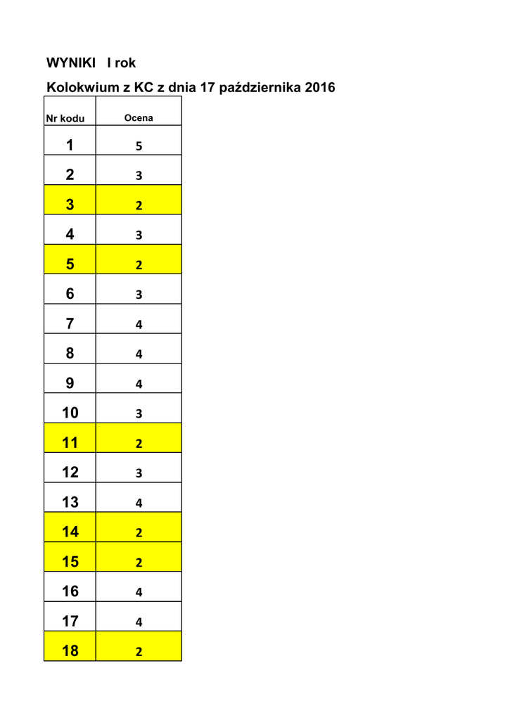 WYNIKI I rok Kolokwium z KC z dnia 17 października 2016 5 3 2 3 2