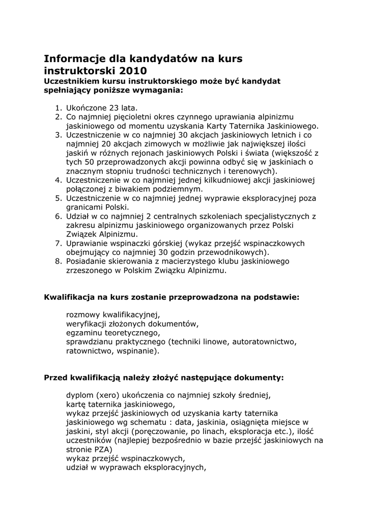 Informacje dla kandydatów na kurs instruktorski 2010 Uczestnikiem kursu instruktorskiego może być kandydat spełniający poniższe wymagania: 1. Ukończone 23 lata. 2. Co najmniej pięcioletni okres czynnego uprawiania alpinizmu jaskiniowego od momentu uzyskania Karty Taternika Jaskiniowego. 3. Uczestniczenie w co najmniej 30 akcjach jaskiniowych letnich i co najmniej 20 akcjach zimowych w możliwie jak największej ilości jaskiń w różnych rejonach jaskiniowych Polski i świata (większość z tych 50 przeprowadzonych akcji powinna odbyć się w jaskiniach o znacznym stopniu trudności technicznych i terenowych). 4. Uczestniczenie w co najmniej jednej kilkudniowej akcji jaskiniowej połączonej z biwakiem podziemnym. 5. Uczestniczenie w co najmniej jednej wyprawie eksploracyjnej poza granicami Polski. 6. Udział w co najmniej 2 centralnych szkoleniach specjalistycznych z zakresu alpinizmu jaskiniowego organizowanych przez Polski Związek Alpinizmu. 7. Uprawianie wspinaczki górskiej (wykaz przejść wspinaczkowych obejmujący co najmniej 30 godzin przewodnikowych). 8. Posiadanie skierowania z macierzystego klubu jaskiniowego zrzeszonego w Polskim Związku Alpinizmu. Kwalifikacja na kurs zostanie przeprowadzona na podstawie: rozmowy kwalifikacyjnej, weryfikacji złożonych dokumentów, egzaminu teoretycznego, sprawdzianu praktycznego (techniki linowe, autoratownictwo, ratownictwo, wspinanie). Przed kwalifikacją należy złożyć następujące dokumenty: dyplom (xero) ukończenia co najmniej szkoły średniej, kartę taternika jaskiniowego, wykaz przejść jaskiniowych od uzyskania karty taternika jaskiniowego wg schematu : data, jaskinia, osiągnięta miejsce w jaskini, styl akcji (poręczowanie, po linach, eksploracja etc.), ilość uczestników (najlepiej bezpośrednio w bazie przejść jaskiniowych na stronie PZA) wykaz przejść wspinaczkowych, udział w wyprawach eksploracyjnych, udział w szkoleniach centralnych, inne osiągnięcia w działalności sportowej, klubowej, dokument ukończenia części ogólnej kursu instruktora sportu (w zależności od ilości chętnych możliwe, że uda się zorganizować ten kurs w PZA, jeśli nie to trzeba go ukończyć w ramach kursów prowadzonych przez AWF, lub specjalistyczne firmy szkoleniowe). Zakres egzaminu teoretycznego obejmuje wiedzę z zakresu kursu podstawowego, czyli tą zawartą w programie kursu taternictwa jaskiniowego i w zakresie niezbędnym do zdania egzaminu na KT. Sprawdzian praktyczny zawiera: Poruszanie się po linach (zjazd, wychodzenie, poręczowanie, pokonywanie przepinki, węzła odciągu w górę i w dół). Autoratownictwo (umiejętności w zakresie ściągania z liny osoby wiszącej w przyrządach, umiejętność zjazdu z poszkodowanym przez węzeł i przepinkę, generowanie luzu na przepince, wyciąganie „metodą U” i przeciwwagi). Podstawy ratownictwa (umiejętność budowy podstawowych stanowisk i układów stosowanych w ratownictwie). Wspinanie (wspinaczka na drogach IV–V z dolną asekuracją, budowa stanowisk, zjazdy ze ściąganiem liny). Zgłoszenia: wstępne zgłoszenia mailem na adres: [email protected] do dnia 15 czerwca 2010 Kwalifikacje odbędą się prawdopodobnie końcem września, dokładny termin zostanie podany 15 czerwca 2010, po zebraniu zgłoszeń na kurs.