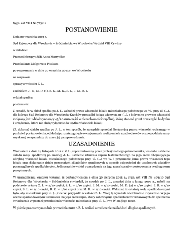 Sygn. akt VIII Ns 773/11 POSTANOWIENIE Dnia 20 września 2013 r. Sąd Rejonowy dla Wrocławia – Śródmieścia we Wrocławiu Wydział VIII Cywilny w składzie: Przewodniczący: SSR Anna Martyniec Protokolant: Małgorzata Pluskota po rozpoznaniu w dniu 20 września 2013 r. we Wrocławiu na rozprawie sprawy z wniosku Z. L. z udziałem J. B., M. D. (1), B. K., M. K., S. L., J. M., B. L. o dział spadku postanawia: I. ustalić, że w skład spadku po J. L. wchodzi prawo własności lokalu mieszkalnego położonego we W. przy ul. (...), dla którego Sąd Rejonowy dla Wrocławia-Krzyków prowadzi księgę wieczystą nr (...), z którym to prawem własności związany jest udział wynoszący 45/10.000 części w nieruchomości wspólnej, którą stanowi grunt oraz części budynku i urządzenia, które nie służą wyłącznie do użytku właścicieli lokali; II. dokonać działu spadku po J. L. w ten sposób, że zarządzić sprzedaż licytacyjną prawa własności opisanego w punkcie I postanowienia, odkładając rozstrzygnięcie o wzajemnych rozliczeniach spadkodawców oraz o podziale sumy uzyskanej ze sprzedaży do czasu jej przeprowadzenia. UZASADNIENIE Wnioskiem z dnia 24 listopada 2011 r. Z. L., reprezentowany przez profesjonalnego pełnomocnika, wniósł o ustalenie składu masy spadkowej po zmarłej J. L., ustalenie istnienia zapisu testamentowego na jego rzecz obejmującego odrębną własność lokalu mieszkalnego położonego przy ul. (...) we W. i przyznanie jemu prawa własności tego lokalu oraz dokonanie działu pozostałych składników spadkowych w sposób odpowiedni do ustalonych udziałów poszczególnych spadkobierców. Jednocześnie wniósł o zasądzenie na jego rzecz kosztów postępowania według norm przepisanych. W uzasadnieniu wniosku wskazał, iż postanowieniem z dnia 30 sierpnia 2011 r., sygn. akt VIII Ns 469/10 Sąd Rejonowy dla Wrocławia – Śródmieścia stwierdził, że spadek po J. L., zmarłej dnia 4 lutego 2010 r., nabyli na podstawie ustawy Z. L. w 2/10 części, S. L. w 2/10 części, J. M. w 1/10 części, M. D. (2) w 1/10 części, J. B. w 1/10 części, B. L. w 1/10 części, B. K. w 1/10 części oraz M. K. w 1/10 części. Wskazał, iż ostatnią wolą spadkodawczyni było, aby mieszkanie przy ul. (...) we W. przypadło w całości Z. L.. Wolę tę wyrażała wielokrotnie i wyraźnie. W jego ocenie spadkodawczyni ustanowiła na jego rzecz zapis, który zobowiązuje spadkobierców ustawowych do spełnienia świadczenia w postaci przeniesienia własności mieszkania przy ul. (...) we W. na jego rzecz. W piśmie procesowym z dnia 5 września 2012 r. Z. L. wniósł o rozliczenie nakładów i długów spadkowych. W odpowiedzi na wniosek uczestnik J. B. wskazał, iż wniosek Z. L. jest bezzasadny i wniósł o przyznanie prawa własności mieszkania w wysokości ustalonej w prawomocnym postanowieniu o stwierdzeniu nabycia spadku. Wskazał, iż mieszkanie należy sprzedać i dokonać podziału uzyskanych środków stosownie do udziałów spadkowych. W odpowiedzi na wniosek uczestniczka M. D. (1) wskazała, iż wniosek Z. L. jest bezzasadny ponieważ sporządzony w dniu 9 października 2007 r. testament nie został napisany własnoręcznie przez spadkodawczynię, a spadek został nabyty przez spadkobierców ustawowych. Dlatego też wniosła o przyznanie prawa własności mieszkania w sposób odpowiedni do ustalonych udziałów poszczególnych spadkobierców. Wskazała, iż mieszkanie należy sprzedać i podzielić się pieniędzmi. W odpowiedzi na wniosek o rozliczenie nakładów i długów spadkowych wniosła o jego oddalenie, wskazując, iż Z. L. wynajmuje mieszkanie wchodzące w skład spadku, w związku z czym pobiera z tego tytułu pożytki, które powinny pokryć związane z nim wydatki. W odpowiedzi na wniosek uczestniczka B. K. wskazała, iż nie przychyla się do wniosku Z. L. i proponuje aby mieszkanie, jako jedyny składnik majątkowy wchodzący w skład spadku, sprzedać i podzielić pieniądze na spadkobierców. Ponadto podniosła, iż M. K. jest wydziedziczona ze wszystkich spadków po jej zmarłym bracie Z. L.. W odpowiedzi na wniosek uczestnik postępowania J. M. wskazał, iż nie przychyla się do wniosku Z. L. o ustalenie zapisu testamentowego uprawniającego go do całkowitego prawa własności lokalu mieszkalnego przy ul. (...). Podniósł, iż mieszkanie należy sprzedać i podzielić pieniądze według ustalonych udziałów w spadku. W odpowiedzi na wniosek o rozliczenie nakładów uczestnik wniósł o oddalenie wniosku, wskazując, iż Z. L. wynajmuje mieszkanie wchodzące w skład spadku, w związku z czym pobiera pożytki, które powinny pokryć związane z nim wydatki. W odpowiedzi na wniosek uczestniczka B. L. wskazała, iż nie przychyla się do wniosku Z. L.. Podniosła, iż mieszkanie należy sprzedać i podzielić pieniądze stosownie do wysokości udziałów. W odpowiedzi na wniosek uczestnik S. L. wskazał, iż przychyla się do wniosku Z. L.. Podał, iż Z. L. regularnie odwiedzał J. L. w Ośrodku (...), a ponadto uregulował wszystkie zaległości w opłacie czynszu i inne opłaty oraz z jej polecenia wykupił, z własnych oszczędności przedmiotowe mieszkanie. Na rozprawie w dniu 25 kwietnia 2012 r. wnioskodawca oświadczył, iż jedynym składnikiem masy spadkowej jest mieszkanie przy ul. (...) we W. oraz chce, aby mieszkanie to przypadło jemu bez spłat na rzecz pozostałych spadkobierców – zgodnie z wolą spadkodawczyni wyrażoną w piśmie nazwanym testamentem z dnia 29 października 2007 r. Uczestnicy wskazali, iż nie zgadzają się na rezygnację z należnych im spłat. Nie sprzeciwiają się przyznaniu mieszkania Z. L., jednakże wnoszą o przyznanie na ich rzecz spłat stosownie do udziałów w spadku – zgodnie z postanowieniem z dnia 30 sierpnia 2011 r., sygn. akt VIII Ns 469/10. Na rozprawie w dniu 12 grudnia 2012 r. wnioskodawca oświadczył, iż wobec braku porozumienia z uczestnikami wnosi o orzec