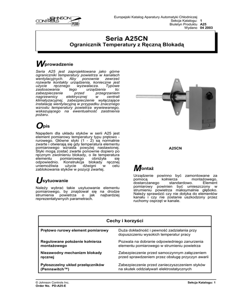 Europejski Katalog Aparatury Automatyki Chłodniczej Sekcja Katalogu: 1 Biuletyn Produktu A25 Wydano 04 2003 Seria A25CN Ogranicznik Temperatury z Ręczną Blokadą Wprowadzenie Seria A25 jest zaprojektowana jako górne ograniczniki temperatury powietrza w kanałach wentylacyjnych. Aby ponownie zewrzeć rozwarte kontakty urządzenia, konieczne jest użycie ręcznego wyzwalacza. Typowe zastosowania tego urządzenia to: zabezpieczenie przed przegrzaniem nagrzewnicy elektrycznej w centrali klimatyzacyjnej, zabezpieczenie wyłączające instalację wentylacyjną w przypadku znacznego wzrostu temperatury powietrza wywiewanego, wskazującego na ewentualność zaistnienia pożaru. Opis Napędem dla układu styków w serii A25 jest element pomiarowy temperatury typu prętowo rurowego. Główne styki (1 - 2) są normalnie zwarte i otwierają się gdy temperatura elementu pomiarowego wzrasta powyżej nastawionej. Styki mogą zostać zwarte ponownie dopiero po ręcznym zwolnieniu blokady, o ile temperatura elementu pomiarowego obniżyła się odpowiednio. Konstrukcja blokady ręcznej uniemożliwia użycie dźwigni w celu zablokowania styków w pozycji zwartej. Usytuowanie Należy wybrać takie usytuowanie elementu pomiarowego, by znajdował się na drodze strumienia powietrza o jak najbardziej reprezentatywnych parametrach. A25CN Montaż Urządzenie powinno być zamontowane za pomocą kołnierza montażowego, dostarczanego standardowo. Element pomiarowy powinien być umieszczony w strumieniu powietrza maksymalnie głęboko. Należy sprawdzić czy nie dotyka do elementów kanału i czy nie zostanie uszkodzony przez ruchomy osprzęt w kanale. Cechy i korzyści Prętowo rurowy element pomiarowy Duża dokładność i pewność zadziałania przy dopuszczeniu wysokich temperatur pracy Regulowane położenie kołnierza montażowego Pozwala na dobranie odpowiedniego zanurzenia elementu pomiarowego w strumieniu powietrza Niezawodny mechanizm blokady ręcznej Zabezpieczenie przed samoczynnym załączeniem przed sprawdzeniem przez obsługę przyczyn awarii Pyłoszczelny układ przełączników (Pennswitch™) Zabezpieczenie przed zanieczyszczeniem styków na skutek oddziaływań elektrostatycznych © Johnson Controls Inc. Order No. PD-A25-E Sekcja Katalogu: 1 A25 Wydano 04 2003 2 Układ styków Naprawa i wymiana 2 3 > 1 Rys. 1 1 - 2 rozwierane przy wzroście temperatury. Naprawy są niemożliwe. W przypadku niepoprawnego działania urządzenia należy skontaktować się z jego dostawcą. Jeżeli wskazana jest wymiana urządzenia, konieczne będzie podanie typu i numeru urządzenia (wszystkie dane można odnaleźć na tabliczce znamionowej regulatora). Uwaga Niniejsze urządzenia są jedynie regulatorami obiektowymi. Jeżeli awaria tego urządzenia może spowodować zagrożenie dla zdrowia lub życia ludzi albo poważne straty materialne, instalacja powinna zawierać dodatkowe urządzenie lub układ zabezpieczający i ostrzegający obsługę techniczną o zaistnieniu awarii lub pozwalający na wyeliminowanie jej negatywnych skutków. Regulacja Termostaty serii A25 są standardowo wyposażone w pokrętło do regulacji nastawy. Pokrętło to może zostać usunięte po zamontowaniu, aby ograniczyć łatwość manipulacji nastawą. Można ją wówczas zmieniać śrubokrętem. Sekcja Katalogu: 1 © Johnson Controls Inc. Order No. PD-A25-E A25 Wydano 04 2003 3 Wymiary [mm] 1 2 3 4 5 Pokrętło nastawy Dźwignia blokady Kołnierz montażowy Wkręty ustalające 1/4 "- 20 UNC Ř 22.3 otwór do okablowania, pod dławik PG 16. Rys. 2 © Johnson Controls Inc. Order No. PD-A25-E Sekcja Katalogu: 1 A25 Wydano 04 2003 4 Dane techniczne Typ Zakres Obciążalność elektryczna Maksymalna temperatura czujnika Maksymalna temperatura obudowy Element siłowy Blokada ręczna Nastawa ograniczenia górnego Masa z opakowaniem Obudowa (klasa ochrony) Wymiary A25CN-9001 0 to 100 °C ~15(8) A 230 V 150 °C 55 °C Konstrukcja prętowo - rurowa Ręcznie zwalniana blokada zadziałania. Blokada może zostać zwolniona dopiero po obniżeniu się temperatury elementu pomiarowego, o co najmniej 11 K poniżej wartości nastawionej. Regulowana krokowo w zakresie od 50 °C do 95 °C. Indywidualnym 0.9 kg Zbiorczym 15 kg (16 szt.) IP30 (patrz sekcja „Wymiary”) Powyższe dane są nominalne i zgodne ze standardami przemysłowymi. Dla zastosowania urządzenia w instalacji pracującej w warunkach wykraczających poza wyspecyfikowanie, konieczne jest uzyskanie zatwierdzenia lokalnego oddziału Johnson Controls. Johnson Controls nie odpowiada za szkody wynikłe z wadliwego zamontowania lub niewłaściwego stosowania jego urządzeń. . Dystrybutor ZTCh - Zak³ad Techniki Ch³odniczej Sekcja Katalogu: 1 85 - 8 61 Bydgoszcz ul. Glinki 14 4 tel. (0 5 2) 3 4 5 0 4 3 0, 3 4 5 0 4 3 2 fax ( 0 5 2 ) 3 4 5 0 6 3 0 e-mail: ztch @ ztch.pl http:// www.ztch.pl © Johnson Controls Inc. Order No. PD-A25-E