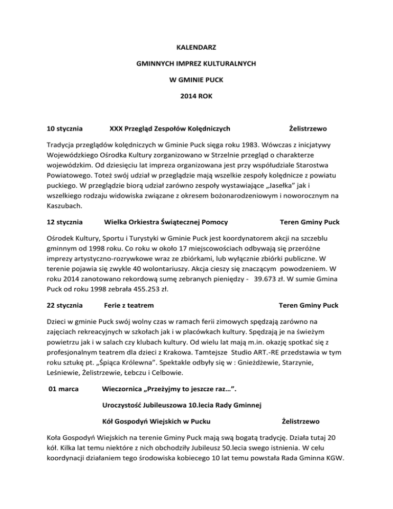 KALENDARZ GMINNYCH IMPREZ KULTURALNYCH W GMINIE PUCK 2014 ROK 10 stycznia XXX Przegląd Zespołów Kolędniczych Żelistrzewo Tradycja przeglądów kolędniczych w Gminie Puck sięga roku 1983. Wówczas z inicjatywy Wojewódzkiego Ośrodka Kultury zorganizowano w Strzelnie przegląd o charakterze wojewódzkim. Od dziesięciu lat impreza organizowana jest przy współudziale Starostwa Powiatowego. Toteż swój udział w przeglądzie mają wszelkie zespoły kolędnicze z powiatu puckiego. W przeglądzie biorą udział zarówno zespoły wystawiające „Jasełka” jak i wszelkiego rodzaju widowiska związane z okresem bożonarodzeniowym i noworocznym na Kaszubach. 12 stycznia Wielka Orkiestra Świątecznej Pomocy Teren Gminy Puck Ośrodek Kultury, Sportu i Turystyki w Gminie Puck jest koordynatorem akcji na szczeblu gminnym od 1998 roku. Co roku w około 17 miejscowościach odbywają się przeróżne imprezy artystyczno-rozrywkowe wraz ze zbiórkami, lub wyłącznie zbiórki publiczne. W terenie pojawia się zwykle 40 wolontariuszy. Akcja cieszy się znaczącym powodzeniem. W roku 2014 zanotowano rekordową sumę zebranych pieniędzy - 39.673 zł. W sumie Gmina Puck od roku 1998 zebrała 455.253 zł. 22 stycznia Ferie z teatrem Teren Gminy Puck Dzieci w gminie Puck swój wolny czas w ramach ferii zimowych spędzają zarówno na zajęciach rekreacyjnych w szkołach jak i w placówkach kultury. Spędzają je na świeżym powietrzu jak i w salach czy klubach kultury. Od wielu lat mają m.in. okazję spotkad się z profesjonalnym teatrem dla dzieci z Krakowa. Tamtejsze Studio ART.-RE przedstawia w tym roku sztukę pt. „Śpiąca Królewna”. Spektakle odbyły się w : Gnieżdżewie, Starzynie, Leśniewie, Żelistrzewie, Łebczu i Celbowie. 01 marca Wieczornica „Przeżyjmy to jeszcze raz…”. Uroczystośd Jubileuszowa 10.lecia Rady Gminnej Kół Gospodyo Wiejskich w Pucku Żelistrzewo Koła Gospodyo Wiejskich na terenie Gminy Puck mają swą bogatą tradycję. Działa tutaj 20 kół. Kilka lat temu niektóre z nich obchodziły Jubileusz 50.lecia swego istnienia. W celu koordynacji działaniem tego środowiska kobiecego 10 lat temu powstała Rada Gminna KGW. Oprócz kół z gminy Puck, skupia ona również koła z Władysławowa i dwa koła z Gminy Krokowa. W uroczystości wezmą udział delegacje poszczególnych kół, przedstawiciele władz paostwowych, samorządowych, sponsorzy oraz przedstawiciele instytucji ściśle współpracujących z kołami gospodyo wiejskich. Impreza będzie niejako „kalejdoskopem wydarzeo z ostatnich lat” ma pozwolid „przeżyd jeszcze raz…” wspaniałe, wspólne chwile pao w ostatnim dziesięcioleciu. 04 marca Konkurs Recytatorski Poezji Polskiej – eliminacje gminne Strzelno Konkurs ma na celu popularyzację polskiej literatury pięknej a także kształtowanie wrażliwości na piękno języka i mowy ojczystej. Adresowany jest do szkół podstawowych i gimnazjalnych w gminie. W konkursie z reguły uczestniczą najlepsi recytatorzy z wszystkich szkół. Najlepsi w poszczególnych kategoriach wiekowych reprezentują gminę w eliminacjach powiatowych. 08 kwietnia Konkurs Recytatorski „Rodnej Mowy” – eliminacje gminne Połczyno Celem konkursu jest poznawanie i popularyzacja literatury, tradycji i folkloru kaszubskiego oraz pielęgnowanie mowy kaszubskiej. Adresowany jest do osób, które maja potrzebę artystycznej wypowiedzi w języku swoich przodków, przede wszystkim ze szkół podstawowych i gimnazjalnych. Otwarty jest również na młodzież starszą i dorosłych. 11 kwietnia Przegląd Teatrów Szkolnych Żelistrzewo Tradycja organizowania przeglądów teatrów szkolnych trwa w gminie od roku 1988. Impreza umożliwia dzieciom zaprezentowania ich zdolności aktorskich oraz uczestnictwo w zabawie w teatr. Cieszy się wciąż niesłabnącym zainteresowaniem. Co roku spotyka się kilkanaście zespołów teatralnych, zarówno w formie „żywego planu” jak i teatru lalkowego. Niektóre szkoły przygotowują spektakle w języku kaszubskim. Najlepsze grupy teatralne reprezentują gminę w konkursach wyższego szczebla. 03 maja X Obchody 3-Majowe. Spotkanie z Pieśnią Maryjną. Wystawa „Madonny Polskie” Żelistrzewo Celem imprezy jest uczczenie 223.rocznicy Konstytucji 3 Maja, pielęgnowanie pięknych tradycji śpiewania pieśni Maryjnych, jako czynnika pobudzającego nasze religijne i patriotyczne uczucia. W części koncertowej biorą udział chóry oraz zespoły wokalne z terenu powiatu puckiego i nie tylko… Tradycyjnie imprezie towarzyszy wystawa fotograficzna „Madonny Polskie” i „Madonny Europy”. Przewiduje się również wystawę figurek Matki Boskiej pn. „Opiekunki naszych rodzin” pochodzących z rodzin żelistrzewskich. 07 maja Przegląd Muzyki Szkolnej Żelistrzewo Podobnie jak teatr, również muzyka szkolna w formie przeglądów gminnych organizowana jest na tutejszym terenie od roku 1988. Celem imprezy jest rozwijanie wśród młodego pokolenia zamiłowania do muzyki jako kulturalnej formy rozrywki i wypoczynku. Przegląd również stwarza okazję do twórczego stylu życia. Występują różnego rodzaju zespoły, duety wokalne jak i soliści. Utwory mogą byd prezentowane zarówno polskie jak i kaszubskie. Impreza cieszy się wielkim powodzeniem. Na gminnej estradzie prezentują się artyści niemalże ze wszystkich szkół. 13 maja Podsumowanie XVII Konkursu Literackiego „Błękitna Struna” Żelistrzewo Konkurs – organizowany wspólnie przez OKSiT w Gminie Puck oraz Bibliotekę Miejską w Pucku - przeznaczony jest dla wszystkich mieszkaoców Ziemi Puckiej, którzy nie należą do związków twórczych, a pragną spopularyzowad własną twórczośd. Uczestnicy konkursu nadsyłają dwa wiersze lub jedno opowiadanie o dowolnej tematyce, dotychczas nie publikowanych i nie nagradzanych w innych konkursach. Organizatorom zależy, aby chod jeden tekst dotyczył nadmorskiej krainy. 16 maja Podsumowanie „Bielawy’2014