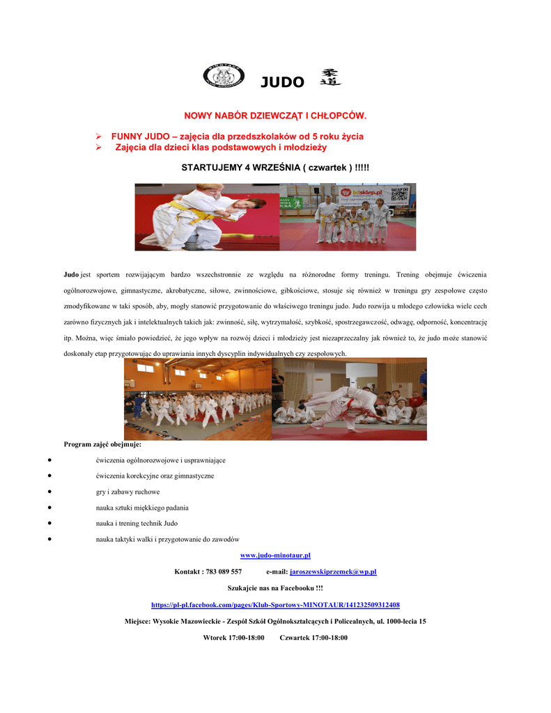 JUDO NOWY NABÓR DZIEWCZĄT I CHŁOPCÓW. FUNNY JUDO – zajęcia dla przedszkolaków od 5 roku życia Zajęcia dla dzieci klas podstawowych i młodzieży STARTUJEMY 4 WRZEŚNIA ( czwartek ) !!!!! Judo jest sportem rozwijającym bardzo wszechstronnie ze względu na różnorodne formy treningu. Trening obejmuje ćwiczenia ogólnorozwojowe, gimnastyczne, akrobatyczne, siłowe, zwinnościowe, gibkościowe, stosuje się również w treningu gry zespołowe często zmodyfikowane w taki sposób, aby, mogły stanowić przygotowanie do właściwego treningu judo. Judo rozwija u młodego człowieka wiele cech zarówno fizycznych jak i intelektualnych takich jak: zwinność, siłę, wytrzymałość, szybkość, spostrzegawczość, odwagę, odporność, koncentrację itp. Można, więc śmiało powiedzieć, że jego wpływ na rozwój dzieci i młodzieży jest niezaprzeczalny jak również to, że judo m oże stanowić doskonały etap przygotowując do uprawiania innych dyscyplin indywidualnych czy zespołowych. Program zajęć obejmuje: ćwiczenia ogólnorozwojowe i usprawniające ćwiczenia korekcyjne oraz gimnastyczne gry i zabawy ruchowe nauka sztuki miękkiego padania nauka i trening technik Judo nauka taktyki walki i przygotowanie do zawodów www.judo-minotaur.pl Kontakt : 783 089 557 e-mail: [email protected] Szukajcie nas na Facebooku !!! https://pl-pl.facebook.com/pages/Klub-Sportowy-MINOTAUR/141232509312408 Miejsce: Wysokie Mazowieckie - Zespół Szkół Ogólnokształcących i Policealnych, ul. 1000-lecia 15 Wtorek 17:00-18:00 Czwartek 17:00-18:00