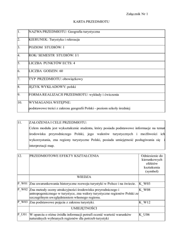 Załącznik Nr 1 KARTA PRZEDMIOTU 1. NAZWA PRZEDMIOTU: Geografia turystyczna 2. KIERUNEK: Turystyka i rekreacja 3. POZIOM STUDIÓW: I 4. ROK/ SEMESTR STUDIÓW: I/1 5. LICZBA PUNKTÓW ECTS: 4 6. LICZBA GODZIN: 60 7. TYP PRZEDMIOTU: obowiązkowy 8. JĘZYK WYKŁADOWY: polski 9. FORMA REALIZACJI PRZEDMIOTU: wykłady i ćwiczenia 10. WYMAGANIA WSTĘPNE: podstawowe treści z zakresu geografii Polski - poziom szkoły średniej 11. ZAŁOŻENIA I CELE PRZEDMIOTU: Celem modułu jest wykształcenie studenta, który posiada podstawowe informacje na temat środowiska przyrodniczego Polski, jego walorów turystycznych i możliwości ich wykorzystania, zna regiony turystyczne Polski, posiada umiejętność posługiwania się interpretacji map. 12. PRZEDMIOTOWE EFEKTY KSZTAŁCENIA Odniesienie do kierunkowych efektów kształcenia (symbol) WIEDZA P_W01 Zna uwarunkowania historyczne rozwoju turystyki w Polsce i na świecie. K_W03 P_W02 Zna metody oceny atrakcyjności środowiska przyrodniczego i K_W08 antropogenicznego w turystyce, zna walory turystyczne regionów Polski ze szczególnym uwzględnieniem własnego regionu. P_W03 Zna podstawowe pojęcia z zakresu turystyki. K_W12 UMIEJĘTNOŚCI P_U01 W oparciu o różne źródła informacji potrafi ocenić wartość warunków naturalnych wybranych regionów dla potrzeb turystyki K_U06 i P_U02 Na podstawie różnych źródeł potrafi ocenić stan zagospodarowania K_U19 turystycznego oraz możliwość jego wykorzystania w turystyce KOMPETENCJE SPOŁECZNE P_K01 Potrafi w interesujący sposób przekazać poznaną wiedzę z zakresu K_K07 Geografii Turystycznej P_K02 Rozumie potrzebę ustawicznego kształcenia się K_K08 13. METODY OCENY EFEKTÓW KSZTAŁCENIA Symbol Metody (sposoby) oceny Typ oceny Forma dokumentacji przedmiotowego efektu kształcenia P_W01 Ocenianie ciągłe, ciągła lista obecności, P_W02 śródsemestralne zaliczenie podsumowująca zeszyt zadań, P_W03 pisemne, końcowe zaliczenie sprawdzian pisemny pisemne P_U01 P_U02 śródsemestralne pisemne P_K01 P_K02 kontrola obecności, ocena formująca lista obecności śródsemestralne zaliczenie ustne, zaliczenie ocena formująca zeszyt zadań 14. KRYTERIA OCENY OSIĄGNIĘTYCH EFEKTÓW KSZTAŁCENIA (opisowe, procentowe, punktowe, inne ……………………………. formy oceny do wyboru przez wykładowcę) EFEKTY NA OCENĘ 3,0 NA OCENĘ 3,5 NA OCENĘ 4.0 NA OCENĘ 4,5 NA OCENĘ 5,0 KSZTAŁCENIA P_W01 51-60% 61-70% 71-80% 81-90% 90-100% P_W02 51-60% 61-70% 71-80% 81-90% 90-100% P_W03 51-60% 61-70% 71-80% 81-90% 90-100% P_U01 51-60% 61-70% 71-80% 81-90% 90-100% P_U02 51-60% 61-70% 71-80% 81-90% 90-100% P_K01 51-60% 61-70% 71-80% 81-90% 90-100% P_K02 51-60% 61-70% 71-80% 81-90% 90-100% 15. WARUNKI UZYSKANIA ZALICZENIA PRZEDMIOTU: Osiągnięcie założonych efektów kształcenia i pozytywny wynik x zaliczenia x egzaminu pisemnego egzaminu ustnego egzaminu praktycznego egzaminu końcowego ……………………… 16. TREŚCI PROGRAMOWE Treść zajęć Forma zajęć (liczba godz.) Symbol przedmiotowych efektów kształcenia 1. Wykłady Wprowadzenie do przedmiotu: podstawowe definicje, cele i zadania Geografii turystycznej 2 P_W03 1. Kryteria podziału turystyki – rodzaje 2 P_W03 1. Rola turystyki we współczesnym świecie 2 P_W02 1. Funkcje turystyki 2 P_W02 1. Rys historyczny rozwoju turystyki w Polsce 4 P_W01 1. Elementy środowiska geograficznego Polski 2 P_W02 1. Ocena atrakcyjności turystycznej wybranych obszarów i miejscowości w Polsce Walory turystyczne Polski 4 P_U01 P_U02 P_U01 P_U02 1. Charakterystyka wybranych regionów turystycznych Polski i świata 4 P_U01 P_U02 1. Formy ochrony przyrody w Polsce 2 P_U01 1. Parki narodowe w Polsce 2 P_U01 1. Czynniki kształtujące rozwój turystyki w Polsce i na świecie 2 P_U01 P_U02 Geografia Turystyczna w systemie nauk geograficznych, przyrodniczych i ekonomicznych Mapa (pojęcie mapy, treść i podział, praca z mapami wielkoskalowymi określanie położenia) Mapy poziomicowe (odczytywanie treści map poziomicowych, wysokość względna i bezwzględna, formy ukształtowania terenu) Położenie Polski i jego znaczenie dla rozwoju turystycznego. 2 2 P_W01 P_W03 P_U02 2 P_U02 2 1. Krainy geograficzne Polski i ich charakterystyka 4 1. Formy rzeźby terenu i ich geneza 4 P_W02 P_U01 P_U02 P_W02 P_U01 P_U02 P_U01 1. Sieć hydrograficzna Polski 2 P_U01 1. Turystyczna funkcja lasu – obszary prawnie chronione 2 P_U01 1. 2 Ćwiczenia 1. 1. 1. 1. 1. Uzdrowiska i ich znaczenie w turystyce wypoczynkowej Podział Polski na regiony turystyczne i ich charakterystyka 2 1. Euroregion Bug – możliwości rozwoju turystycznego Polski Wschodniej, Zachodniej Ukrainy i Białorusi. 2 1. Czynniki rozwoju współczesnej turystyki w Polsce i na świecie 2 1. 17. 4 P_U01 P_U02 P_U01 P_U02 P_K01 P_U01 P_U02 P_K01 P_K01 P_K02 METODY DYDAKTYCZNE: 1. Prezentacja multimedialna, przekaz słowny, praca indywidualna i praca w grupie, rozwiązywanie zadań 18. LITERATURA PODSTAWOWA I UZUPEŁNIAJĄCA: 1. 1. Cabaj W., Kruczek Z., Podstawy geografii turystycznej, Wyd. Proksenia, Kraków, 2009. 2. Gaworecki W., Tyrystyka, PWE, Warszawa, 2007. 3. Kaprowski W., Geografia turystyczna, Wyższa Szkoła Ekonomiczna, Warszawa, 2004. 4. Kowalczyk A., Geografia turyzmu, PWN, Warszawa, 2000. 5. Lijewski T., Mikułowski B., Wyrzykowski J., Geografia turystyki Polski. PWE, Warszawa, 1998. 19. OBCIĄŻENIE PRACĄ STUDENTA Forma aktywności a) Realizacja wykłady a) Realizacja ćwiczenia a) Realizacja laboratoria a) Egzamin Rodzaj zajęć przedmiotu: 30 przedmiotu: 30 Zajęcia przedmiotu: wymagające udziału prowadzącego a) Godziny kontaktowe nauczycielem - konsultacje a) ……………… a) Liczba godzin na zrealizowanie aktywności w semestrze ………………. z 15 Łączna liczba godzin zajęć realizowanych z udziałem prowadzącego (pkt. a +b + c + d + e…) 75 h) Przygotowanie się do zajęć 15 i) Przygotowanie się do zaliczeń/kolokwiów j) Przygotowanie się do egzaminu/zalicz