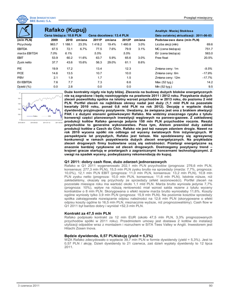 Przegląd miesięczny BRE Bank Securities Rafako (Kupuj) Cena bieŜąca: 10.8 PLN Analityk: Maciej Stokłosa Cena docelowa: 13.4 PLN Data ostatniej aktualizacji: 2011-06-03 (m ln PLN) 2009 2010 zm iana 2011P zm iana 2012P zm iana Przychody 963.7 1 188.1 23.3% 1 418.2 19.4% 1 460.8 3.0% Liczba akcji (mln) 67.5 72.1 6.7% 77.5 7.6% 79.9 3.1% MC (cena bieŜąca) Free float EBITDA marŜa EBITDA 5.5% Podstaw ow e dane (m ln PLN) EV (cena bieŜąca) 7.0% 6.1% EBIT 53.9 60.2 11.6% 63.7 5.9% 5.5% 65.6 3.0% Zysk netto 37.7 43.6 15.6% 56.3 29.0% 61.1 8.6% 69.6 751.7 563.0 20.5% P/E 19.9 17.2 13.4 12.3 Zmiana ceny: 1m -9.5% P/CE 14.6 13.5 10.7 10.0 Zmiana ceny: 6m -17.9% P/BV 2.1 1.9 1.7 1.5 Zmiana ceny: 12m -17.7% EV/EBITDA 7.6 7.7 7.3 6.6 Max (52 tyg.) 14.2 Dyield (%) 0.0 2.8 0.0 0.0 Min (52 tyg.) 9.5 17 15.4 13.8 12.2 10.6 Rafako WIG 9 2010-06-01 2010-09-20 2011-01-12 2011-05-05 DuŜe kontrakty nigdy nie były bliŜej. Zlecenia na budowę duŜych bloków energetycznych nie są zagroŜone i będą rozstrzygnięte na przełomie 2011 i 2012 roku. Pozyskanie duŜych zleceń pozwoliłoby spółce na istotny wzrost przychodów w 2013 roku, do poziomu 2 mld PLN. Portfel zleceń na najbliŜsze okresy nadal jest duŜy (1,1 mld PLN na pozostałe kwartały 2010 roku, ponad 0,6 mld PLN na rok 2012). Decyzję o wypłacie duŜej dywidendy przyjmujemy pozytywnie. UwaŜamy, Ŝe związana jest ona z brakiem akwizycji PAK i z duŜymi stanami gotówkowymi Rafako. Nie widzimy znacznego ryzyka z tytułu konwersji części planowanych inwestycji węglowych na parowo-gazowe. Z zakładowej produkcji kotłów Rafako generuje jedynie 150 mln PLN przychodów rocznie. Reszta przychodów to generalne wykonawstwo. Poza tym, Alstom przeniósł duŜy zakład produkcji kotłów z Czech do Chin. Rafako nie jest teŜ naszym zdaniem drogie. Nawet na rok 2010 wycena spółki nie odbiega od wyceny światowych firm inŜynieryjnych. W perspektywie lat przyszłych, Rafako jest tańsze. Nie spodziewamy się agresywnej konkurencji w ramach pozyskiwania duŜych zleceń energetycznych. Na przykładzie zleceń drogowych firmy budowlane uczą się ostroŜności. Przetargi energetyczne są znacznie bardziej ryzykowne od zleceń drogowych. Dostrzegamy pozytywny trend – krajowi gracze startują w przetargach z zagranicznymi koncernami technologicznymi. Z uwagi na spadek wyceny, podwyŜszamy rekomendację do kupuj. Q1 2011: dobry cash flow, duŜo zdarzeń jednorazowych Rafako w Q1 2011 wygenerowało 202,1 mln PLN przychodów (prognoza: 276,6 mln PLN, konsensus: 277,3 mln PLN), 15,5 mln PLN zysku brutto na sprzedaŜy (marŜa: 7,7%, prognoza: 10,0%), 12,1 mln PLN EBIT (prognoza: 11,0 mln PLN, konsensus: 13,2 mln PLN), 10,8 mln PLN zysku netto (prognoza: 10,0 mln PLN, konsensus: 11,6 mln PLN). Istotnie niŜsze, niŜ zakładaliśmy, okazały się przychody ze sprzedaŜy (efekt sezonowości). Portfel zleceń na pozostałe miesiące roku ma wartość około 1,1 mld PLN. MarŜa brutto wyniosła jedynie 7,7% (prognoza: 10%), wpływ na niŜszą rentowność miał wzrost salda rezerw z tytułu wyceny kontraktów o 8 mln PLN. Skorygowana o efekt rezerw marŜa brutto wyniosłaby 11,6%. Koszty ogólne wyniosły tylko 3,9 mln PLN (prognoza: 15,9 mln PLN). Na poziomie kosztów sprzedaŜy spółka zaksięgowała rozwiązanie odpisu naleŜności na 12,6 mln PLN (skorygowane o efekt odpisu koszty ogólne to 16,5 mln PLN, nieznacznie wyŜsze, niŜ prognozowaliśmy). Cash flow w Q1 2011 był bardzo dobry i wyniósł +52,3 mln PLN. Kontrakt za 47,5 mln PLN Rafako podpisało kontrakt za 12 mln EUR (około 47,5 mln PLN, 3,3% prognozowanych przychodów spółki w 2011 roku). Przedmiotem umowy jest dostawa 2 kotłów do instalacji utylizacji odpadów wraz z montaŜem i rozruchem w SITA Tees Valley w Anglii. Inwestorem jest Hitachi Zosen Inova. Będzie dywidenda, 0,57 PLN/akcję (yield = 5,3%) WZA Rafako zdecydowało o wypłacie 39,7 mln PLN w formie dywidendy (yield = 5,3%). Jest to 0,57 PLN / akcję. Dzień dywidendy to 21 czerwca, zaś dzień wypłaty dywidendy to 12 lipca 2011. 3 czerwca 2011 90