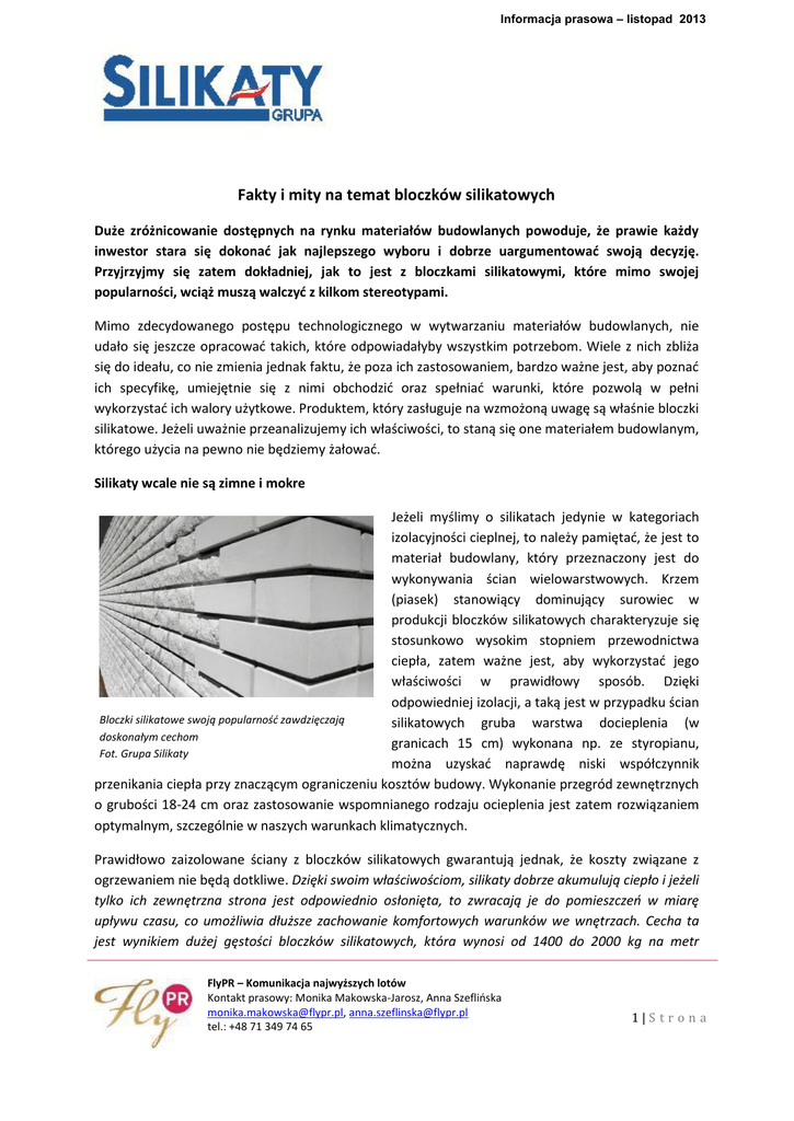 Informacja prasowa – listopad 2013 Fakty i mity na temat bloczków silikatowych Duże zróżnicowanie dostępnych na rynku materiałów budowlanych powoduje, że prawie każdy inwestor stara się dokonać jak najlepszego wyboru i dobrze uargumentować swoją decyzję. Przyjrzyjmy się zatem dokładniej, jak to jest z bloczkami silikatowymi, które mimo swojej popularności, wciąż muszą walczyć z kilkom stereotypami. Mimo zdecydowanego postępu technologicznego w wytwarzaniu materiałów budowlanych, nie udało się jeszcze opracować takich, które odpowiadałyby wszystkim potrzebom. Wiele z nich zbliża się do ideału, co nie zmienia jednak faktu, że poza ich zastosowaniem, bardzo ważne jest, aby poznać ich specyfikę, umiejętnie się z nimi obchodzić oraz spełniać warunki, które pozwolą w pełni wykorzystać ich walory użytkowe. Produktem, który zasługuje na wzmożoną uwagę są właśnie bloczki silikatowe. Jeżeli uważnie przeanalizujemy ich właściwości, to staną się one materiałem budowlanym, którego użycia na pewno nie będziemy żałować. Silikaty wcale nie są zimne i mokre Jeżeli myślimy o silikatach jedynie w kategoriach izolacyjności cieplnej, to należy pamiętać, że jest to materiał budowlany, który przeznaczony jest do wykonywania ścian wielowarstwowych. Krzem (piasek) stanowiący dominujący surowiec w produkcji bloczków silikatowych charakteryzuje się stosunkowo wysokim stopniem przewodnictwa ciepła, zatem ważne jest, aby wykorzystać jego właściwości w prawidłowy sposób. Dzięki odpowiedniej izolacji, a taką jest w przypadku ścian Bloczki silikatowe swoją popularność zawdzięczają silikatowych gruba warstwa docieplenia (w doskonałym cechom granicach 15 cm) wykonana np. ze styropianu, Fot. Grupa Silikaty można uzyskać naprawdę niski współczynnik przenikania ciepła przy znaczącym ograniczeniu kosztów budowy. Wykonanie przegród zewnętrznych o grubości 18-24 cm oraz zastosowanie wspomnianego rodzaju ocieplenia jest zatem rozwiązaniem optymalnym, szczególnie w naszych warunkach klimatycznych. Prawidłowo zaizolowane ściany z bloczków silikatowych gwarantują jednak, że koszty związane z ogrzewaniem nie będą dotkliwe. Dzięki swoim właściwościom, silikaty dobrze akumulują ciepło i jeżeli tylko ich zewnętrzna strona jest odpowiednio osłonięta, to zwracają je do pomieszczeń w miarę upływu czasu, co umożliwia dłuższe zachowanie komfortowych warunków we wnętrzach. Cecha ta jest wynikiem dużej gęstości bloczków silikatowych, która wynosi od 1400 do 2000 kg na metr FlyPR – Komunikacja najwyższych lotów Kontakt prasowy: Monika Makowska-Jarosz, Anna Szeflińska [email protected], [email protected] tel.: +48 71 349 74 65 1|S t r o n a Informacja prasowa – listopad 2013 sześcienny – mówi Tomasz Połubiński, ekspert Grupy Silikaty. Często spotkać się również można z obiegową opinią, że są to materiały mokre, mocno ciągnące wodę i wymagające specjalnych hydroizolacji. Nic bardziej mylnego, bowiem silikaty charakteryzują się niską nasiąkliwością, od 10 do 16 %, co w porównaniu z innymi materiałami daje bardzo dobry wynik. Ściany zewnętrzne z silikatów można więc bez obaw pozostawić jako nieotynkowane. Więcej zalet bloczków silikatowych Jeżeli ściany z bloczków silikatowych zostaną prawidłowo ocieplone, to tak naprawdę trudno znaleźć więcej problematycznych kwestii. Niektórzy zwracają jednak uwagę na to, że silikaty są stosunkowo ciężkie i kruche. Nie sposób nie zgodzić się z tymi twierdzeniami, jednak należy pamiętać, że jest to efektem wykorzystywania do ich produkcji jedynie naturalnych surowców – 90% to piasek, 7% wapno i 3% wody. Uzyskany w ten sposób produkt to swego rodzaju „sztuczny kamień”, który jest jednak całkowicie ekologiczny, nie emituje żadnych szkodliwych związków, a jego promieniotwórczość pozwala zaliczać go do najbezpieczniejszych materiałów budowlanych. Bloczki silikatowe są materiałem, który nie wymaga otynkowania Fot. Grupa Silikaty Duża masa silikatów w połączeniu z właściwościami krzemu sprawia, że wykonanie z nich bloczki są wyjątkowo wytrzymałe na ściskanie, co ma znaczący wpływ na bezpieczeństwo wznoszonych przy ich wykorzystaniu budynków. Ma ona również znaczenie w kwestii izolacyjności akustycznej. Silikaty chronią zatem skutecznie przed nadmiarem hałasu, który dochodzi z zewnątrz, ale potrafią także stanowczo wyciszyć nieprzyjemne szumy wydobywające się z wewnętrznych instalacji bądź pomieszczeń technicznych. Tomasz Połubiński do zdecydowanych zalet bloczków silikatowych zalicza także ich bezpieczeństwo pożarowe. Są one bowiem materiałem niepalnym o najwyższej klasie odporności na ogień – A1. Nawet stosunkowo cienka, bo zaledwie 18-centymetrowa ściana wykonana z silikatów pozwala na bezpośrednie oddziaływanie ognia nawet do 4 godzin bez zagrożenia dla całej konstrukcji. Umożliwia to zatem sprawną akcję ewakuacyjną oraz gaśniczą. Silikaty są wciąż cenionym materiałem budowlanym, który jak każdy inny, potrzebuje prawidłowego zastosowania oraz umiejętnego obchodzenia się z nim. Jego wykorzystanie w świadomym, nowoczesnym budownictwie pozwala na wykonywanie obiektów nie tylko efektywnych energetycznie, ale również trwałych i bezpiecznych. FlyPR – Komunikacja najwyższych lotów Kontakt prasowy: Monika Makowska-Jarosz, Anna Szeflińska [email protected], [email protected] tel.: +48 71 349 74 65 2|S t r o n a Informacja prasowa – listopad 2013 ------------------------------------------------------------------------------------------------------------------------------------------------------------------Grupa SILIKATY Sp. z o.o. to jeden z czołowych w Polsce producentów wyrobów silikatowych do wznoszenia ścian zewnętrznych, konstrukcyjnych, działowych, fundamentowych, ogniowych i piwnicznych. Grupa powstał