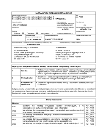 KARTA OPISU MODUŁU KSZTAŁCENIA Nazwa modułu/przedmiotu Kod Geometria wykreślna z elementami matematyki 1 Geometria wykreślna z elementami matematyki 1 - ĆWICZENIA Kierunek studiów AU-P108 Profil kształcenia (ogólnoakademicki, praktyczny) Rok / Semestr ogólnoakademcki ARCHITEKTURA I/2 CKI oferowany w języku: Przedmiot Specjalność - Kurs (obligatoryjny/obieralny) polskim obligatoryjny Godziny Liczba punktów Wykłady: 15 Stopień studiów: I Ćwiczenia: 30 Laboratoria: Forma studiów (stacjonarna/niestacjonarna) STACJONARNE - Projekty / seminaria: - Obszar(y) kształcenia Podział ECTS (liczba i %) NAUKI TECHNICZNE 100% Status przedmiotu w programie studiów (podstawowy, kierunkowy, inny) (ogólnouczelniany, z innego kierunku) PODSTAWOWY - Odpowiedzialny za przedmiot: Wykładowca: dr Jacek Gruszka e-mail: [email protected] Instytut Matematyki PP ul. Piotrowo 3A, 60-965 Poznań tel: 665-2320 dr Jacek Gruszka e-mail: [email protected] Instytut Matematyki PP ul. Piotrowo 3A, 60-965 Poznań tel: 665-2320-21 Wymagania wstępne w zakresie wiedzy, umiejętności, kompetencji społecznych: Podstawowa wiedza z zakresu szkoły średniej dotycząca przekształceń algebraicznych, podstawowych pojęć i zależności geometrycznych oraz wiedza z geometrii wykreślnej nabyta w pierwszym semestrze 1 Wiedza: 2 Umiejętności: Znajomość i stosowanie podstawowych konstrukcji geometrycznych oraz wszystkie umiejętności nabyte w pierwszym semestrze 3 Kompetencje społeczne Znajomość ograniczeń własnej wiedzy i rozumienie potrzeby dalszego kształcenia Cel przedmiotu: Umiejętności geometrycznego odwzorowywania i przekształcania obiektów w przestrzeni na powierzchnię dwuwymiarową; poznanie metod restytucji; rozumienie rysunków dokumentacyjnych. Znajomość zasad perspektywy pośredniej i bezpośredniej. Efekty kształcenia Wiedza: W0 W01 W02 W03 W04 W05 Student ma wiedzę dotyczącą rzutów równoległych, a w szczególności rzutu prostokątnego i jego własności Ma wiedzę dotyczącą podstawowych konstrukcji geometrii wykreślnej oraz zasad perspektywy Ma wiedzę o metodach restytucji i metodach mierzenia w perspektywie Ma wiedzę dotyczącą rodzajów oświetlenia i związanymi z nimi konstrukcjami cieni do wnętrz oraz cieni w perspektywie Ma wiedzę o rodzajach krzywych stożkowych i ich konstrukcjach i ich AU1_W07 AU1_W08 AU1_W07 AU1_W08 AU1_W07 AU1_W08 AU1_W07 AU1_W08 AU1_W07 zastosowaniach do konstrukcji powierzchni, zastosowania twierdzenia o rozpadzie linii przenikania w konstrukcjach cieni w rzutach prostokątnych i w perspektywie AU1_W08 Umiejętności: Student będzie potrafił U01 Rozwiązać zadanie dotyczące wyznaczenia linii przenikania powierzchni AU1_U06 U02 Wykreślić perspektywę bryły i jej cieni AU1_U06 U03 Wykonać samodzielnie pracę polegająca na wykreśleniu perspektywy detalu architektonicznego wraz z odpowiednią aranżacją AU1_U07 Kompetencje społeczne: Potrafi samodzielnie pracować nad wyznaczonym zadaniem K01 K02 Rozumie potrzebę i zna możliwości ciągłego dokształcania się AU1_K01 AU1_K03 Sposoby sprawdzenia efektów kształcenia Ocena formująca Kolokwium 3x w semestrze, ocena punktowa: 0 – 20 pkt. Praca domowa – projekt formatu A3, merytorycznie zupełnie poprawny, ocenia się jakość wykonania, ocena punktowa 5 – 10 pkt. Przyjęta skala ocen: 2,0; 3,0; 3,5; 4,0; 4,5; 5,0 Ocena podsumowująca: Zaliczenie ćwiczeń na podstawie powyższej udokumentowanej wiedzy i umiejętności Egzamin (2,5 godziny) – wykonanie perspektywy obiektu architektonicznego, wyznaczenie cieni, aranżacja. Przyjęta skala ocen: 3,0; 3,5; 4,0; 4,5; 5,0 Treści programowe • • • • • • • • • • Przekroje powierzchni. (stożek) Przenikania powierzchni (metoda płaszczyzn kierowniczych) Przenikania powierzchni ( metoda płaszczyzn tnących) Cienie na powierzchniach i do wnętrz Cienie do wnętrza sklepienia Perspektywa pośrednia, podziałki zbiegu. Cienie w oświetleniu równoległym do tła. Perspektywa bezpośrednia, punkty mierzenia, punkty częściowego mierzenia. Perspektywa krzywej. Cienie w perspektywie, cienie do wnętrz. Perspektywa czołowa, perspektywa okręgu Perspektywa odbić zwierciadlanych Literatura podstawowa: 1. W. Jankowski, Geometria wykreślna Wydawnictwo Politechniki Poznańskiej, Poznań 1993 (i późniejsze), 2. B. Grochowski, Geometria wykreślna z perspektywą stosowaną Wydawnictwo Naukowe PWN, Warszawa 1999 (i późniejsze), Literatura uzupełniająca: 1. Otto F., Otto E., Podręcznik geometrii wykreślnej, PWN, Warszawa 1979 (i późniejsze) 2. Korczak J., Prętki Cz., Przekroje i rozwinięcia powierzchni walcowych i stożkowych, Wydawnictwo PP, Poznań 1993 (i późniejsze) 3. Bartel K., Perspektywa malarska tom 1, PWN, Warszawa 1955 Obciążenie pracą studenta forma aktywności godzin ECTS Łączny nakład pracy 75 3 Zajęcia wymagające indywidualnego kontaktu z nauczycielem 50 2 Zajęcia o charakterze praktycznym 50 Bilans nakładu pracy przeciętnego studenta forma aktywności liczba godzin udział w wykładach 15 udział w ćwiczeniach/ laboratoriach (projektach) 30 przygotowanie do ćwiczeń/ laboratoriów 5 przygotowanie do kolokwium/przeglądu zaliczeniowego 15 udział w konsultacjach związanych z realizacją procesu kształcenia - przygotowanie do egzaminu 7,5 obecność na egzaminie 2,5 Łączny nakład pracy studenta: 3 punkty ECTS 75 h W ramach tak określonego nakładu pracy studenta: zajęcia wymagające bezpośredniego udziału nauczycieli akademickich: 2 punkty ECTS