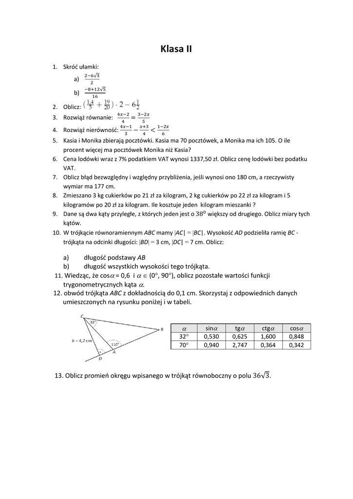 Klasa II 1. Skróć ułamki: a) b) 2. Oblicz: 3. Rozwiąż równanie: 4. Rozwiąż nierówność: 5. Kasia i Monika zbierają pocztówki. Kasia ma 70 pocztówek, a Monika ma ich 105. O ile procent więcej ma pocztówek Monika niż Kasia? 6. Cena lodówki wraz z 7% podatkiem VAT wynosi 1337,50 zł. Oblicz cenę lodówki bez podatku VAT. 7. Oblicz błąd bezwzględny i względny przybliżenia, jeśli wynosi ono 180 cm, a rzeczywisty wymiar ma 177 cm. 8. Zmieszano 3 kg cukierków po 21 zł za kilogram, 2 kg cukierków po 22 zł za kilogram i 5 kilogramów po 20 zł za kilogram. Ile kosztuje jeden kilogram mieszanki ? 9. Dane są dwa kąty przyległe, z których jeden jest o większy od drugiego. Oblicz miary tych kątów. 10. W trójkącie równoramiennym ABC mamy AC| = BC|. Wysokość AD podzieliła ramię BC trójkąta na odcinki długości: BD = 3 cm, DC| = 7 cm. Oblicz: a) długość podstawy AB b) długość wszystkich wysokości tego trójkąta. 11. Wiedząc, że cos = 0,6 i  (0, 90), oblicz pozostałe wartości funkcji trygonometrycznych kąta . 12. obwód trójkąta ABC z dokładnością do 0,1 cm. Skorzystaj z odpowiednich danych umieszczonych na rysunku poniżej i w tabeli.  32 70 sin 0,530 0,940 tg 0,625 2,747 13. Oblicz promień okręgu wpisanego w trójkąt równoboczny o polu ctg 1,600 0,364 . cos 0,848 0,342