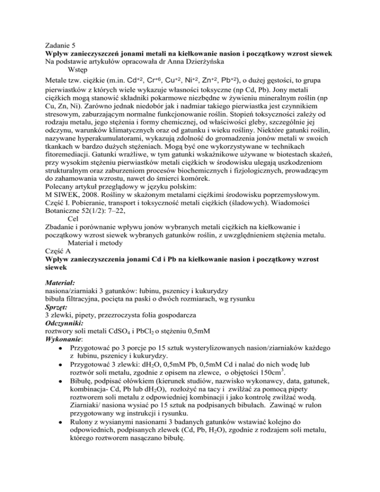Zadanie 5 Wpływ zanieczyszczeń jonami metali na kiełkowanie nasion i początkowy wzrost siewek Na podstawie artykułów opracowała dr Anna Dzierżyńska Wstęp Metale tzw. ciężkie (m.in. Cd+2, Cr+6, Cu+2, Ni+2, Zn+2, Pb+2), o dużej gęstości, to grupa pierwiastków z których wiele wykazuje własności toksyczne (np Cd, Pb). Jony metali ciężkich mogą stanowić składniki pokarmowe niezbędne w żywieniu mineralnym roślin (np Cu, Zn, Ni). Zarówno jednak niedobór jak i nadmiar takiego pierwiastka jest czynnikiem stresowym, zaburzającym normalne funkcjonowanie roślin. Stopień toksyczności zależy od rodzaju metalu, jego stężenia i formy chemicznej, od właściwości gleby, szczególnie jej odczynu, warunków klimatycznych oraz od gatunku i wieku rośliny. Niektóre gatunki roślin, nazywane hyperakumulatorami, wykazują zdolność do gromadzenia jonów metali w swoich tkankach w bardzo dużych stężeniach. Mogą być one wykorzystywane w technikach fitoremediacji. Gatunki wrażliwe, w tym gatunki wskaźnikowe używane w biotestach skażeń, przy wysokim stężeniu pierwiastków metali ciężkich w środowisku ulegają uszkodzeniom strukturalnym oraz zaburzeniom procesów biochemicznych i fizjologicznych, prowadzącym do zahamowania wzrostu, nawet do śmierci komórek. Polecany artykuł przeglądowy w języku polskim: M SIWEK, 2008. Rośliny w skażonym metalami ciężkimi środowisku poprzemysłowym. Część I. Pobieranie, transport i toksyczność metali ciężkich (śladowych). Wiadomości Botaniczne 52(1/2): 7–22, Cel Zbadanie i porównanie wpływu jonów wybranych metali ciężkich na kiełkowanie i początkowy wzrost siewek wybranych gatunków roślin, z uwzględnieniem stężenia metalu. Materiał i metody Część A Wpływ zanieczyszczenia jonami Cd i Pb na kiełkowanie nasion i początkowy wzrost siewek Materiał: nasiona/ziarniaki 3 gatunków: łubinu, pszenicy i kukurydzy bibuła filtracyjna, pocięta na paski o dwóch rozmiarach, wg rysunku Sprzęt: 3 zlewki, pipety, przezroczysta folia gospodarcza Odczynniki: roztwory soli metali CdSO4 i PbCl2 o stężeniu 0,5mM Wykonanie: Przygotować po 3 porcje po 15 sztuk wysterylizowanych nasion/ziarniaków każdego z łubinu, pszenicy i kukurydzy. Przygotować 3 zlewki: dH2O, 0,5mM Pb, 0,5mM Cd i nalać do nich wodę lub roztwór soli metalu, zgodnie z opisem na zlewce, o objętości 150cm3. Bibułę, podpisać ołówkiem (kierunek studiów, nazwisko wykonawcy, data, gatunek, kombinacja- Cd, Pb lub dH2O), rozłożyć na tacy i zwilżać za pomocą pipety roztworem soli metalu z odpowiedniej kombinacji i jako kontrolę zwilżać wodą. Ziarniaki/ nasiona wysiać po 15 sztuk na podpisanych bibułach. Zawinąć w rulon przygotowany wg instrukcji i rysunku. Rulony z wysianymi nasionami 3 badanych gatunków wstawiać kolejno do odpowiednich, podpisanych zlewek (Cd, Pb, H2O), zgodnie z rodzajem soli metalu, którego roztworem nasączano bibułę. Przykryć od góry przezroczystą folią gospodarczą, aby ograniczyć parowanie. Przygotować tabelkę wyników. Po tygodniu rozwinąć rulony i obliczyć liczbę skiełkowanych nasion, zmierzyć długość korzeni oraz części nadziemnej siewek łubinu, pszenicy i kukurydzy i oznaczyć ich świeżą masę z 2 kombinacji traktowanych jonami metali i kontroli. Obliczyć wartości średnie badanych cech w kombinacji i zapisać w formie tabeli. Zinterpretować otrzymane wyniki i wyciągnąć wnioski. Część B Wpływ zanieczyszczenia jonami Zn i Cu na kiełkowanie nasion i początkowy wzrost siewek Materiał: nasiona/ziarniaki 2 gatunków: pszenicy i kukurydzy bibuła filtracyjna, pocięta na paski o dwóch rozmiarach, wg rysunku Sprzęt: 5 zlewek, pipety, przezroczysta folia gospodarcza, taca plastikowa Odczynniki: roztwory soli metali ZnSO4 x 7H2O, CuSO4 x 5H2O o stężeniu 0,5mM i 1mM Wykonanie Do 4 opisanych zlewek nalać 150 cm3 roztworów przygotowanych soli, zgodnie z kombinacją (Cu 0.5mM, Cu 1mM, Zn 0.5mM, Zn 1mM) a do 5 wodę destylowaną (kontrola H2O). Przygotować 3 porcje po 15 sztuk wysterylizowanych nasion/ziarniaków pszenicy i kukurydzy. Podpisać ołówkiem bibuły (kierunek studiów, nazwisko wykonawcy, data, gatunek, kombinacja – Cu 0.5mM, Cu 1mM, Zn 0.5mM, Zn 1mM, kontrola H2O). Bibułę rozłożyć na tacy plastikowej, wysiać po 15 sztuk nasion, zwilżyć za pomocą pipety roztworem soli cynku lub miedzi o odpowiednim stężeniu a jako kontrolę bibułę zwilżyć wodą, odpowiednio do opisu na bibule. Zawinąć w rulon przygotowany wg instrukcji i rysunku. Podpisać zlewki wg kombinacji. Rulony z wysianymi nasionami 2 badanych gatunków wstawiać kolejno do odpowiednich, podpisanych zlewek, zgodnie z kombinacją. Przykryć przezroczystą folią gospodarczą, aby ograniczyć parowanie. Przygotować tabelkę wyników. Po tygodniu rozwinąć rulony i obliczyć liczbę skiełkowanych nasion, zmierzyć długość korzeni oraz części nadziemnej siewek pszenicy i kukurydzy i oznaczyć ich świeżą masę z 4 kombinacji traktowanych jonami metali i z kontroli (dH2O). Obliczyć wartości średnie badanych cech w kombinacji i zapisać w formie tabeli. Zinterpretować otrzymane wyniki i wyciągnąć wnioski. Wyrzucić bibułę i nasiona, wymyć zlewki. Rysunek A C B1 B2 Instrukcja Duży pasek bibuły –A położyć na tacy, na nim położyć w połowie szerokości jeden mały pasek bibuły B1 i zwilżyć całą powierzchnię wodą lub roztworem za pomocą pipety. Na małym pasku wysiewać pęsetą nasiona – C. Przykryć nasiona drugim małym paskiem bibuły i całość zrolować nasionami do wewnątrz. Wstawić rulon bibuły do naczynia z wodą lub roztworem na podsiąk.