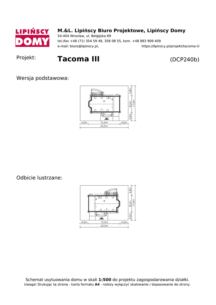 M.&L. Lipińscy Biuro Projektowe, Lipińscy Domy 54-404 Wrocław, ul. Belgijska 69 tel./fax +48 (71) 354 59 49, 358 08 55, kom. +48 883 909 409 Projekt: e-mail: [email protected], https://lipinscy.pl/projekt/tacoma-iii Tacoma III (DCP240b) Wersja podstawowa: Odbicie lustrzane: Schemat usytuowania domu w skali 1:500 do projektu zagospodarowania działki. Uwaga! Drukując tę stronę - karta formatu A4 - należy wyłączyć skalowanie / dopasowanie do strony. Powered by TCPDF (www.tcpdf.org)