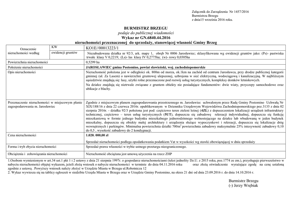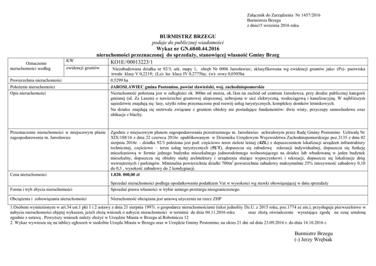 Załącznik do Zarządzenia Nr 1457/2016 Burmistrza Brzegu z dnia15 września 2016 roku. Oznaczenie nieruchomości według KW BURMISTRZ BRZEGU podaje do publicznej wiadomości Wykaz nr GN.6840.44.2016 nieruchomości przeznaczonej do sprzedaży, stanowiącej własność Gminy Brzeg KO1E//00013223/1 ewidencji gruntów Powierzchnia nieruchomości Niezabudowana działka nr 92/3, ark. mapy 1, obręb Nr 0006 Jarosławiec; sklasyfikowana wg ewidencji gruntów jako: (Ps)- pastwiska trwałe klasy V 0,2219; (Ls)- las klasy IV 0,2775ha; (w)- rowy 0,0305ha 0,5299 ha Położenie nieruchomości Opis nieruchomości JAROSŁAWIEC gmina Postomino, powiat sławieński, woj. zachodniopomorskie Nieruchomość położona jest w odległości ok. 800m od morza, ok.1km na zachód od centrum Jarosławca, przy drodze publicznej kategorii gminnej (ul. Za Lasem) o nawierzchni gruntowej ulepszonej, uzbrojona w sieć elektryczną, wodociągową i kanalizacyjną. W najbliższym sąsiedztwie znajdują się: lasy, użytki rolne przeznaczone pod rozwój usług turystycznych, kompleksy domków letniskowych. Na działce znajdują się nietrwale związane z gruntem obiekty nie posiadające fundamentów: dwie wiaty, przyczepy samochodowe oraz ubikacje z blachy. Przeznaczenie nieruchomości w miejscowym planie zagospodarowania m. Jarosławiec Cena nieruchomości Zgodnie z miejscowym planem zagospodarowania przestrzennego m. Jarosławiec uchwalonym przez Radę Gminy Postomino Uchwałą Nr XIX/188/16 z dnia 22 czerwca 2016r. opublikowanym w Dzienniku Urzędowym Województwa Zachodniopomorskiego poz.3135 z dnia 02 sierpnia 2016r. - działka 92/3 położona jest pod: częściowo teren zieleni leśnej (4ZL) z dopuszczeniem lokalizacji urządzeń infrastruktury technicznej, częściowo – teren usług turystycznych (5UT), dopuszcza się zabudowę rekreacji indywidualnej, dopuszcza się funkcję mieszkaniową w formie jednego budynku mieszkalnego jednorodzinnego wolnostojącego na działce lub wbudowaną w jeden budynek mieszkalny, dopuszcza się obiekty małej architektury i urządzenia służące wypoczynkowi i rekreacji, dopuszcza się lokalizacje dróg wewnętrznych i parkingów. Minimalna powierzchnia działki 700m2 powierzchnia zabudowy maksymalnie 25% intesywność zabudowy 0,10 do 0,5 , wysokość zabudowy do 2 kondygnacji. 1.020. 000,00 zł Forma i tryb zbycia nieruchomości Sprzedaż nieruchomości podlega opodatkowaniu podatkiem Vat w wysokości wg stawki obowiązującej w dniu sprzedaży Sprzedaż prawa własności w trybie ustnego przetargu nieograniczonego. Obciążenia i zobowiązania nieruchomości Nieruchomość obciążana jest umową użyczenia na rzecz ZHP 1.Osobom wymienionym w art.34 ust.1 pkt 1 i 2 ustawy z dnia 21 sierpnia 1997r. o gospodarce nieruchomościami (tekst jednolity Dz.U. z 2015 roku, poz.1774 ze zm.), przysługuje pierwszeństwo w nabyciu nieruchomości objętej wykazem, jeżeli złożą wniosek o nabycie nieruchomości w terminie do dnia 04.11.2016 roku oraz złożą oświadczenie wyrażające zgodę na cenę ustaloną zgodnie z ustawą . Powyższy wniosek należy złożyć w Urzędzie Miasta w Brzegu ul.Robotnicza 12 2. Wykaz wywiesza się na tablicy ogłoszeń w siedzibie Urzędu Miasta w Brzegu oraz w Urzędzie Gminy Postomino, na okres 21 dni od dnia 23.09.2016 r. do dnia 14.10.2016 r. Burmistrz Brzegu (-) Jerzy Wrębiak