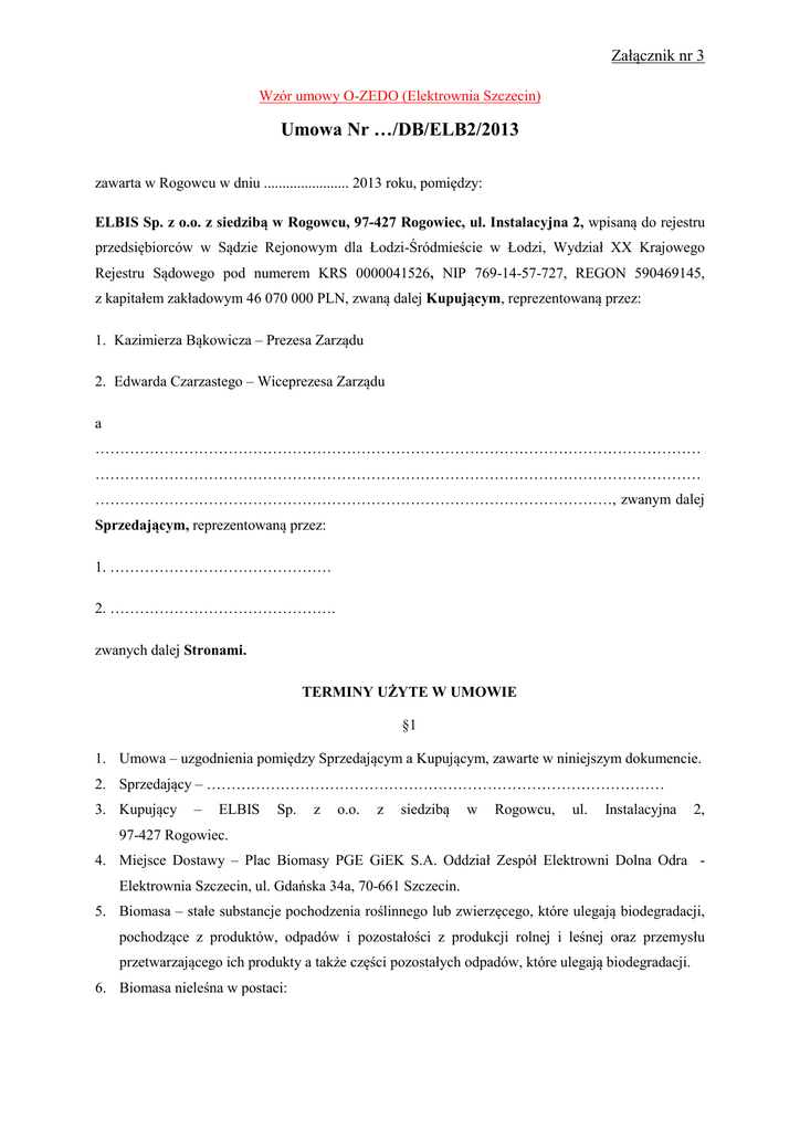 Załącznik nr 3 Wzór umowy O-ZEDO (Elektrownia Szczecin) Umowa Nr …/DB/ELB2/2013 zawarta w Rogowcu w dniu ....................... 2013 roku, pomiędzy: ELBIS Sp. z o.o. z siedzibą w Rogowcu, 97-427 Rogowiec, ul. Instalacyjna 2, wpisaną do rejestru przedsiębiorców w Sądzie Rejonowym dla Łodzi-Śródmieście w Łodzi, Wydział XX Krajowego Rejestru Sądowego pod numerem KRS 0000041526, NIP 769-14-57-727, REGON 590469145, z kapitałem zakładowym 46 070 000 PLN, zwaną dalej Kupującym, reprezentowaną przez: 1. Kazimierza Bąkowicza – Prezesa Zarządu 2. Edwarda Czarzastego – Wiceprezesa Zarządu a …………………………………………………………………………………………………………… …………………………………………………………………………………………………………… ……………………………………………………………………………………………, zwanym dalej Sprzedającym, reprezentowaną przez: 1. ……………………………………… 2. ………………………………………. zwanych dalej Stronami. TERMINY UŻYTE W UMOWIE §1 1. Umowa – uzgodnienia pomiędzy Sprzedającym a Kupującym, zawarte w niniejszym dokumencie. 2. Sprzedający – ………………………………………………………………………………… 3. Kupujący – ELBIS Sp. z o.o. z siedzibą w Rogowcu, ul. Instalacyjna 2, 97-427 Rogowiec. 4. Miejsce Dostawy – Plac Biomasy PGE GiEK S.A. Oddział Zespół Elektrowni Dolna Odra Elektrownia Szczecin, ul. Gdańska 34a, 70-661 Szczecin. 5. Biomasa – stałe substancje pochodzenia roślinnego lub zwierzęcego, które ulegają biodegradacji, pochodzące z produktów, odpadów i pozostałości z produkcji rolnej i leśnej oraz przemysłu przetwarzającego ich produkty a także części pozostałych odpadów, które ulegają biodegradacji. 6. Biomasa nieleśna w postaci: Umowa Nr ..…/ELB2/2013 a) Peletu ze słomy – rozumie się przez to zagęszczoną Biomasę wytwarzaną przez prasowanie rozdrobnionej słomy, w kształcie walca z nieregularnymi końcami, o długości do 30 mm; b) Zrębki z upraw energetycznych – rozumie się przez to Biomasę pochodzenia rolnego, dla której materiałem wyjściowym jest drewno ze zmodyfikowanych roślin, m.in. z wierzby energetycznej lub innych drzew szybkorosnących pochodzących z plantacji zakładanych w celu wykorzystania pochodzącej z nich Biomasy w procesie wytwarzania energii, uzyskane w wyniku obróbki mechanicznej (preferowane na rębaku nożowym), przy czym zrębka ta nie może zawierać zielonych części tych roślin. 7. Biomasa leśna w postaci zrębki – rozumie się przez to Biomasę, dla której materiałem wyjściowym jest niepełnowartościowe drewno lite lub odpady drzewne pochodzenia leśnego lub z przemysłu związanego z przeróbką drewna, uzyskane w wyniku obróbki mechanicznej (preferowane na rębaku nożowym), przy czym zrębka ta nie może zawierać zielonych liści i igieł. 8. Oświadczenie o Pochodzeniu Biomasy – dokument sporządzony i dostarczony przez Sprzedającego zgodnie z wymaganiami Urzędu Regulacji Energetyki lub innych uprawnionych organów, w szczególności określający miejsce wytworzenia Biomasy, rodzaj użytego surowca do jej produkcji oraz miejsce wytworzenia lub pozyskania surowca do wytworzenia Biomasy wraz ze wskazaniem jej wytwórcy i wszystkich podmiotów handlowych pośredniczących w obrocie Biomasą do Kupującego. 9. Pojedyncza Dostawa Biomasy – Biomasa jednego rodzaju i jednej postaci dostarczona jednym samochodem na podstawie jednego dokumentu przewozowego. 10. Dobowa Dostawa Biomasy – suma Pojedynczych Dostaw Biomasy w ciągu jednej doby, tj. od godziny 0:00 do 23:59. 11. Partia Dostarczonej Biomasy – suma Dobowych Dostaw Biomasy z danej dekady jednego miesiąca. Dekada I – od godziny 00:00 pierwszego dnia miesiąca do godziny 23:59 dziesiątego dnia miesiąca. Dekada II – od godziny 00:00 jedenastego dnia miesiąca do godziny 23:59 dwudziestego dnia miesiąca. Dekada III - od godziny 00:00 dwudziestego pierwszego dnia miesiąca do godziny 23:59 ostatniego dnia miesiąca. 12. Miesięczna Dostawa Biomasy – suma Dobowych Dostaw Biomasy w ciągu jednego miesiąca, tj. od godziny 00:01 pierwszego dnia miesiąca do godziny 23:59 ostatniego dnia miesiąca. 13. Dowód Dostawy Biomasy – dokument WZ zawierający nazwę Sprzedającego (Dostawcy Biomasy), rodzaj Biomasy, postać oraz ilość dostarczonej Biomasy. 14. Partia Do Badań – suma prób pobranych z Pojedynczych Dostaw Biomasy zrealizowanych w ciągu kolejnych dni, odpowiednio od poniedziałku od godz. 00.00 do środy do godz. 23:59 oraz od czwartku od godz. 00:00 do niedzieli do godz. 23:59 włącznie. str. 2 Umowa Nr ..…/ELB2/2013 15. Protokół z Badań Jakości Biomasy (Sprawozdanie z badań paliwa stałego) – dokument wystawiany przez Oddział dla Partii do Badań zawierający parametry Biomasy, tj.: wartość opałową, zawartość popiołu, zawartość wilgoci, wyrażone w stanie roboczym. 16. Harmonogram Miesięcznych Dostaw Biomasy (HMDB) – Harmonogram określający ile i jakiego rodzaju Biomasy, należy dostarczyć do Miejsca Dostawy w danym miesiącu. 17. Harmonogram Dobowych Dostaw Biomasy (HDDB) – Harmonogram określający ile Biomasy i jakiego rodzaju/formy oraz iloma samochodami, należy dostarczyć Kupującemu w danym dniu miesiąca. 18. Dobowa Awizacja Dostaw Biomasy (DADB) – Plik EXCEL, który zawiera następujące dane: indywidualne oznaczenie Sprzedającego, ilość samochodów, rodzaj i ilość Biomasy, datę oraz zakres czasowy (godziny realizacji dostaw) jej dostarczenia do Miejsca Dostawy. 19. Świadectwo Jakości Biomasy (SJB) – Dokument identyfikujący rodzaj Biomasy i jej producenta, właściwości fizyczne i chemiczne oraz identyfikację zagrożeń i sposób postępowania w przypadku ich powstania. Dokument powinien zawiera