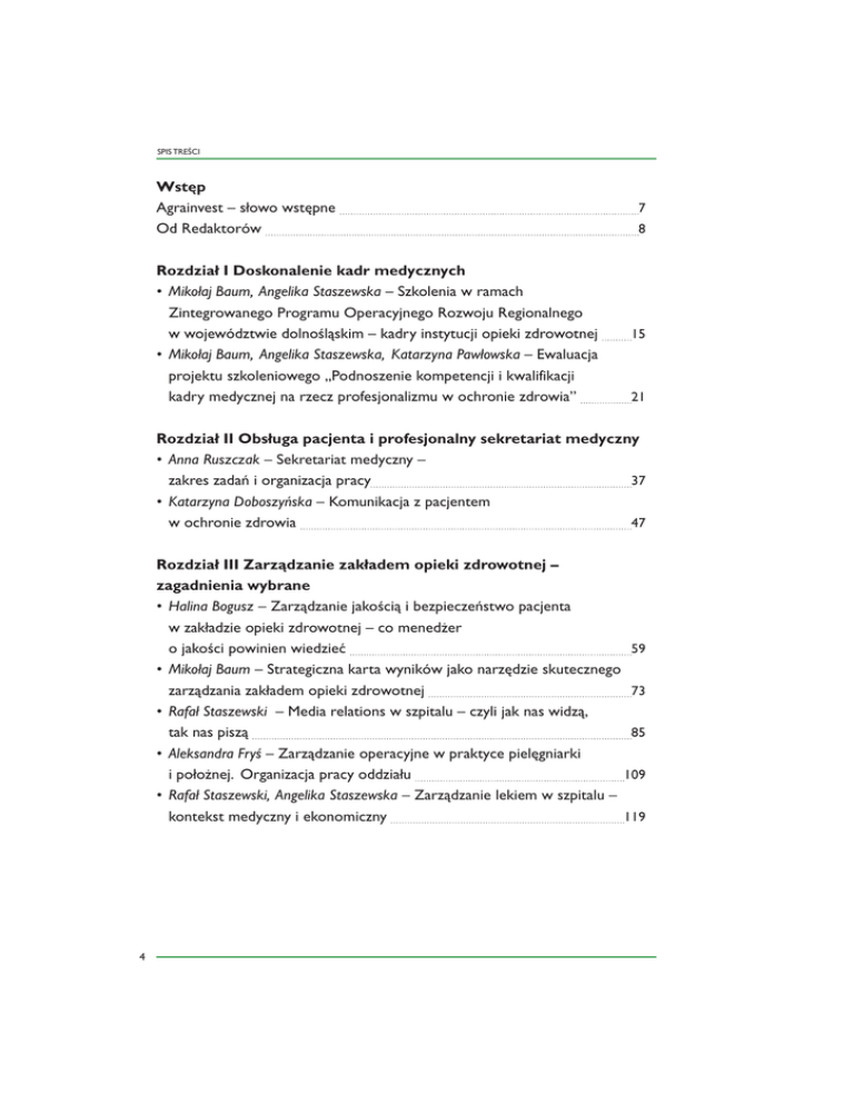 PROFESJONALIZM SPIS TREŚCI W INSTYTUCJACH OPIEKI ZDROWOTNEJ – poradnik dla pracowników Wstęp Agrainvest – słowo wstępne Od Redaktorów Rozdział I Doskonalenie kadr medycznych • Mikołaj Baum, Angelika Staszewska – Szkolenia w ramach Zintegrowanego Programu Operacyjnego Rozwoju Regionalnego w województwie dolnośląskim – kadry instytucji opieki zdrowotnej • Mikołaj Baum, Angelika Staszewska, Katarzyna Pawłowska – Ewaluacja projektu szkoleniowego ,,Podnoszenie kompetencji i kwalifikacji kadry medycznej na rzecz profesjonalizmu w ochronie zdrowia” 7 8 15 21 Rozdział II Obsługa pacjenta i profesjonalny sekretariat medyczny • Anna Ruszczak – Sekretariat medyczny – zakres zadań i organizacja pracy 37 • Katarzyna Doboszyńska – Komunikacja z pacjentem w ochronie zdrowia 47 Rozdział III Zarządzanie zakładem opieki zdrowotnej – zagadnienia wybrane • Halina Bogusz – Zarządzanie jakością i bezpieczeństwo pacjenta w zakładzie opieki zdrowotnej – co menedżer o jakości powinien wiedzieć 59 • Mikołaj Baum – Strategiczna karta wyników jako narzędzie skutecznego zarządzania zakładem opieki zdrowotnej 73 • Rafał Staszewski – Media relations w szpitalu – czyli jak nas widzą, tak nas piszą 85 • Aleksandra Fryś – Zarządzanie operacyjne w praktyce pielęgniarki i położnej. Organizacja pracy oddziału 109 • Rafał Staszewski, Angelika Staszewska – Zarządzanie lekiem w szpitalu – kontekst medyczny i ekonomiczny 119 4 Rozdział IV Konteksty etyczne w pracy kadry medycznej • Ewa Baum – Transplantacje jako społeczny problem współczesnej medycyny • Izabela Rzymska – Kompetencje moralne pracowników instytucji opieki zdrowotnej Rozdział V Prawne aspekty organizacji i zarządzania świadczeniami medycznymi • Monika Urbaniak – Formy prawne działalności medycznej • Paweł Węgrzynowski – Podstawy prawa w pracy zawodowej lekarza i lekarza dentysty oraz pielęgniarki i położnej • Monika Urbaniak – Rodzaje zatrudnienia w zakładach opieki zdrowotnej Rozdział VI Wybrane problemy w opiece nad chorym starszym w domu • Katarzyna Wieczorowska-Tobis – Upadki jako przyczyna niesprawności funkcjonalnej w starości • Urszula Kwapisz – Wybrane problemy opieki środowiskowej nad pacjentem w podeszłym wieku po udarze mózgu Notki biograficzne o autorach 141 161 173 185 199 213 229 243 5