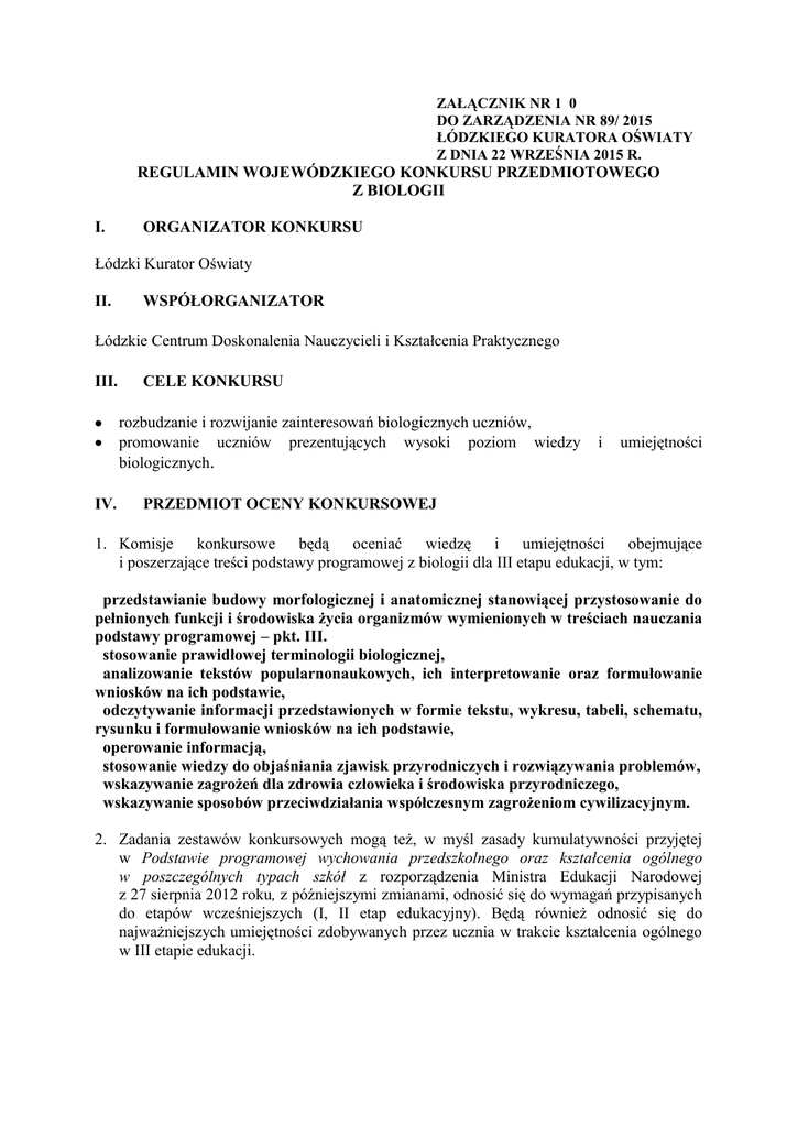 ZAŁĄCZNIK NR 1 0 DO ZARZĄDZENIA NR 89/ 2015 ŁÓDZKIEGO KURATORA OŚWIATY Z DNIA 22 WRZEŚNIA 2015 R. REGULAMIN WOJEWÓDZKIEGO KONKURSU PRZEDMIOTOWEGO Z BIOLOGII I. ORGANIZATOR KONKURSU Łódzki Kurator Oświaty II. WSPÓŁORGANIZATOR Łódzkie Centrum Doskonalenia Nauczycieli i Kształcenia Praktycznego III. CELE KONKURSU rozbudzanie i rozwijanie zainteresowań biologicznych uczniów, promowanie uczniów prezentujących wysoki poziom wiedzy biologicznych. IV. i umiejętności PRZEDMIOT OCENY KONKURSOWEJ 1. Komisje konkursowe będą oceniać wiedzę i umiejętności obejmujące i poszerzające treści podstawy programowej z biologii dla III etapu edukacji, w tym: przedstawianie budowy morfologicznej i anatomicznej stanowiącej przystosowanie do pełnionych funkcji i środowiska życia organizmów wymienionych w treściach nauczania podstawy programowej – pkt. III. stosowanie prawidłowej terminologii biologicznej, analizowanie tekstów popularnonaukowych, ich interpretowanie oraz formułowanie wniosków na ich podstawie, odczytywanie informacji przedstawionych w formie tekstu, wykresu, tabeli, schematu, rysunku i formułowanie wniosków na ich podstawie, operowanie informacją, stosowanie wiedzy do objaśniania zjawisk przyrodniczych i rozwiązywania problemów, wskazywanie zagrożeń dla zdrowia człowieka i środowiska przyrodniczego, wskazywanie sposobów przeciwdziałania współczesnym zagrożeniom cywilizacyjnym. 2. Zadania zestawów konkursowych mogą też, w myśl zasady kumulatywności przyjętej w Podstawie programowej wychowania przedszkolnego oraz kształcenia ogólnego w poszczególnych typach szkół z rozporządzenia Ministra Edukacji Narodowej z 27 sierpnia 2012 roku, z późniejszymi zmianami, odnosić się do wymagań przypisanych do etapów wcześniejszych (I, II etap edukacyjny). Będą również odnosić się do najważniejszych umiejętności zdobywanych przez ucznia w trakcie kształcenia ogólnego w III etapie edukacji. V. OBOWIĄZUJĄCA LITERATURA 1.Podręczniki dopuszczone do użytku szkolnego przez Ministerstwo Edukacji Narodowej z zakresu biologii na poziomie gimnazjum (III etap edukacji). 2.Publikacje: 2.1. Eliminacje szkolne: a. Okołów Grzegorz: W dolinie Rawki, Przyroda Polska 7/2015, b. Pawlukojć Krzysztof: Ptasia młodzież, Przyroda Polska 7/2015, c. Kędzia Maciej, Stępień Arkadiusz: Leluja to ciamajda, która z gór na Warmię przywędrowała, Przyroda Polska 7/2015, a. Ryszkiewicz Marcin: Awokado i inne duchy przeszłości, Wiedza i życie 9/2015. Eliminacje rejonowe: Przyroda polska 4/2015 (bez dodatków: Biuletyn Eko – edukacyjny, Natura i zdrowie). Eliminacje wojewódzkie: Przyroda polska 8/2015 (bez dodatków: Biuletyn Eko – edukacyjny, Natura i zdrowie), VI. STRUKTURA KONKURSU Konkurs jest trzystopniowy: stopień I – szkolny, stopień II – rejonowy, stopień III – wojewódzki. VII. ZGŁASZANIE UCZNIÓW DO KONKURSU 1. Zgłaszanie uczniów do udziału w konkursie odbywa się wyłącznie poprzez rejestrację w elektronicznym systemie obsługi konkursów do 14.10.2015 r. włącznie. Po tym terminie system nie będzie przyjmował zgłoszeń. 2. W eliminacjach konkursowych mogą brać udział wyłącznie uczniowie zgłoszeni w wyznaczonym terminie, których rodzice / prawni opiekunowie złożyli w szkole pisemną zgodę na przetwarzanie danych osobowych uczestników konkursu. 3. Uczeń przystępując do konkursu przyjmuje jego warunki zawarte w Regulaminie Wojewódzkiego Konkursu Przedmiotowego. 4. Za wpisanie danych uczniów odpowiedzialny jest dyrektor szkoły. VIII. TERMINARZ KONKURSU Eliminacje szkolne – 26 listopada 2015 r., godz. 10.00, Eliminacje rejonowe – 11 stycznia 2016 r., godz. 13.00, Eliminacje wojewódzkie – 12 marca 2016 r., godz. 11.00. IX. SPOSÓB I TERMIN OGŁASZANIA WYNIKÓW 1. Wyniki eliminacji na poszczególnych stopniach konkursu będą umieszczane w elektronicznym systemie obsługi konkursów i na stronie internetowej ŁCDNiKP www.wckp.lodz.pl, w części poświęconej konkursom. 2. Wyniki eliminacji na stopniu szkolnym zostaną ogłoszone w dniu 8 grudnia 2015 r. 3. Wyniki eliminacji na stopniu rejonowym zostaną ogłoszone w dniu 21 stycznia 2016 r. 4. Wyniki eliminacji na stopniu wojewódzkim zostaną ogłoszone w dniu 14 marca 2016 r. 5. Listy uczniów zakwalifikowanych do eliminacji rejonowych i do eliminacji wojewódzkich będą ogłoszone po zakończeniu procedur odwoławczych. 6. Lista laureatów i finalistów Wojewódzkiego Konkursu Przedmiotowego z Biologii po zatwierdzeniu przez Łódzkiego Kuratora Oświaty zostanie ogłoszona na stronie internetowej Łódzkiego Centrum Doskonalenia Nauczycieli i Kształcenia Praktycznego www.wckp.lodz.pl w części poświęconej konkursom najpóźniej do 1 kwietnia 2016 r. X. MIEJSCE PRZEPROWADZENIA ELIMINACJI KONKURSOWYCH 1. Informacje o miejscach przeprowadzenia eliminacji zostaną podane na stronie internetowej Łódzkiego Centrum Doskonalenia Nauczycieli i Kształcenia Praktycznego. 2. Eliminacje szkolne – szkoły, w których dyrektorzy powołali Szkolne Komisje Konkursowe. 3. Eliminacje rejonowe – szkoły lub placówki wskazane przez Wojewódzką Komisję Konkursową w porozumieniu z właściwą Delegaturą Kuratorium Oświaty oraz z Wydziałem Strategii i Kadr Kuratorium Oświaty w Łodzi. 4. Eliminacje wojewódzkie – szkoła lub placówka wskazana przez Wojewódzką Komisję Konkursową w porozumieniu z Kuratorium Oświaty w Łodzi. XI. PRZEBIEG KONKURSU A. ELIMINACJE SZKOLNE 1. Eliminacje szkolne są przeprowadzane w formie pisemnej. 2. Wojewódzka Komisja Konkursowa udostępnia w elektronicznym systemie obsługi konkursów testy na eliminacje szkolne w przeddzień terminu ogłoszonego w regulaminie. Model odpowiedzi, schemat punktowania oraz karta protokołu z przebiegu eliminacji zostaną udostępnione po zakończeniu eliminacji szkolnych. 3. Szkolna Komisja Konkursowa powiela zestaw zadań dla każdego uczestnika eliminacji szkolnych. 4. Pr