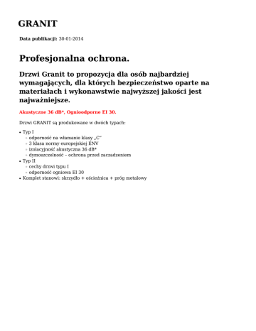 GRANIT Data publikacji: 30-01-2014 Profesjonalna ochrona. Drzwi Granit to propozycja dla osób najbardziej wymagających, dla których bezpieczeństwo oparte na materiałach i wykonawstwie najwyższej jakości jest najważniejsze. Akustyczne 36 dB*, Ognioodporne EI 30. Drzwi GRANIT są produkowane w dwóch typach: ● Typ I odporność na włamanie klasy „C” 3 klasa normy europejskiej ENV izolacyjność akustyczna 36 dB* dymoszczelność – ochrona przed zaczadzeniem Typ II cechy drzwi typu I odporność ogniowa EI 30 Komplet stanowi: skrzydło + ościeżnica + próg metalowy ❍ ❍ ❍ ❍ ● ❍ ❍ ● Konstrukcja skrzydła Rama skrzydła jest wykonana z klejonki drewna iglastego. Poszycie skrzydła stanowi specjalna płyta dwuwarstwowa wykonana z blachy aluminiowej i HDF-u. Dostępne skrzydła uzupełnione aluminiowymi intarsjami w kolorze srebrnym lub czarnym Okleiny naturalne wykończone lakierem matowym. Akcesoria w cenie skrzydła ● ● ● ● ● ● ● ● ● ● Zamek listwowy wielobolcowy klasy 4 ENV Dwie wkładki antywłamaniowe klasy „C” Klamka z szyldem antywłamaniowym Szyld górny Trzy wzmocnione zawiasy trójelementowe w kolorze srebrnym Cztery bolce antywyważeniowe Wizjer w kolorze srebrnym (opcja) Przygotowanie do skrótu maksymalnie 60 mm Dodatkowo: typ II – uszczelka puchnąca pod wpływem wysokiej temperatury na obrzeżach skrzydła (z wyjątkiem dolnej krawędzi) Ościeżnica wyposażona w próg metalowy ze stali nierdzewnej w wersji poszerzonej (120 mm) Ościeżnice ● ● Ościeżnica metalowa kątowa, o szerokości profi lu 100 mm. Wykonana z blachy stalowej, dwustronnie ocynkowanej, o grubości 1,5 mm Wyposażona w uszczelkę ognioodporną, osiem dybli montażowych i próg metalowy ze stali nierdzewnej w wersji poszerzonej (120 mm) Ościeżnica PROJEKT Uwagi ● ● ● ● Aprobata Techniczna AT-15-6043/2011, ITB Warszawa. Certyfi kat Zgodności Nr 1199/W, ITB Warszawa. W celu spełnienia warunków Aprobaty Technicznej do drzwi o izolacyjności ogniowej przez 30 minut należy stosować samozamykacz Klasa izolacyjności akustycznej Rw = 32 dB (zakres 32 ÷ 36 dB). Dopłaty ● ● ● ● ● ● ● ● ● ● ● ● ● ● rozmiar „100” *pokrycie okleiną naturalną satin pokrycie okleiną naturalną Dąb Biały (RAL 9016) ramka 1 (na 1 stronę, na dwie strony cena x 2) ramka 2 (na 1 stronę, na dwie strony cena x 2) ramka 3 (na 1 stronę, na dwie strony cena x 2) ramka 4 (na 1 stronę, na dwie strony cena x 2) intarsje srebrne w okleinach syntetycznych (na 1 stronę, na dwie strony cena x 2) intarsje srebrne w okleinach naturalnych (na 1 stronę, na dwie strony cena x 2) intarsje srebrne lub czarne wyłącznie dla kolekcji frezowane OFFICE – dotyczy modeli 6–9 rozszerzenie profi lu ościeżnicy od 101 do 150 mm rozszerzenie profi lu ościeżnicy od 151 do 270 mm rozszerzenie profi lu ościeżnicy od 271 do 390 mm klamka z szyldem, szyld górny Kolorystyka
