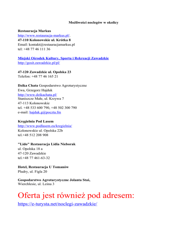 Możliwości noclegów w okolicy Restauracja Markus http://www.restauracja-markus.pl/. 47-110 Kolonowskie ul. Krótka 8 Email: [email protected] tel: +48 77 46 111 36 Miejski Ośrodek Kultury, Sportu i Rekreacji Zawadzkie http://gosit.zawadzkie.pl/pl/ 47-120 Zawadzkie ul. Opolska 23 Telefon: +48 77 46 165 21 Dzika Chata Gospodarstwo Agroturystyczne Ewa, Grzegorz Hajduk http://www.dzikachata.pl/ Staniszcze Małe, ul. Krzywa 7 47-113 Kolonowskie tel. +48 533 600 790, +48 502 300 790 e-mail: [email protected] Kręgielnia Pod Lasem http://www.podlasem.eu/kregielnia/ Kolonowskie ul. Opolska 22b tel.+48 512 208 908 "Lido" Restauracja Lidia Nieborak ul. Opolska 18 a 47-120 Zawadzkie tel.+48 77 461-63-32 Hotel, Restauracja U Tomanów Pludry, ul. Figla 20 Gospodarstwo Agroturystyczne Jolanta Staś, Wierchlesie, ul. Leśna 3 Oferta jest również pod adresem: https://e-turysta.net/noclegi-zawadzkie/