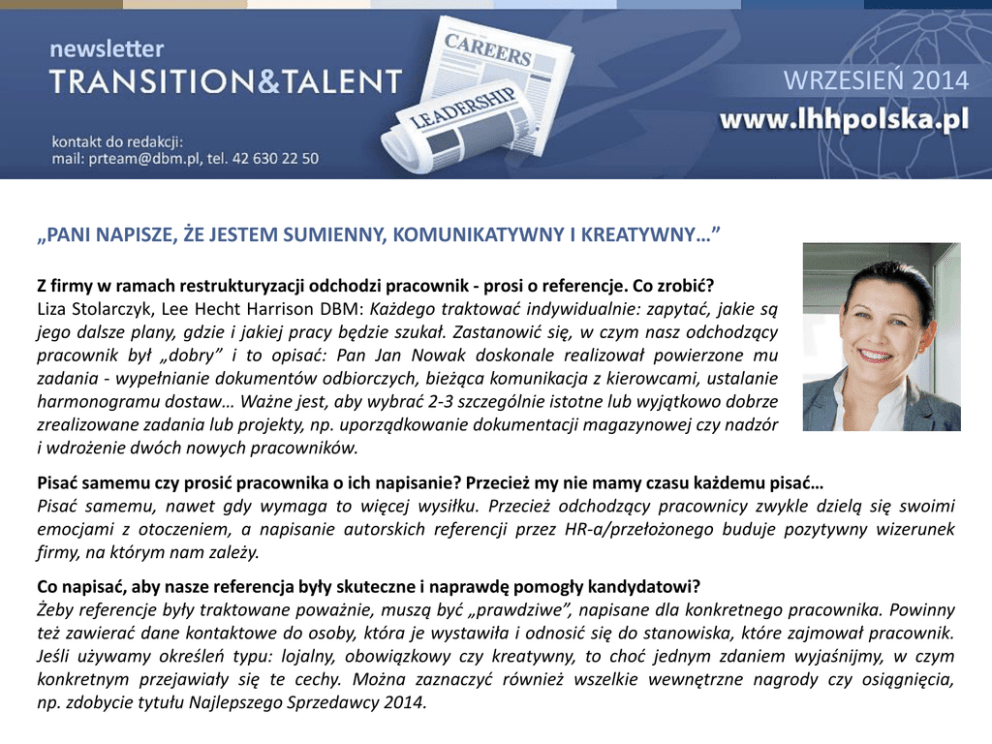 WRZESIEŃ 2014 „PANI NAPISZE, ŻE JESTEM SUMIENNY, KOMUNIKATYWNY I KREATYWNY…” Z firmy w ramach restrukturyzacji odchodzi pracownik - prosi o referencje. Co zrobić? Liza Stolarczyk, Lee Hecht Harrison DBM: Każdego traktować indywidualnie: zapytać, jakie są jego dalsze plany, gdzie i jakiej pracy będzie szukał. Zastanowić się, w czym nasz odchodzący pracownik był „dobry” i to opisać: Pan Jan Nowak doskonale realizował powierzone mu zadania - wypełnianie dokumentów odbiorczych, bieżąca komunikacja z kierowcami, ustalanie harmonogramu dostaw… Ważne jest, aby wybrać 2-3 szczególnie istotne lub wyjątkowo dobrze zrealizowane zadania lub projekty, np. uporządkowanie dokumentacji magazynowej czy nadzór i wdrożenie dwóch nowych pracowników. Pisać samemu czy prosić pracownika o ich napisanie? Przecież my nie mamy czasu każdemu pisać… Pisać samemu, nawet gdy wymaga to więcej wysiłku. Przecież odchodzący pracownicy zwykle dzielą się swoimi emocjami z otoczeniem, a napisanie autorskich referencji przez HR-a/przełożonego buduje pozytywny wizerunek firmy, na którym nam zależy. Co napisać, aby nasze referencja były skuteczne i naprawdę pomogły kandydatowi? Żeby referencje były traktowane poważnie, muszą być „prawdziwe”, napisane dla konkretnego pracownika. Powinny też zawierać dane kontaktowe do osoby, która je wystawiła i odnosić się do stanowiska, które zajmował pracownik. Jeśli używamy określeń typu: lojalny, obowiązkowy czy kreatywny, to choć jednym zdaniem wyjaśnijmy, w czym konkretnym przejawiały się te cechy. Można zaznaczyć również wszelkie wewnętrzne nagrody czy osiągnięcia, np. zdobycie tytułu Najlepszego Sprzedawcy 2014. „PANI NAPISZE…” - c.d. Nie radzimy rozpisywać się o powodach odejścia, bo po pierwsze nie wiemy, czy pracownik sobie tego życzy, a po drugie to kwestia, która zwykle budzi emocje. Jedyny wyjątek od tej reguły to sytuacja, gdy odchodzący sam o to prosi, bo chce pokazać przyszłemu pracodawcy, że zmienia pracę nie ze swojej winy, a w wyniku obiektywnych okoliczności np. likwidacji zakładu czy zamknięcia linii biznesowej. Jak długie powinny być referencje? Ok. ¾ strony. Jeśli rekruter lub przyszły pracodawca będą zainteresowani szczegółami, mogą zadzwonić i dopytać. Tekst trzeba profesjonalnie sformatować, koniecznie na firmowym papierze. A gdy pracownik został zwolniony dyscyplinarnie i prosi o referencje? Gdy napiszemy negatywne referencje, pracownik i tak ich nie wykorzysta, a jeszcze ryzykujemy, że zacznie z nimi polemizować. Można by pominąć negatywy i próbować opisać tylko jakieś pozytywne cechy, ale to też ryzykowne, bo skoro był tak dobry, to czemu odchodzi… Myślę, że w takiej sytuacji lepiej szczerze porozmawiać z pracownikiem. Generalnie przypadki pracowników zwolnionych dyscyplinarnie a proszących o referencje mogą występować w sytuacjach, gdy powód rozstania nie został jasno zakomunikowany, a sam proces przeprowadzono w „zagmatwany” sposób. źródło:sxc.hu Od 2 lutego 1996 r. pracodawca nie ma formalnego obowiązku wystawiania opinii pracownikowi. Obecnie zależy to wyłącznie od dobrej woli pracodawcy. Co więcej, pracownik nie może odwołać się w tej sprawie do sądu pracy, ponieważ w roku 1996 uchylony został art. 98 Kodeksu Pracy dotyczący wydawania opinii o pracowniku. Sąd Najwyższy w wyroku z 21 stycznia 2003 r. (I PK 66/02, OSNP 2004/13/227) podkreślił natomiast, że nie kwestionuje „(...) jednak prawa pracownika do żądania od zakładu pracy, który go zatrudnia lub zatrudniał, wydania o nim opinii, gdy dla uzyskania innej pracy jest mu ona potrzebna.” MIĘKKI HR PRZY ZMIANIE KOMPUTERA Nikt nie spodziewał się, że wprowadzenie nowego systemu informatycznego wzbudzi tak wielkie emocje. I taki opór. Sytuacja robiła się na tyle kryzysowa, że mogła zagrozić bieżącemu działaniu firmy. Gdy w trakcie warsztatów z Zarządem krok po kroku zaczęliśmy analizować zmiany, jakie w firmie zaszły, wątek „technologiczny” odsłonił drugie dno. Nowe procedury informatyczne nie stanowiły same w sobie problemu, ale niosły ze sobą zmianę w funkcjonowaniu kultury organizacyjnej i stylu pracy. Pojawiły się pytania: jak będę teraz oceniany i rozliczany? Jak mam budować swoją pozycję w firmie? Czy w ogóle będę potrzebny w tym nowym rozdaniu? Oporujący przed zmianą technologiczną pracownicy de facto wyrażali sprzeciw przeciwko zmianie kulturowej. Często bardzo trudno to sobie uzmysłowić, bo w sposób naturalny zmiany w IT postrzegane są jako czysto „techniczne”. Tymczasem perspektywa pracownika bywa zgoła inna: 1. co się tak naprawdę dla niego zmienia, 2. do czego nigdy otwarcie się nie przyzna, 3. a przed czym będzie się buntował. źródło:sxc.hu MŁODY MENEDŻER SENIOREM Kiedyś coachingi zamawiano jako nagrodę lub jako szansę na rozwój konkretnego menedżera. Dziś do puli przyczyn, głównie za sprawą centrów BPO, dołączyła potrzeba budowania seniority. Jednogłośnie takie zapotrzebowanie zgłaszają zarówno działy HR, jak i uczestnicy programów oraz ich szefowie. Co kryje się za hasłem seniority? Budowanie wizerunku, autorytetu, a w konsekwencji własnej pozycji poza organizacją (w stosunku do partnerów biznesowych i klientów), ale również wobec klientów wewnętrznych, głównie z równorzędnych i wyższych stanowisk. Praca nad lepszą komunikacją, pewnością siebie, wywieraniem wpływu, gotowością do podejmowania strategicznych decyzji - to wszystko ma ułatwić menedżerom stawanie się partnerami dla zarządzających firmą, a nie tylko dostawcami i wykonawcami. Ta potrzeba widoczna jest szczególnie w organizacjach, które dynamicznie się rozwijają, a korzystający z coachingu menedżerowie niedawno awansowali, właśnie awansują lub wiedzą, że wraz z rozwojem organizacji ich rola będzie rosła. I nie chcą być tylko l