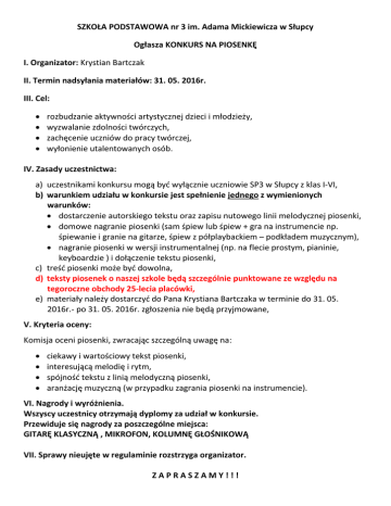 SZKOŁA PODSTAWOWA nr 3 im. Adama Mickiewicza w Słupcy Ogłasza KONKURS NA PIOSENKĘ I. Organizator: Krystian Bartczak II. Termin nadsyłania materiałów: 31. 05. 2016r. III. Cel: rozbudzanie aktywności artystycznej dzieci i młodzieży, wyzwalanie zdolności twórczych, zachęcenie uczniów do pracy twórczej, wyłonienie utalentowanych osób. IV. Zasady uczestnictwa: a) uczestnikami konkursu mogą być wyłącznie uczniowie SP3 w Słupcy z klas I-VI, b) warunkiem udziału w konkursie jest spełnienie jednego z wymienionych warunków: dostarczenie autorskiego tekstu oraz zapisu nutowego linii melodycznej piosenki, domowe nagranie piosenki (sam śpiew lub śpiew + gra na instrumencie np. śpiewanie i granie na gitarze, śpiew z półplaybackiem – podkładem muzycznym), nagranie piosenki w wersji instrumentalnej (np. na flecie prostym, pianinie, keyboardzie ) i dołączenie tekstu piosenki, c) treść piosenki może być dowolna, d) teksty piosenek o naszej szkole będą szczególnie punktowane ze względu na tegoroczne obchody 25-lecia placówki, e) materiały należy dostarczyć do Pana Krystiana Bartczaka w terminie do 31. 05. 2016r.- po 31. 05. 2016r. zgłoszenia nie będą przyjmowane, V. Kryteria oceny: Komisja oceni piosenki, zwracając szczególną uwagę na: ciekawy i wartościowy tekst piosenki, interesującą melodię i rytm, spójność tekstu z linią melodyczną piosenki, aranżację muzyczną (w przypadku zagrania piosenki na instrumencie). VI. Nagrody i wyróżnienia. Wszyscy uczestnicy otrzymają dyplomy za udział w konkursie. Przewiduje się nagrody za poszczególne miejsca: GITARĘ KLASYCZNĄ , MIKROFON, KOLUMNĘ GŁOŚNIKOWĄ VII. Sprawy nieujęte w regulaminie rozstrzyga organizator. ZAPRASZAMY!!!