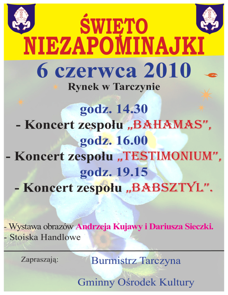 ŚWIĘTO NIEZAPOMINAJKI 6 czerwca 2010 Rynek w Tarczynie godz. 14.30 - Koncert zespołu „Bahamas”, godz. 16.00 - Koncert zespołu „Testimonium”, godz. 19.15 - Koncert zespołu „Babsztyl”. - Wystawa obrazów Andrzeja Kujawy i Dariusza Sieczki. - Stoiska Handlowe Zapraszają: Burmistrz Tarczyna Gminny Ośrodek Kultury