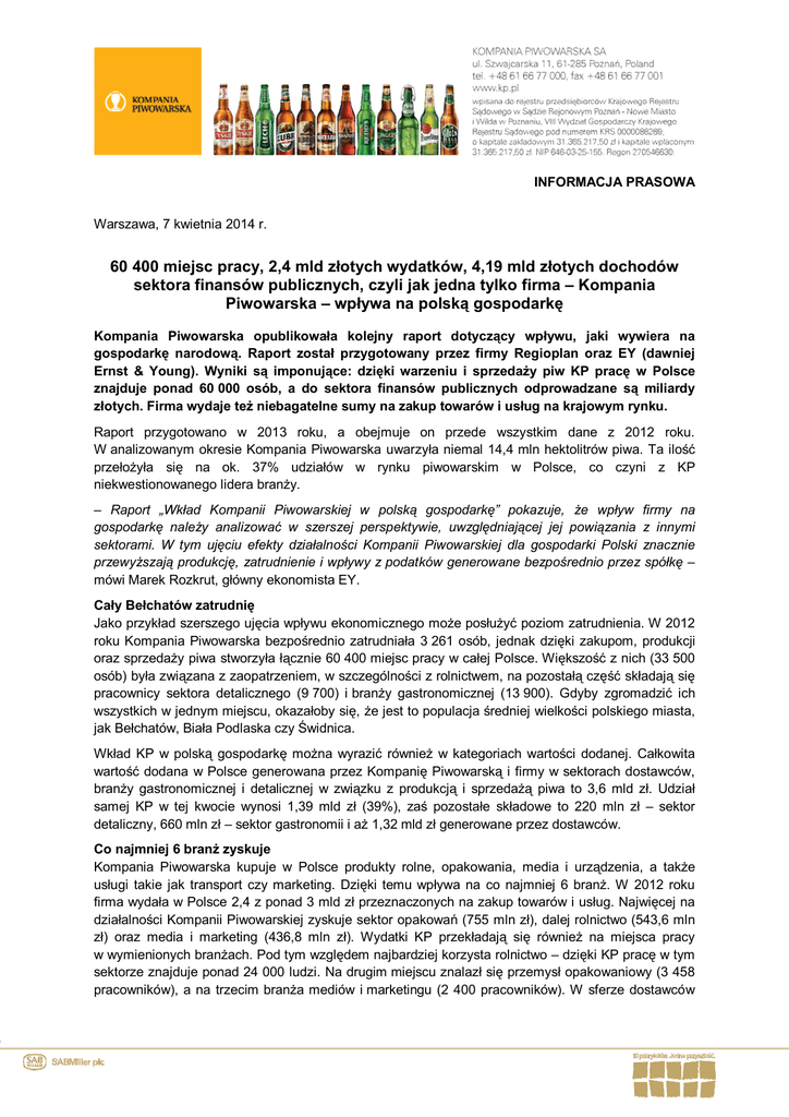 INFORMACJA PRASOWA Warszawa, 7 kwietnia 2014 r. 60 400 miejsc pracy, 2,4 mld złotych wydatków, 4,19 mld złotych dochodów sektora finansów publicznych, czyli jak jedna tylko firma – Kompania Piwowarska – wpływa na polską gospodarkę Kompania Piwowarska opublikowała kolejny raport dotyczący wpływu, jaki wywiera na gospodarkę narodową. Raport został przygotowany przez firmy Regioplan oraz EY (dawniej Ernst & Young). Wyniki są imponujące: dzięki warzeniu i sprzedaży piw KP pracę w Polsce znajduje ponad 60 000 osób, a do sektora finansów publicznych odprowadzane są miliardy złotych. Firma wydaje też niebagatelne sumy na zakup towarów i usług na krajowym rynku. Raport przygotowano w 2013 roku, a obejmuje on przede wszystkim dane z 2012 roku. W analizowanym okresie Kompania Piwowarska uwarzyła niemal 14,4 mln hektolitrów piwa. Ta ilość przełożyła się na ok. 37% udziałów w rynku piwowarskim w Polsce, co czyni z KP niekwestionowanego lidera branży. – Raport „Wkład Kompanii Piwowarskiej w polską gospodarkę” pokazuje, że wpływ firmy na gospodarkę należy analizować w szerszej perspektywie, uwzględniającej jej powiązania z innymi sektorami. W tym ujęciu efekty działalności Kompanii Piwowarskiej dla gospodarki Polski znacznie przewyższają produkcję, zatrudnienie i wpływy z podatków generowane bezpośrednio przez spółkę – mówi Marek Rozkrut, główny ekonomista EY. Cały Bełchatów zatrudnię Jako przykład szerszego ujęcia wpływu ekonomicznego może posłużyć poziom zatrudnienia. W 2012 roku Kompania Piwowarska bezpośrednio zatrudniała 3 261 osób, jednak dzięki zakupom, produkcji oraz sprzedaży piwa stworzyła łącznie 60 400 miejsc pracy w całej Polsce. Większość z nich (33 500 osób) była związana z zaopatrzeniem, w szczególności z rolnictwem, na pozostałą część składają się pracownicy sektora detalicznego (9 700) i branży gastronomicznej (13 900). Gdyby zgromadzić ich wszystkich w jednym miejscu, okazałoby się, że jest to populacja średniej wielkości polskiego miasta, jak Bełchatów, Biała Podlaska czy Świdnica. Wkład KP w polską gospodarkę można wyrazić również w kategoriach wartości dodanej. Całkowita wartość dodana w Polsce generowana przez Kompanię Piwowarską i firmy w sektorach dostawców, branży gastronomicznej i detalicznej w związku z produkcją i sprzedażą piwa to 3,6 mld zł. Udział samej KP w tej kwocie wynosi 1,39 mld zł (39%), zaś pozostałe składowe to 220 mln zł – sektor detaliczny, 660 mln zł – sektor gastronomii i aż 1,32 mld zł generowane przez dostawców. Co najmniej 6 branż zyskuje Kompania Piwowarska kupuje w Polsce produkty rolne, opakowania, media i urządzenia, a także usługi takie jak transport czy marketing. Dzięki temu wpływa na co najmniej 6 branż. W 2012 roku firma wydała w Polsce 2,4 z ponad 3 mld zł przeznaczonych na zakup towarów i usług. Najwięcej na działalności Kompanii Piwowarskiej zyskuje sektor opakowań (755 mln zł), dalej rolnictwo (543,6 mln zł) oraz media i marketing (436,8 mln zł). Wydatki KP przekładają się również na miejsca pracy w wymienionych branżach. Pod tym względem najbardziej korzysta rolnictwo – dzięki KP pracę w tym sektorze znajduje ponad 24 000 ludzi. Na drugim miejscu znalazł się przemysł opakowaniowy (3 458 pracowników), a na trzecim branża mediów i marketingu (2 400 pracowników). W sferze dostawców towarów i usług działalność KP generuje łącznie 33 500 miejsc pracy – więcej niż wynosi liczba mieszkańców najmniejszych państw Europy, czyli San Marino lub Monako. Sprzedaż piwa Kompanii Piwowarskiej daje ponadto zatrudnienie 13 900 osobom w branży gastronomicznej, w której generuje przychody w wysokości ok. 1,54 mld zł. Ponad trzykrotnie więcej, czyli ok. 5,44 mld zł, konsumenci wydają na piwa różnych marek Kompanii Piwowarskiej w punktach sprzedaży detalicznej. W tym sektorze sprzedaż piwa generuje około 9 700 miejsc pracy. Oddziaływanie regionalne Bardzo silny wpływ na gospodarkę Kompania Piwowarska wywiera w regionach, w których zlokalizowane są jej browary, czyli na Górnym Śląsku (browar w Tychach), w Wielkopolsce (browar w Poznaniu) oraz na Podlasiu (browar w Białymstoku). Oprócz 1 300 miejsc pracy w samych browarach, funkcjonowaniu firmy w tych trzech regionach można przypisać 6 700 miejsc pracy. Na działalności Kompanii Piwowarskiej zyskują także inne regiony: Lubelszczyzna, Pomorze, Opolskie, Dolny Śląsk, Warmia i Mazury, a także Pomorze Zachodnie. To tutaj KP kupuje słód i chmiel potrzebne do warzenia piwa. Pendolino za piwo Za sprawą działalności biznesowej Kompanii Piwowarskiej generowane są miliardy złotych dochodów sektora finansów publicznych. Jak wynika z obliczeń EY, w 2012 r. sektor ten uzyskał dzięki Kompanii Piwowarskiej 4,19 mld zł. Ta suma wystarczyłaby na zakup 50 wagonów pendolino albo aż 150 samolotów bezzałogowych dla polskiej armii*. Na wspomnianą kwotę złożyły się wpływy z akcyzy i podatku VAT od produkcji i sprzedaży piwa (2,97 mld zł) oraz podatki związane z wynagrodzeniami, od osób prawnych, środowiskowe i inne (1,25 mld zł) – Kompania Piwowarska jest liderem branży w Polsce, ponieważ warzenie dobrego piwa to nasza pasja. Cieszymy się, że dzięki niej możemy wpływać na polską rzeczywistość gospodarczą w tak dużym stopniu. Wykorzystanie lokalnych surowców czy współpraca z lokalnymi dostawcami towarów i usług to dla nas priorytet i – w miarę rozwoju naszej firmy – chcemy rozszerzać tę współpracę, by ten wkład był jeszcze większy – podsumowuje raport Wojtek Mrugalski, kierownik ds. komunikacji Kompanii Piwowarskiej. Browary wspomagają gospodarkę Europy Na podobnych zasadach Grupa SABMiller oddziałuje na gospodarkę Europy. Z produkcją i sprzedażą piw SABMiller, który prowadzi na naszym kontynencie 17 browarów, związanych jest ok. 