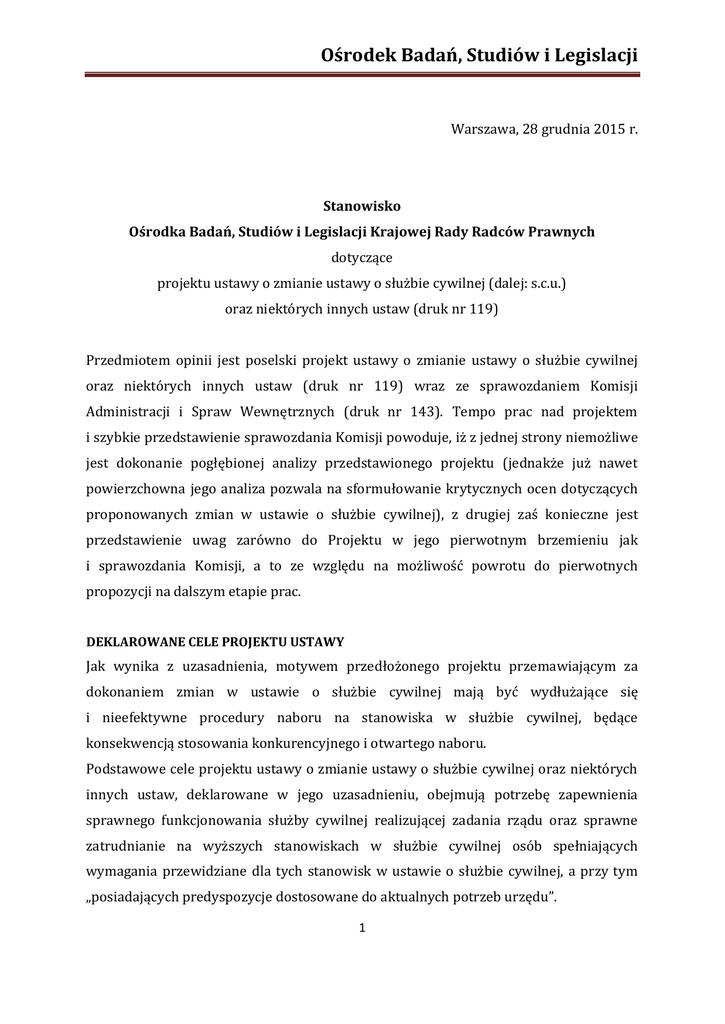 Ośrodek Badań, Studiów i Legislacji Warszawa, 28 grudnia 2015 r. Stanowisko Ośrodka Badań, Studiów i Legislacji Krajowej Rady Radców Prawnych dotyczące projektu ustawy o zmianie ustawy o służbie cywilnej (dalej: s.c.u.) oraz niektórych innych ustaw (druk nr 119) Przedmiotem opinii jest poselski projekt ustawy o zmianie ustawy o służbie cywilnej oraz niektórych innych ustaw (druk nr 119) wraz ze sprawozdaniem Komisji Administracji i Spraw Wewnętrznych (druk nr 143). Tempo prac nad projektem i szybkie przedstawienie sprawozdania Komisji powoduje, iż z jednej strony niemożliwe jest dokonanie pogłębionej analizy przedstawionego projektu (jednakże już nawet powierzchowna jego analiza pozwala na sformułowanie krytycznych ocen dotyczących proponowanych zmian w ustawie o służbie cywilnej), z drugiej zaś konieczne jest przedstawienie uwag zarówno do Projektu w jego pierwotnym brzemieniu jak i sprawozdania Komisji, a to ze względu na możliwość powrotu do pierwotnych propozycji na dalszym etapie prac. DEKLAROWANE CELE PROJEKTU USTAWY Jak wynika z uzasadnienia, motywem przedłożonego projektu przemawiającym za dokonaniem zmian w ustawie o służbie cywilnej mają być wydłużające się i nieefektywne procedury naboru na stanowiska w służbie cywilnej, będące konsekwencją stosowania konkurencyjnego i otwartego naboru. Podstawowe cele projektu ustawy o zmianie ustawy o służbie cywilnej oraz niektórych innych ustaw, deklarowane w jego uzasadnieniu, obejmują potrzebę zapewnienia sprawnego funkcjonowania służby cywilnej realizującej zadania rządu oraz sprawne zatrudnianie na wyższych stanowiskach w służbie cywilnej osób spełniających wymagania przewidziane dla tych stanowisk w ustawie o służbie cywilnej, a przy tym „posiadających predyspozycje dostosowane do aktualnych potrzeb urzędu”. 1 Ośrodek Badań, Studiów i Legislacji PROPONOWANE W PIERWOTNYM PROJEKCIE SZCZEGÓŁOWE REGULACJE NORMATYWNE Z wyżej wskazanych względów uzasadnione jest odniesienie się do propozycji zawartych w pierwotnej wersji Projektu. Należy odnotować, iż propozycje te zostały odrzucone na etapie prac w Komisji i nie znalazły się w przedłożonym projekcie, i należy mieć nadzieję, iż nie powrócą na dalszym etapie prac, ze względu na ich oczywistą sprzeczność z Konstytucją. Realizacja deklarowanych celów ustawy miała mieć miejsce poprzez proponowane rozwiązania szczegółowe, z których wymienić należy: obsadzanie wyższych stanowisk w służbie cywilnej, np. dyrektora generalnego urzędu, w drodze powołania, a nie konkursu, zwolnienie osób zajmujących wyższe stanowiska w służbie cywilnej z obowiązku poddania się ocenie okresowej, wygaszenie stosunków pracy z osobami zajmującymi w dniu jej wejścia w życie wyższe stanowiska w służbie cywilnej (oraz kierownicze stanowiska w służbie zagranicznej, będące wyższymi stanowiskami w służbie cywilnej) po upływie 30 dni od wejścia w życie nowelizacji, jeżeli do tego czasu nie zostaną im zaproponowane nowe warunki pracy lub płacy na dalszy okres albo w razie nieprzyjęcia nowych warunków Szczególne zastrzeżenia w tym kontekście budziło: 1. obsadzanie wyższych stanowisk w służbie cywilnej w drodze powołania, a nie otwartego konkursu, Taka regulacja łączy się z ryzykiem stosowania kryterium preferencji politycznych przy obsadzaniu stanowisk, co niedwuznacznie wynika także z uzasadnienia projektu. Tymczasem uniezależnienie obsadzania stanowisk w służbie publicznej od kryteriów politycznych stanowi konieczny warunek bezstronności politycznej i kompetencji tej służby (zob. wyrok z 16 czerwca 2003 r., sygn. K 52/02, OTK ZU nr 6/A/2003, poz. 54, pkt 3 uzasadnienia). Zarówno wymóg apolityczności służby cywilnej jak i zapewnienie równego, konkurencyjnego naboru do niej były 2 wielokrotnie przedmiotem analizy Ośrodek Badań, Studiów i Legislacji w orzecznictwie Sądu Najwyższego i Trybunału Konstytucyjnego. Szczególnie znamienne w tym kontekście są niżej przytoczone orzeczenia, ze względu na wagę prezentowanej argumentacji przytaczane in extenso. Sąd Najwyższy w wyroku z dnia 13 grudnia 2010 r., III KRS 17/10 stwierdził, iż celem art. 60 Konstytucji jest zapewnienie równości szans dla osób podejmujących starania o pełnienie funkcji w służbie publicznej, a realizacja art. 60 Konstytucji z jednej strony wymaga od ustawodawcy ustanowienia regulacji materialnoprawnych, określających przejrzyste kryteria selekcji kandydatów i obsadzania poszczególnych stanowisk w służbie publicznej, a z drugiej strony nakazuje stworzenie odpowiednich gwarancji proceduralnych, zapewniających weryfikowalność decyzji w sprawie naboru do służby. Proponowana regulacja może prowadzić do nadmiernej arbitralności w obsadzaniu stanowisk w służbie cywilnej, czyniąc nadrzędnym, a przy tym nieujawnianym oficjalnie kryterium poglądy polityczne kandydata, ograniczając jednocześnie możliwość zewnętrznej weryfikacji obiektywności procedury naboru i eliminując bezstronność kandydata. 2. wygaszenie stosunków pracy z osobami zajmującymi w dniu jej wejścia w życie wyższe stanowiska w służbie cywilnej Regulacje projektu ustawy, skutkujące wygaszeniem stosunków pracy z osobami zajmującymi w dniu jej wejścia w życie wyższe stanowiska w służbie cywilnej po upływie 30 dni od wejścia w życie nowelizacji, jeżeli do tego czasu nie zostaną im zaproponowane nowe warunki pracy lub płacy na dalszy okres albo w razie nieprzyjęcia nowych warunków, muszą być oceniane negatywnie z kilku względów. Po pierwsze naruszają w ogólności gwarancje stabilności zatrudnienia nierozerwalnie związane z istotą służby cywilnej. Po drugie, mogą być wykorzystane do wyeliminowania z grona osób należących do służby cywilnej tych, których poglądy nie są zgodne z aktualną linią polityczną, co w skrajnych wypadkach mogłoby prowadzić wręcz do 