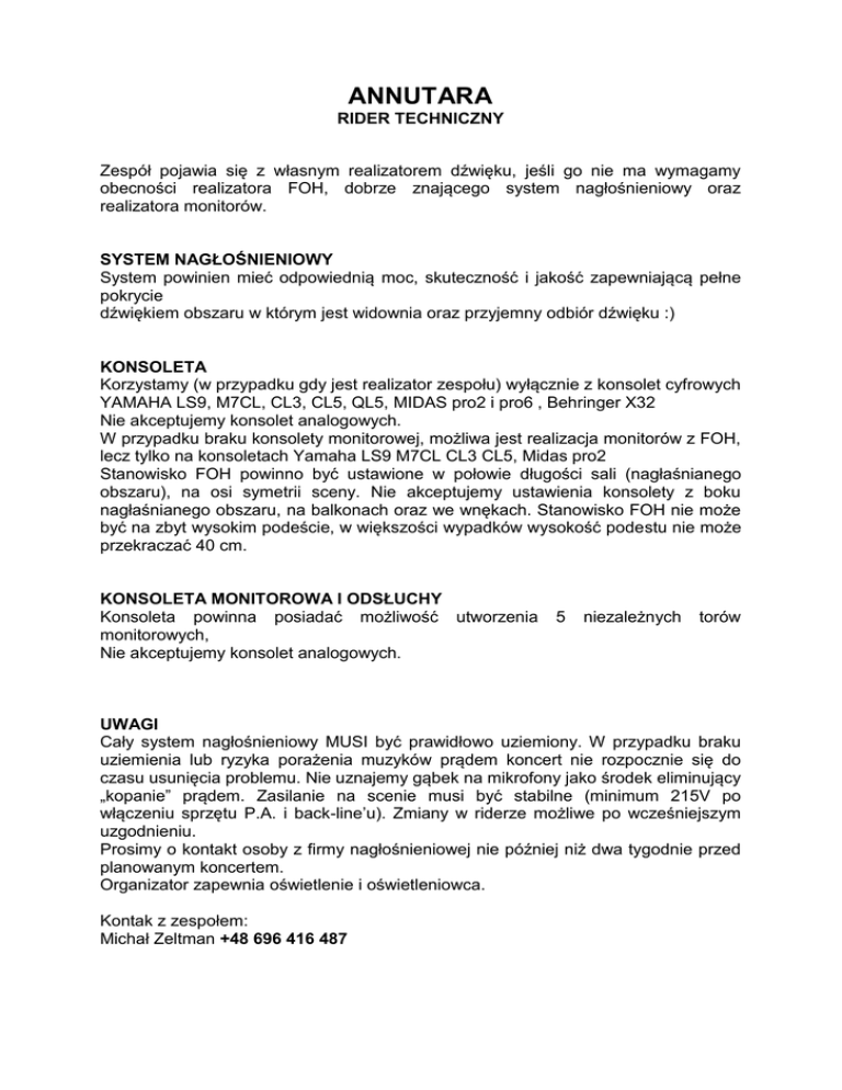 ANNUTARA RIDER TECHNICZNY Zespół pojawia się z własnym realizatorem dźwięku, jeśli go nie ma wymagamy obecności realizatora FOH, dobrze znającego system nagłośnieniowy oraz realizatora monitorów. SYSTEM NAGŁOŚNIENIOWY System powinien mieć odpowiednią moc, skuteczność i jakość zapewniającą pełne pokrycie dźwiękiem obszaru w którym jest widownia oraz przyjemny odbiór dźwięku :) KONSOLETA Korzystamy (w przypadku gdy jest realizator zespołu) wyłącznie z konsolet cyfrowych YAMAHA LS9, M7CL, CL3, CL5, QL5, MIDAS pro2 i pro6 , Behringer X32 Nie akceptujemy konsolet analogowych. W przypadku braku konsolety monitorowej, możliwa jest realizacja monitorów z FOH, lecz tylko na konsoletach Yamaha LS9 M7CL CL3 CL5, Midas pro2 Stanowisko FOH powinno być ustawione w połowie długości sali (nagłaśnianego obszaru), na osi symetrii sceny. Nie akceptujemy ustawienia konsolety z boku nagłaśnianego obszaru, na balkonach oraz we wnękach. Stanowisko FOH nie może być na zbyt wysokim podeście, w większości wypadków wysokość podestu nie może przekraczać 40 cm. KONSOLETA MONITOROWA I ODSŁUCHY Konsoleta powinna posiadać możliwość utworzenia monitorowych, Nie akceptujemy konsolet analogowych. 5 niezależnych torów UWAGI Cały system nagłośnieniowy MUSI być prawidłowo uziemiony. W przypadku braku uziemienia lub ryzyka porażenia muzyków prądem koncert nie rozpocznie się do czasu usunięcia problemu. Nie uznajemy gąbek na mikrofony jako środek eliminujący „kopanie” prądem. Zasilanie na scenie musi być stabilne (minimum 215V po włączeniu sprzętu P.A. i back-line’u). Zmiany w riderze możliwe po wcześniejszym uzgodnieniu. Prosimy o kontakt osoby z firmy nagłośnieniowej nie później niż dwa tygodnie przed planowanym koncertem. Organizator zapewnia oświetlenie i oświetleniowca. Kontak z zespołem: Michał Zeltman +48 696 416 487 ANNUTARA INPUT LISTA: LP. 1 2 3 4 5 6 7 8 9 10 11 INSTRUMENT BD SN OH 1 OH 2 KONTRABAS AKORDEON L AKORDEON R GITARA AKUSTYCZNA II SKRZYPCE TRĄBKA SKRZYPCE 12 13 14 15 16 17 18 VOC 1 VOC 2 VOC 3 INSTR. PERKUSYJNE ZENKO BĘBEN SZAMAŃSKI 1 BĘBEN SZAMAŃSKI 2 MIC/D.I.-BOX Typowy do BD SHURE SK 57 Pojemnościowy Pojemnościowy D.I. BOX własny własny D.I. BOX ATM 350 EV RE20/SHURE SM57 Przystawka Fishman V-200 (własna) Beta 58 Beta 58 Beta 58 Pojemnościowy SHURE SM57 ATM 350 ATM 350 STATYWY mały Krótki łamany Długi łamany Długi łamany Długi łamany Długi łamany Długi łamany Długi łamany Długi łamany Długi łamany -