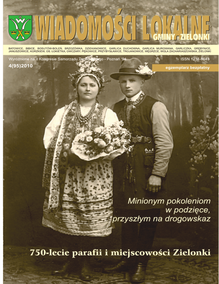 750-lecie Zielonek OKIEM WÓJTA Szanowni Państwo, Obecne wydanie Wiadomości Lokal− nych Gminy Zielonki jest poświęcone rocz− nicy 750 − lecia istnienia parafii w Zielon− kach i związanej z nią miejscowości Zie− lonki. Wszelkie działania inwestycyjne gminy, liczne inicjatywy pozwalające po− prawiać w poszczególnych miejscowo− ściach warunki zamieszkania są bardzo ważne, ale ważna jest też historia miejsco− wości i terenów, na których w 1973 roku ukształtowana została nasza wspólnota samorządowa, nasza mała podkrakowska ojczyzna. Wycho− dząc naprzeciw potrzebie zebrania wiedzy historycznej o naszych tere− nach w ubiegłym roku wydaliśmy pierwszą monografię gminy Zielon− ki. Zawiera ona dzieje tej pięknej ziemi, wiele ciekawych opisów, szereg dawnych zdjęć i kopie map wykonanych przez austriackich geodetów z połowy XIX wieku, kiedy Polska była pod zaborami. Monografia autorstwa Mateusza Wyżgi napisana i ilustrowana wieloma zdjęciami z dawnych lat mogła być wydana też dzięki uprzejmości wielu osób, które udostępniły swoje rodzinne pamiątki. Sama książkę można nabyć przy okazji różnych imprez gminnych, w siedzibie Centrum Kultury, Promocji i Rekreacji, czy też zamówić przesyłkę. Zachęcam do lektury tej książki, ale przy tej okazji proszę też o dalsze udostępnianie starych zdjęć, może opisów, może eksponatów lub pamiątek rodzinnych w celu ich zeskanowania czy sfotografowania. Dzięki temu możemy wzboga− cać zasoby i wiedzę o historii i tradycji naszych terenów oraz ludzi, którzy w przeszłości tutaj zamieszkiwali. W czasach powojennych dla dzisiejszego obrazu i poziomu rozwo− ju naszej gminy miały decydujące znaczenie dwa ważne fakty. Pierwszy kluczowy to utworzenie w 1973 roku obecnych granic gminy i zaanga− żowanie ówczesnych mieszkańców przeciwko zakusom wielkiego Kra− kowa włączenia przygranicznych obszarów w granice miasta. Drugi ważny moment to powołanie do życia w 1990 roku samorządów gmin− nych, nadanie im kompe− tencji i określenie zasad gromadzenia dochodów i zasad planowania wy− datków. Przez te dwadzie− ścia lat własnej samorząd− ności gmina Zielonki zna− cząco się zmieniła, udało się zrealizować wiele ważnych i potrzebnych inwestycji generujących dalszy rozwój i kolejne potrzeby oraz wyzwania. W tym okresie nasz samo− rząd dziewięć razy plaso− wał się w tzw. złotej setce polskich samorządów w rankingu ogłaszanym przez dziennik Rzeczpo− spolita, a w ostatnich czte− rech latach w pierwszej dziesiątce na ponad 1600 gmin wiejskich. Rozwój i działania gminy były i są możliwe dzięki aktywnym, wspaniałym miesz− kańcom, którzy nie szczędzili wczoraj i nie szczędzą dzisiaj sił i środ− ków na rzecz dynamicznego rozwoju obszaru, na którym mieszkają, na rzecz poprawy warunków do wygodnego i lepszego komfortu zamiesz− kania, pracy i wypoczynku. Bogusław Król Pożegnanie Józef Grudzień 1961−2010 Smutno nam będzie bez Ciebie 25 lipca 2010 roku, o pierwszym brzasku, zmarł Józef Gru− dzień mieszkaniec ul. Zielona Droga w Brzozówce i członek Koła Przyjaciół Brzozówki. Miał zaledwie 49 lat. Śmierć upomniała się o niego nagle, w połowie drogi, w samym środku życia pełnego działania i planów na przyszłość. Rodzina Grudniów zamieszkuje w Brzozówce od wielu pokoleń parając się rzemiosłem i rolnictwem. Tu rodziły się nowe pokolenia, budowali nowe do− mostwa, wrastali w lokalną społeczność. I nigdy na potrzeby tej społeczności nie byli obojętni. Śp. Józef angażował się i uczestniczył we wszystkich przedsię− wzięciach ostatnich lat − w budowę domu wielofunkcyjnego, drogi, kapliczki. Zaan− gażowany we wszystkie sprawy lokalne i sąsiedzkie cieszył się sympatią i szacun− kiem mieszkańców. Zapraszano go na wszystkie uroczystości, a szczególnie na wesela, gdzie pełnił, trzeba to przyznać − w sposób bardzo niekonwencjonalny i daleko wykraczający poza zwyczajowe obowiązki, urząd starosty weselnego. Tak, lubiliśmy go i szanowali. W czasie mszy świętej żałobnej kościół w Korzkwi i plac przed świątynią pełen był ludzi. Orkiestra, chór, rodzina i przyja− ciele. W czasie kazania ks. Wojciech Zyzak podkreślił wzorową posta− wę katolicką śp. Józefa Grudnia, jego zaangażowanie w życie parafii, udział w chórze kościelnym, uroczystościach i we wszystkich inicjaty− wach i przedsięwzięciach parafii. Kiedy powstało Koło Przyjaciół Brzozówki Józef i jego żona byli WIADOMOŚCI LOKALNE GMINY ZIELONKI 2 członkami − założycielami naszego stowarzyszenia. Józef, jak zwykle, tak i w naszym kole, nie pozostał szeregowym członkiem. Był człowiekiem wesołym i towarzyskim, obdarzonym ogromnym poczuciem humoru i zdolnością do satyrycznych obserwacji. Ale przede wszystkim miał ta− lent − sceniczny i dramatyczny. I te swoje umiejętności w całości zaanga− żował w działalność chóru i zespołu tanecznego, który działa w ramach Koła Przyjaciół Brzozówki. Okazjonalne i dożynkowe występy tego ze− społu zyskały dzięki niemu scenki pełne humoru, dobrodusznych docin− ków i satyrycznych obserwacji rzeczywistości. Józef był po trosze ich pomysłodawcą, autorem i wykonawcą. Ale przy tym człowiekiem skrom− nym i pełnym dystansu do swojej pracy i działalności. Z całą pewnością można powiedzieć, że odcisnął na działalności tego zespołu swoje indy− widualne piętno i pozostawił w nim część swojego serca. Dlatego będzie− my go pamiętać. Ale smutno nam będzie bez Ciebie. Koło Przyjaciół Brzozówki żegna Cię słowami Czesława Miłosza: „Tak mało powiedziałem, Nie zdążyłem… Serce nie wytrzymało.” Członkowie Koła Przyjaciół Brzozówki Składam wyrazy wdzięczności Wszystkim, którzy wspierali mnie i całą rodzinę biorąc udział w pogrzebie Moj