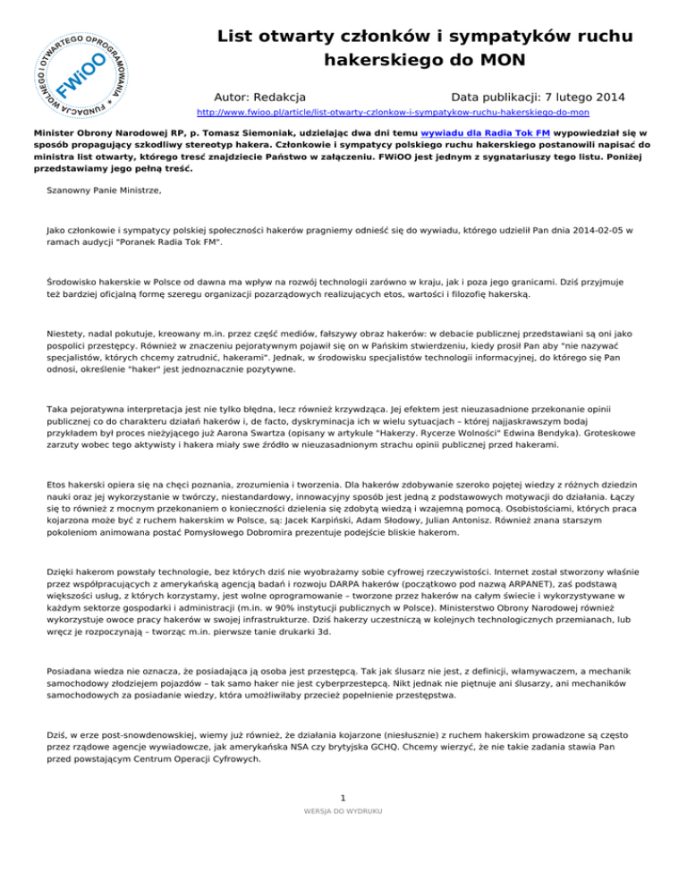 List otwarty członków i sympatyków ruchu hakerskiego do MON Autor: Redakcja Data publikacji: 7 lutego 2014 http://www.fwioo.pl/article/list-otwarty-czlonkow-i-sympatykow-ruchu-hakerskiego-do-mon Minister Obrony Narodowej RP, p. Tomasz Siemoniak, udzielając dwa dni temu wywiadu dla Radia Tok FM wypowiedział się w sposób propagujący szkodliwy stereotyp hakera. Członkowie i sympatycy polskiego ruchu hakerskiego postanowili napisać do ministra list otwarty, którego tresć znajdziecie Państwo w załączeniu. FWiOO jest jednym z sygnatariuszy tego listu. Poniżej przedstawiamy jego pełną treść. Szanowny Panie Ministrze, Jako członkowie i sympatycy polskiej społeczności hakerów pragniemy odnieść się do wywiadu, którego udzielił Pan dnia 2014-02-05 w ramach audycji "Poranek Radia Tok FM". Środowisko hakerskie w Polsce od dawna ma wpływ na rozwój technologii zarówno w kraju, jak i poza jego granicami. Dziś przyjmuje też bardziej oficjalną formę szeregu organizacji pozarządowych realizujących etos, wartości i filozofię hakerską. Niestety, nadal pokutuje, kreowany m.in. przez część mediów, fałszywy obraz hakerów: w debacie publicznej przedstawiani są oni jako pospolici przestępcy. Również w znaczeniu pejoratywnym pojawił się on w Pańskim stwierdzeniu, kiedy prosił Pan aby "nie nazywać specjalistów, których chcemy zatrudnić, hakerami". Jednak, w środowisku specjalistów technologii informacyjnej, do którego się Pan odnosi, określenie "haker" jest jednoznacznie pozytywne. Taka pejoratywna interpretacja jest nie tylko błędna, lecz również krzywdząca. Jej efektem jest nieuzasadnione przekonanie opinii publicznej co do charakteru działań hakerów i, de facto, dyskryminacja ich w wielu sytuacjach – której najjaskrawszym bodaj przykładem był proces nieżyjącego już Aarona Swartza (opisany w artykule "Hakerzy. Rycerze Wolności" Edwina Bendyka). Groteskowe zarzuty wobec tego aktywisty i hakera miały swe źródło w nieuzasadnionym strachu opinii publicznej przed hakerami. Etos hakerski opiera się na chęci poznania, zrozumienia i tworzenia. Dla hakerów zdobywanie szeroko pojętej wiedzy z różnych dziedzin nauki oraz jej wykorzystanie w twórczy, niestandardowy, innowacyjny sposób jest jedną z podstawowych motywacji do działania. Łączy się to również z mocnym przekonaniem o konieczności dzielenia się zdobytą wiedzą i wzajemną pomocą. Osobistościami, których praca kojarzona może być z ruchem hakerskim w Polsce, są: Jacek Karpiński, Adam Słodowy, Julian Antonisz. Również znana starszym pokoleniom animowana postać Pomysłowego Dobromira prezentuje podejście bliskie hakerom. Dzięki hakerom powstały technologie, bez których dziś nie wyobrażamy sobie cyfrowej rzeczywistości. Internet został stworzony właśnie przez współpracujących z amerykańską agencją badań i rozwoju DARPA hakerów (początkowo pod nazwą ARPANET), zaś podstawą większości usług, z których korzystamy, jest wolne oprogramowanie – tworzone przez hakerów na całym świecie i wykorzystywane w każdym sektorze gospodarki i administracji (m.in. w 90% instytucji publicznych w Polsce). Ministerstwo Obrony Narodowej również wykorzystuje owoce pracy hakerów w swojej infrastrukturze. Dziś hakerzy uczestniczą w kolejnych technologicznych przemianach, lub wręcz je rozpoczynają – tworząc m.in. pierwsze tanie drukarki 3d. Posiadana wiedza nie oznacza, że posiadająca ją osoba jest przestępcą. Tak jak ślusarz nie jest, z definicji, włamywaczem, a mechanik samochodowy złodziejem pojazdów – tak samo haker nie jest cyberprzestepcą. Nikt jednak nie piętnuje ani ślusarzy, ani mechaników samochodowych za posiadanie wiedzy, która umożliwiłaby przecież popełnienie przestępstwa. Dziś, w erze post-snowdenowskiej, wiemy już również, że działania kojarzone (niesłusznie) z ruchem hakerskim prowadzone są często przez rządowe agencje wywiadowcze, jak amerykańska NSA czy brytyjska GCHQ. Chcemy wierzyć, że nie takie zadania stawia Pan przed powstającym Centrum Operacji Cyfrowych. 1 WERSJA DO WYDRUKU W wielu miastach na terenie Polski, jak również poza jej granicami, powstają miejsca, w których hakerzy spotykają się, pracują, wymieniają doświadczeniami – miejsca takie określane są mianem "hackerspace", przedstawiciele polskich grup związanych z wieloma z nich podpisali niniejszy list. Zapraszamy Pana i wszelkie osoby zainteresowane pogłębieniem swych informacji na temat ruchu hakerskiego do odwiedzenia tych miejsc, chętnie też spotkamy się z Panem lub przedstawicielami Ministerstwa, jeżeli wyrazicie Państwo taką wolę. Z poważaniem, /-/ List podpisali, poza nami, przedstawiciele Hackerspace Lublin, Krakowskiego Hackerspace, Hackerspace Silesia, Polskiej Grupy Użytkowników Linuksa oraz Warszawskiego Hackerspace. 2 WERSJA DO WYDRUKU