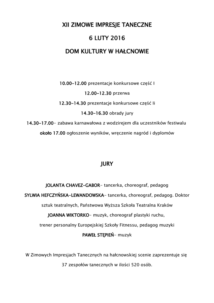 XII ZIMOWE IMPRESJE TANECZNE 6 LUTY 2016 DOM KULTURY W HAŁCNOWIE 10.00-12.00 prezentacje konkursowe część I 12.00-12.30 przerwa 12.30-14.30 prezentacje konkursowe część Ii 14.30-16.30 obrady jury 14.30-17.00- zabawa karnawałowa z wodzirejem dla uczestników festiwalu około 17.00 ogłoszenie wyników, wręczenie nagród i dyplomów JURY JOLANTA CHAVEZ-GABOR- tancerka, choreograf, pedagog SYLWIA HEFCZYŃSKA-LEWANDOWSKA- tancerka, choreograf, pedagog. Doktor sztuk teatralnych, Państwowa Wyższa Szkoła Teatralna Kraków JOANNA WIKTORKO- muzyk, choreograf plastyki ruchu, trener personalny Europejskiej Szkoły Fitnessu, pedagog muzyki PAWEŁ STĘPIEŃ- muzyk W Zimowych Impresjach Tanecznych na hałcnowskiej scenie zaprezentuje się 37 zespołów tanecznych w ilości 520 osób. PREZENTACJE KONKURSOWE CZĘŚĆ I GODZ. 10.00-12.00 KATEGORIA: INSCENIZACJA TANECZNA 1.ZESPÓŁ „MODERN MOTION”- South Motion Studio Tańca w Bielsku-Białej • „ Wciąż szukam” • choreograf: Ewelina Tomiczak 4,30 min. 2.ZESPÓŁ „FENOMEN”- Dom Kultury w Kamienicy • „ Latawiec” • choreograf: Alicja Paleta 5,00 min. 3.ZESPOŁ „ ENIGMA”- Dom Kultury im. W. Kubisz • „ Dokąd” • choreograf: Sabina Gwizdała 4,00 min. 4.ZESPÓŁ „ FORMA”- Dom Kultury w Olszówce • „ Dogonić marzenia” • choreograf: Sabina Gwizdała 3,50 min. 5.ZESPÓŁ „ IMPULS”- Dom Kultury w Wapienicy • „ Śpiące infantki” 4,50 min. • choreograf: Ewa Czubińska, praca nad techniką ruchu Izabela Sojka 6.ZESPÓŁ „ SIGMA”- South Motion Studio Tańca w Bielsku-Białej • „ Ukojenie” • choreograf: Ewelina Tomiczak 4,30 min. 7.ZESPÓŁ „ PSIKUSY” i „ CHOCHLIKI”- Dom Kultury w Kamienicy • „ Najpiękniejsza?” • choreograf: Aldona Hijacent-Paleta, Magdalena Koim 4,00 min. 8.ZESPÓŁ „ ENIGMA JUNIOR”- Dom Kultury im. W. Kubisz • „ Żurawie” 4,40 min. • choreograf: Sabina Gwizdała 9.ZESPÓŁ „ MAŁA FORMA”- Dom Kultury w Olszówce • „ Koszmar szkolny” • choreograf: Sabina Gwizdała 4,00 min. 10.ZESPÓŁ „ DOMINUTKI”- Dom Kultury im. W. Kubisz • „ W starej szafie” • choreograf: Sabina Gwizdała 3,40 min. KATEGORIA: TANIEC WSPÓŁCZESNY 11.ZESPÓŁ „FENOMEN”- Dom Kultury w Kamienicy • „ Roszada” • choreograf: Alicja Paleta, Magdalena Koim 4,00 min. 12.ZESPÓŁ „ ENIGMA”- Dom Kultury im. W. Kubisz • „ Telefon, telefon, telefon” • choreograf: Sabina Gwizdała 3,50 min. 13.ZESPÓŁ „ ART DANCE”- Dom Kultury im. W. Kubisz • „ Mechanika” • choreograf: Agnieszka Marynowska 3,50 m in. 14.ZESPÓŁ „ MŁODY FENOMEN” i „ TĘCZOWE NUTKI”- Dom Kultury w Kamienicy • „ Jesień” • choreograf: Aldona Hijacent-Paleta, Alicja Paleta 4,00 min. INNE PROPOZYCJE TANECZNE 15.ZESPÓŁ FOLKLORYSTYCZNY TAŃCÓW BAŁKAŃSKICH „ KOLO”-Dom Kultury im. W. Kubisz • „ Pajduszko” - taniec macedoński • choreograf: Avdyl Murtez 4,00 min. KATEGORIA: TANIEC NOWOCZESNY 16.ZESPÓŁ SHE-CAT'S- Publiczne Gimnazjum w Trzebini • „ Drop money” • choreograf: Tomasz Podgórski 3,50 min. 17.ZESPÓŁ „ PIONA”-Dom Kultury im. W. Kubisz • „ Rozbiegani” • choreograf: Katarzyna Borutko 2,50 min. 18.ZESPÓŁ „ D.G.F CREW- Dom Kultury w Wapienicy • „ Beats of city” • choreograf: Paulina Kachel 3,20 min. 19.ZESPÓŁ TDK CREW- Zespół Szkolno-Przedszkolny w Trzebini • „ Funny time” • choreograf: Tomasz Podgórski 4,29 min. 20.ZESPÓŁ MAD MOVES- Dom Kultury „ Włókniarzy” • „ Water dance” • choreograf: Małgorzata Tracz 4,00 min. KATEGORIA: INNE PROPOZYCJE TANECZNE 20.ZESPÓŁ FOLKLORYSTYCZNY TAŃCÓW BAŁKAŃSKICH „ KOLO”-Dom Kultury im. W. Kubisz • „Taniec z Północnej Bułgarii” • choreograf: Avdyl Murtez 4,20 min. KATEGORIA: TANIEC WSPÓŁCZESNY 21.ZESPÓŁ „ CONTRA”- Dom Kultury w Wapienicy • „ Kosmiczna Odyseja” • choreograf: Izabela Sojka 3,30 min. PREZENTACJE KONKURSOWE CZĘŚĆ II GODZ.12.30-14.30 KATEGORIA : TEATR TAŃCA 1.ZESPÓŁ „ DE FACTO”- Dom Kultury w Hałcnowie • „ Inny świat” 6,00 min. • choreograf: Agata Muszyńska 2.TEATR TAŃCA PASJA- Zespół Szkół Ogólnokształcących w Bielsku-Białej • „ Manekiny” 10 min. • choreograf: Natalia Gacek, Karolina Korzeniowska KATEGORIA: TANIEC WSPÓŁCZESNY 3.ZESPÓŁ „ BLACKSWANS”- Centrum Sportowo-Widowiskowe w Kozach • „ Magiczne pudełko” • choreograf: Marta Gancarz 3,50 min. 4.FORMACJA TAŃCA JAZZOWEGO J-J – Świetlica w Mikuszowicach Krakowskich • „ Przemiana” • choreograf: Katarzyna Bator- Sromek 3.30 min. 5.ZESPÓŁ „ INSOMNIA” -Centrum Sportowo-Widowiskowe w Kozach • „ Dream” • choreograf: Marta Gancarz 3,22 min. 6.FORMACJA TAŃCA JAZZOWEGO J-J JUNIOR– Świetlica w Mikuszowicach Krakowskich • „ O czasie...” • choreograf: Katarzyna Bator 2,30 min. KATEGORIA: INSCENIZACJA TANECZNA 7.ZESPÓŁ „ MINI SOUL DANCE”- Szkoła Tańca i Ruchu „ Soul Dance” w Dębicy • „ Gdzie myszy harcują tam...” • choreograf: Izabela Wójcik, Edyta Mędrel-Śliwa 3,00 min. 8.ZESPÓŁ „ STOKROTKI V”- dom Kultury „ Włókniarzy” • „ Upadek mocy” • choreograf: Alina Jureczko, Agata Kruczyńska 6,00 min. 9.ZESPÓŁ „ DE FACTO”- Dom Kultury w Hałcnowie • „ Kraina lodu” 3,00 min. • choreograf: Agata Muszyńska 10.TEATR TAŃCA PASJA- Zespół Szkół Ogólnokształcących w Bielsku-Białej • „ Sail” 4,00 min. • choreograf: Natalia Gacek, Karolina Korzeniowska KATEGORIA: TANIEC WSPÓŁCZESNY 11.ZESPÓŁ „ BLACKSWANS”- Centrum Sportowo-Widowiskowe w Kozach • „Run” • choreograf: Marta Gancarz 3,20 min. KATEGORIA: TANIEC NOWOCZESNY 12.ZESPÓŁ „ BIKIDS”- Centrum Sportowo-Widowiskowe w Kozach • „ Taniec uliczny” • choreograf: Paweł Guzik 3,15 min. 13.ZESPÓŁ „ TORNADO” GRUPA DREAM- Miejski Ośrodek Kultury w Pszowie • „ Dream team” • choreograf: Marcelina Majcher 2,4