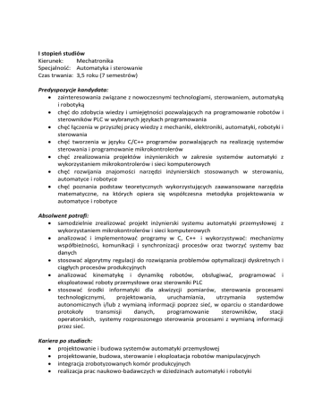 I stopień studiów Kierunek: Mechatronika Specjalność: Automatyka i sterowanie Czas trwania: 3,5 roku (7 semestrów) Predyspozycje kandydata: zainteresowania związane z nowoczesnymi technologiami, sterowaniem, automatyką i robotyką chęć do zdobycia wiedzy i umiejętności pozwalających na programowanie robotów i sterowników PLC w wybranych językach programowania chęć łączenia w przyszłej pracy wiedzy z mechaniki, elektroniki, automatyki, robotyki i sterowania chęć tworzenia w języku C/C++ programów pozwalających na realizację systemów sterowania i programowanie mikrokontrolerów chęć zrealizowania projektów inżynierskich w zakresie systemów automatyki z wykorzystaniem mikrokontrolerów i sieci komputerowych chęć rozwijania znajomości narzędzi inżynierskich stosowanych w sterowaniu, automatyce i robotyce chęć poznania podstaw teoretycznych wykorzystujących zaawansowane narzędzia matematyczne, na których opiera się współczesna metodyka projektowania w automatyce i robotyce Absolwent potrafi: samodzielnie zrealizować projekt inżynierski systemu automatyki przemysłowej z wykorzystaniem mikrokontrolerów i sieci komputerowych analizować i implementować programy w C, C++ i wykorzystywać: mechanizmy współbieżności, komunikacji i synchronizacji procesów oraz tworzyć systemy baz danych stosować algorytmy regulacji do rozwiązania problemów optymalizacji dyskretnych i ciągłych procesów produkcyjnych analizować kinematykę i dynamikę robotów, obsługiwać, programować i eksploatować roboty przemysłowe oraz sterowniki PLC stosować środki informatyki dla akwizycji pomiarów, sterowania procesami technologicznymi, projektowania, uruchamiania, utrzymania systemów autonomicznych i/lub z wymianą informacji poprzez sieć, w oparciu o standardowe protokoły transmisji danych, programowanie sterowników, stacji operatorskich, systemy rozproszonego sterowania procesami z wymianą informacji przez sieć. Kariera po studiach: projektowanie i budowa systemów automatyki przemysłowej projektowanie, budowa, sterowanie i eksploatacja robotów manipulacyjnych integracja zrobotyzowanych komór produkcyjnych realizacja prac naukowo-badawczych w dziedzinach automatyki i robotyki Perspektywy zawodowe: inżynier utrzymania ruchu inżynier ds. serwisu programista robotów przemysłowych inżynier ds. uruchomień operator zrobotyzowanych komór produkcyjnych