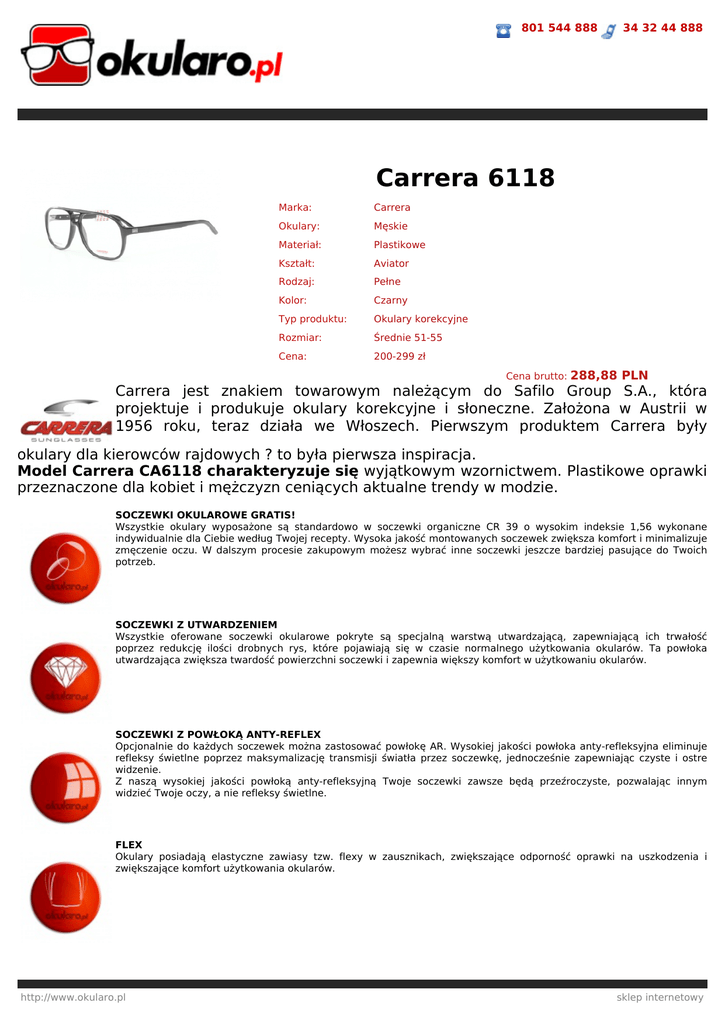 801 544 888 34 32 44 888 Carrera 6118 Marka: Carrera Okulary: Męskie Materiał: Plastikowe Kształt: Aviator Rodzaj: Pełne Kolor: Czarny Typ produktu: Okulary korekcyjne Rozmiar: Średnie 51-55 Cena: 200-299 zł Cena brutto: 288,88 PLN Carrera jest znakiem towarowym należącym do Safilo Group S.A., która projektuje i produkuje okulary korekcyjne i słoneczne. Założona w Austrii w 1956 roku, teraz działa we Włoszech. Pierwszym produktem Carrera były okulary dla kierowców rajdowych ? to była pierwsza inspiracja. Model Carrera CA6118 charakteryzuje się wyjątkowym wzornictwem. Plastikowe oprawki przeznaczone dla kobiet i mężczyzn ceniących aktualne trendy w modzie. SOCZEWKI OKULAROWE GRATIS! Wszystkie okulary wyposażone są standardowo w soczewki organiczne CR 39 o wysokim indeksie 1,56 wykonane indywidualnie dla Ciebie według Twojej recepty. Wysoka jakość montowanych soczewek zwiększa komfort i minimalizuje zmęczenie oczu. W dalszym procesie zakupowym możesz wybrać inne soczewki jeszcze bardziej pasujące do Twoich potrzeb. SOCZEWKI Z UTWARDZENIEM Wszystkie oferowane soczewki okularowe pokryte są specjalną warstwą utwardzającą, zapewniającą ich trwałość poprzez redukcję ilości drobnych rys, które pojawiają się w czasie normalnego użytkowania okularów. Ta powłoka utwardzająca zwiększa twardość powierzchni soczewki i zapewnia większy komfort w użytkowaniu okularów. SOCZEWKI Z POWŁOKĄ ANTY-REFLEX Opcjonalnie do każdych soczewek można zastosować powłokę AR. Wysokiej jakości powłoka anty-refleksyjna eliminuje refleksy świetlne poprzez maksymalizację transmisji światła przez soczewkę, jednocześnie zapewniając czyste i ostre widzenie. Z naszą wysokiej jakości powłoką anty-refleksyjną Twoje soczewki zawsze będą przeźroczyste, pozwalając innym widzieć Twoje oczy, a nie refleksy świetlne. FLEX Okulary posiadają elastyczne zawiasy tzw. flexy w zausznikach, zwiększające odporność oprawki na uszkodzenia i zwiększające komfort użytkowania okularów. http://www.okularo.pl sklep internetowy 801 544 888 34 32 44 888 ETUI I MIKROFIBRA GRATIS! Do każdej zamówionej pary dołączony jest zestaw oryginalnych akcesoriów (markowe etui i ściereczkę z mikrofibry). Etui może różnić się od przedstawionego na zdjęciu ze względu na pojawiające się nowe modele etui u producentów. WYSYŁKA 24H Towar dostępny w naszym magazynie. Wysyłamy w ciągu 24h. W przypadku okularów korekcyjnych termin może ulec zmianie w zależności od wybranych soczewek okularowych. 100% SATYSFAKCJI Z ZAKUPU Dokładamy wszelkich starań aby satysfakcja z zakupów u nas była 100-procentowa! Dlatego do każdego zamówionego u nas towaru dajemy 10-dniową gwarancję satysfakcji. Gwarantujemy Ci możliwość rezygnacji z dokonanego zakupu bez podania przyczyny w ciągu 10 dni od daty odebrania przesyłki. Zwracany towar nie może być używany, opakowanie ani żaden inny element wyposażenia nie mogą nosić śladów użytkowania ani zniszczenia, powinien być kompletny i zwrócony w oryginalnym opakowaniu firmowym producenta wraz z wszelkimi dodatkami. Przed wysłaniem przesyłki należy skontaktować sie z działem obsługi klientów okularo.pl. WYSOKA JAKOŚĆ Wszystkie oferowane przez nas okulary wykonujemy w naszych profesjonalnie wyposażonych pracowniach optycznych. Na najwyższej jakości sprzęcie przez doświadczonych Mistrzów Optyki Okularowej. Każde wykonane okulary przechodzą dokładne testy jakości, przez co otrzymujesz od nas wysoki komfort widzenia i ochronę swojego wzroku. GWARANCJA 12 MIESIĘCY Zwracamy szczególną uwagę na jakość wykonując okulary na zamówienie zgodnie z Twoją receptą. Jeśli w okresie 1 roku od zakupu pojawią się jakiekolwiek wady w zakupionych okularach, będziemy je naprawiać lub wymieniać na nowe bez żadnych opłat. Wszystkie oferowane przez nas towary posiadają gwarancję producenta, dystrybutora lub sprzedawcy na okres co najmniej 12 miesięcy. 100% ORYGINAŁ Wszystkie oferowane przez nas produkty są fabrycznie nowe w oryginalnych opakowaniach z gwarancją jakości i oryginalności. PRZESYŁKA GRATIS! Zamawiając ten produkt nie płacisz za przesyłkę. http://www.okularo.pl sklep internetowy 801 544 888 34 32 44 888 ZESTAW DO PIELĘGNACJI OKULARÓW GRATIS! W prezencie otrzymujesz zestaw do pielęgnacji okularów o wartości 30zł! http://www.okularo.pl sklep internetowy