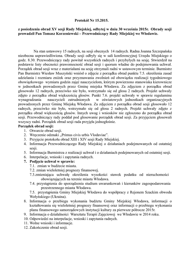 Protokół Nr 15.2015. z posiedzenia obrad XV sesji Rady Miejskiej, odbytej w dniu 30 września 2015r. Obrady sesji prowadził Pan Tomasz Korzeniewski – Przewodniczący Rady Miejskiej we Włodawie. Na stan ustawowy 15 radnych, na sesji obecnych 14 radnych. Radna Joanna Szczepańska nieobecna usprawiedliwiona. Obrady sesji odbyły się w sali konferencyjnej Urzędu Miejskiego o godz. 8.30. Przewodniczący rady powitał wszystkich radnych i przybyłych na sesję. Stwierdził na podstawie listy obecności prawomocność obrad sesji i quorum władne do podejmowania uchwał. Porządek obrad sesji wraz z materiałami na sesję otrzymali radni w ustawowym terminie. Burmistrz Pan Burmistrz Wiesław Muszyński wniósł o zdjęcie z porządku obrad punktu 7.5. określenia zasad udzielania i rozmiaru zniżek oraz przyznawania zwolnień od obowiązku realizacji tygodniowego obowiązkowego wymiaru godzin zajęć nauczycielom, którym powierzono stanowiska kierownicze w jednostkach prowadzonych przez Gminę miejska Włodawa. Za zdjęciem z porządku obrad głosowało 12 radnych, przeciwko nie było, wstrzymało się od głosu 2 radnych. Projekt uchwały zdjęto z porządku obrad większością głosów. Punkt 7.6. projekt uchwały w sprawie regulaminu wynagradzania nauczycieli zatrudnionych w oświatowych jednostkach organizacyjnych prowadzonych przez Gminę Miejską Włodawa. Za zdjęciem z porządku obrad sesji głosowało 12 radnych, przeciwko nie było, wstrzymało się od głosu 2 radnych. Projekt uchwały zdjęto z porządku obrad większością głosów. Innych uwag i wniosków nie zgłoszono do porządku obrad sesji. Przewodniczący rady poddał pod głosowanie porządek obrad sesji. Za przyjęciem głosowali wszyscy radni. Porządek obrad sesji rada przyjęła jednogłośnie. Porządek obrad sesji: 1. Otwarcie obrad sesji. 2. Wręczenie odznaki „Primus civis urbis Vlodaviae”. 3. Przyjęcie protokołu obrad XIII i XIV sesji Rady Miejskiej. 4. Informacja Przewodniczącego Rady Miejskiej o działaniach podejmowanych od ostatniej sesji. 5. Informacja Burmistrza z realizacji uchwał i o działaniach podejmowanych od ostatniej sesji. 6. Interpelacje, wnioski i zapytania radnych. 7. Podjęcie uchwał w sprawie: 7.1. zmian w budżecie miasta. 7.2. zmian wieloletniej prognozy finansowej. 7.3.zmieniająca uchwałę określenia wysokości stawek podatku od nieruchomości obowiązujących na terenie miasta Włodawa. 7.4. przystąpienia do sporządzenia studium uwarunkowań i kierunków zagospodarowania przestrzennego miasta Włodawa. 7.5. przystąpienia Gminy Miejskiej Włodawa do współpracy z Rejonem Szackim obwodu Wołyńskiego (Ukraina). 8. Informacja o przebiegu wykonania budżetu Gminy Miejskiej Włodawa, informacji o kształtowaniu się wieloletniej prognozy finansowej oraz informacji o przebiegu wykonania planu finansowego samorządowych instytucji kultury za pierwsze półrocze 2015r. 9. Informacja o działalności Warsztatu Terapii Zajęciowej we Włodawie w 2014 roku. 10. Odpowiedzi na interpelacje, wnioski i zapytania radnych. 11. Wolne wnioski i informacje. 12. Zakończenie obrad sesji. Pkt.2. Wręczenie odznaki „Primus civis urbis Vlodaviae”. Wręczenia odznaki i dyplomu Pierwszemu Obywatelowi Miasta Włodawa Panu Edmundowi Brożkowi dokonali Burmistrz Pan Wiesław Muszyński i Przewodniczący rady Pan Tomasz Korzeniewski. Gratulacje, kwiaty i życzenia złożyli wszyscy obecni na sali obrad, zaproszenia goście, radni. Odśpiewano 100 lat i złożono życzenia. Głos zabrał Burmistrz Pan Wiesław Muszyński – odczytał uzasadnienie swojego wniosku o nadanie odznaczenia. Głos zabrał Pan Mariusz Zańko, który przytoczył życiorys oraz przypomniał lata działalności powojennej i obecnej społecznej Pana Edmunda Brożka , podkreślił i wymienił wszystkie odznaczenia jakie były przyznane Panu Edmundowi Brożkowi oraz złożył życzenia zdrowia i długich lat życia oraz w dalszym ciągu aktywnej działalności społecznej na rzecz miasta i społeczeństwa Włodawy. Pkt.3. Przyjęcie protokołu obrad XIII i XIV sesji Rady Miejskiej. Protokoły obrad XIII i XIV sesji Rady Miejskiej, w sposób zwyczajowo przyjęty były do wglądu w biurze Rady Miejskiej i w sali obrad przed sesją. Radni nie wnieśli uwag. Prowadzący obrady poddał pod głosowanie. Za przyjęciem głosowali wszyscy radni. Protokoły rada przyjęła jednogłośnie bez uwag. Pkt.4. Informacja Przewodniczącego Rady Miejskiej o działaniach podejmowanych od ostatniej sesji. Przewodniczący Rady Miejskiej poinformował, że brał udział w posiedzeniach komisji i organizacji pracy rady. Pkt.5. Informacja Burmistrza z realizacji uchwał i o działaniach podejmowanych od ostatniej sesji. Informację z realizacji uchwał otrzymali radni na piśmie. Nie wnieśli uwag. Natomiast o działaniach podejmowanych od ostatniej sesji informację radnym przekazał Burmistrz, z zakresu pracy poszczególnych wydziałów Urzędu Miejskiego i samodzielnych stanowisk. Mówił na temat azbestu i jego usunięcia w naszym mieście. Pkt.6. Interpelacje, wnioski i zapytania radnych. Radny Krzysztof Flis 1. Pytał o stan nawierzchni ulic we Włodawie, m.in. po remoncie ul. Szkolnej nadal stoją tam kałuże wody po deszczu, dlaczego niestarannie wykonywany jest remont ulic, ul. Żeromskiego stan nawierzchni ulicy i chodnika fatalny. 2. Zwrócił się do Burmistrza o wydelegowanie z UM osoby koordynatora do zawodów sportowych oraz prosi o budżet na takie imprezy. 3. Prosi o informację na temat zakończenia sporu między MZC i Spółdzielnią Mieszkaniową. 4. Zapytał ile jest klas pierwszych w Publicznym Gimnazjum Nr 1, czy jest potrzeba tworzenia szkoły studiów dla pracujących we Włodawie. Zapytał również czy był wniosek o naprawę poszycia dachowego w SP Nr 3. Radny Waldemar Kazuro 1. Czy są plany budowy Skatepark we Włodawie? Radna Beata Rudziewicz 1. Prosi o zwiększenie patroli Policji i Straży Miejskiej na ul. Krz