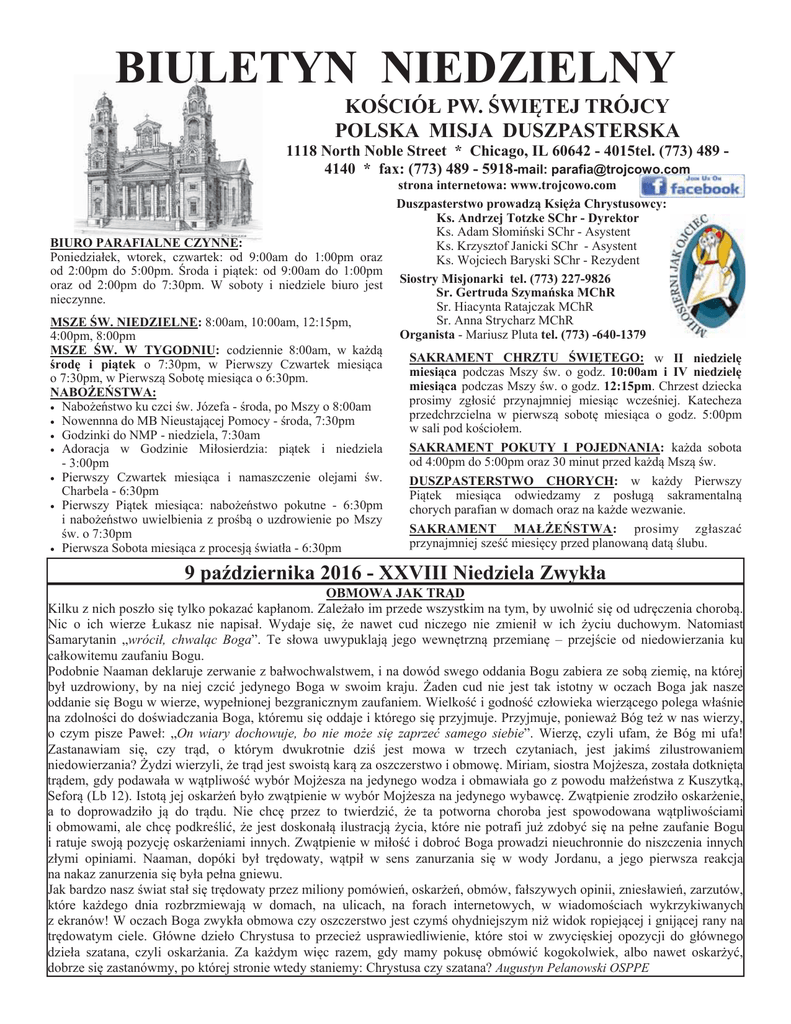 BIULETYN NIEDZIELNY KOĝCIÓà PW. ĝWIĉTEJ TRÓJCY POLSKA MISJA DUSZPASTERSKA 1118 North Noble Street * Chicago, IL 60642 - 4015tel. (773) 489 4140 * fax: (773) 489 - 5918-mail: [email protected] BIURO PARAFIALNE CZYNNE: Poniedziaáek, wtorek, czwartek: od 9:00am do 1:00pm oraz od 2:00pm do 5:00pm. ĝroda i piątek: od 9:00am do 1:00pm oraz od 2:00pm do 7:30pm. W soboty i niedziele biuro jest nieczynne. MSZE ĝW. NIEDZIELNE: 8:00am, 10:00am, 12:15pm, 4:00pm, 8:00pm MSZE ĝW. W TYGODNIU: codziennie 8:00am, w kaĪdą ĞrodĊ i piątek o 7:30pm, w Pierwszy Czwartek miesiąca o 7:30pm, w Pierwszą SobotĊ miesiąca o 6:30pm. NABOĩEēSTWA: • NaboĪeĔstwo ku czci Ğw. Józefa - Ğroda, po Mszy o 8:00am • Nowennna do MB Nieustającej Pomocy - Ğroda, 7:30pm • Godzinki do NMP - niedziela, 7:30am • Adoracja w Godzinie Miáosierdzia: piątek i niedziela - 3:00pm • Pierwszy Czwartek miesiąca i namaszczenie olejami Ğw. Charbela - 6:30pm • Pierwszy Piątek miesiąca: naboĪeĔstwo pokutne - 6:30pm i naboĪeĔstwo uwielbienia z proĞbą o uzdrowienie po Mszy Ğw. o 7:30pm • Pierwsza Sobota miesiąca z procesją Ğwiatáa - 6:30pm strona internetowa: www.trojcowo.com Duszpasterstwo prowadzą KsiĊĪa Chrystusowcy: Ks. Andrzej Totzke SChr - Dyrektor Ks. Adam SáomiĔski SChr - Asystent Ks. Krzysztof Janicki SChr - Asystent Ks. Wojciech Baryski SChr - Rezydent Siostry Misjonarki tel. (773) 227-9826 Sr. Gertruda SzymaĔska MChR Sr. Hiacynta Ratajczak MChR Sr. Anna Strycharz MChR Organista - Mariusz Pluta tel. (773) -640-1379 SAKRAMENT CHRZTU ĝWIĉTEGO: w II niedzielĊ miesiąca podczas Mszy Ğw. o godz. 10:00am i IV niedzielĊ miesiąca podczas Mszy Ğw. o godz. 12:15pm. Chrzest dziecka prosimy zgáosiü przynajmniej miesiąc wczeĞniej. Katecheza przedchrzcielna w pierwszą sobotĊ miesiąca o godz. 5:00pm w sali pod koĞcioáem. SAKRAMENT POKUTY I POJEDNANIA: kaĪda sobota od 4:00pm do 5:00pm oraz 30 minut przed kaĪdą Mszą Ğw. DUSZPASTERSTWO CHORYCH: w kaĪdy Pierwszy Piątek miesiąca odwiedzamy z posáugą sakramentalną chorych parafian w domach oraz na kaĪde wezwanie. SAKRAMENT MAàĩEēSTWA: prosimy zgáaszaü przynajmniej szeĞü miesiĊcy przed planowaną datą Ğlubu. 9 paĨdziernika 2016 - XXVIII Niedziela Zwykáa OBMOWA JAK TRĄD Kilku z nich poszáo siĊ tylko pokazaü kapáanom. ZaleĪaáo im przede wszystkim na tym, by uwolniü siĊ od udrĊczenia chorobą. Nic o ich wierze àukasz nie napisaá. Wydaje siĊ, Īe nawet cud niczego nie zmieniá w ich Īyciu duchowym. Natomiast Samarytanin „wróciá, chwaląc Boga”. Te sáowa uwypuklają jego wewnĊtrzną przemianĊ – przejĞcie od niedowierzania ku caákowitemu zaufaniu Bogu. Podobnie Naaman deklaruje zerwanie z baáwochwalstwem, i na dowód swego oddania Bogu zabiera ze sobą ziemiĊ, na której byá uzdrowiony, by na niej czciü jedynego Boga w swoim kraju. ĩaden cud nie jest tak istotny w oczach Boga jak nasze oddanie siĊ Bogu w wierze, wypeánionej bezgranicznym zaufaniem. WielkoĞü i godnoĞü czáowieka wierzącego polega wáaĞnie na zdolnoĞci do doĞwiadczania Boga, któremu siĊ oddaje i którego siĊ przyjmuje. Przyjmuje, poniewaĪ Bóg teĪ w nas wierzy, o czym pisze Paweá: „On wiary dochowuje, bo nie moĪe siĊ zaprzeü samego siebie”. WierzĊ, czyli ufam, Īe Bóg mi ufa! Zastanawiam siĊ, czy trąd, o którym dwukrotnie dziĞ jest mowa w trzech czytaniach, jest jakimĞ zilustrowaniem niedowierzania? ĩydzi wierzyli, Īe trąd jest swoistą karą za oszczerstwo i obmowĊ. Miriam, siostra MojĪesza, zostaáa dotkniĊta trądem, gdy podawaáa w wątpliwoĞü wybór MojĪesza na jedynego wodza i obmawiaáa go z powodu maáĪeĔstwa z Kuszytką, Seforą (Lb 12). Istotą jej oskarĪeĔ byáo zwątpienie w wybór MojĪesza na jedynego wybawcĊ. Zwątpienie zrodziáo oskarĪenie, a to doprowadziáo ją do trądu. Nie chcĊ przez to twierdziü, Īe ta potworna choroba jest spowodowana wątpliwoĞciami i obmowami, ale chcĊ podkreĞliü, Īe jest doskonaáą ilustracją Īycia, które nie potrafi juĪ zdobyü siĊ na peáne zaufanie Bogu i ratuje swoją pozycjĊ oskarĪeniami innych. Zwątpienie w miáoĞü i dobroü Boga prowadzi nieuchronnie do niszczenia innych záymi opiniami. Naaman, dopóki byá trĊdowaty, wątpiá w sens zanurzania siĊ w wody Jordanu, a jego pierwsza reakcja na nakaz zanurzenia siĊ byáa peána gniewu. Jak bardzo nasz Ğwiat staá siĊ trĊdowaty przez miliony pomówieĔ, oskarĪeĔ, obmów, faászywych opinii, zniesáawieĔ, zarzutów, które kaĪdego dnia rozbrzmiewają w domach, na ulicach, na forach internetowych, w wiadomoĞciach wykrzykiwanych z ekranów! W oczach Boga zwykáa obmowa czy oszczerstwo jest czymĞ ohydniejszym niĪ widok ropiejącej i gnijącej rany na trĊdowatym ciele. Gáówne dzieáo Chrystusa to przecieĪ usprawiedliwienie, które stoi w zwyciĊskiej opozycji do gáównego dzieáa szatana, czyli oskarĪania. Za kaĪdym wiĊc razem, gdy mamy pokusĊ obmówiü kogokolwiek, albo nawet oskarĪyü, dobrze siĊ zastanówmy, po której stronie wtedy staniemy: Chrystusa czy szatana? Augustyn Pelanowski OSPPE NABOĩEēSTWA RÓĩAēCOWE NaboĪeĔstwa RóĪaĔcowe odbywają siĊ w naszym koĞciele od poniedziaáku do piątku o godz. 7:30pm, przed Mszą Ğw. Serdecznie zapraszymy do wspólnej modlitwy róĪaĔcowej. 10 paĨdziernika Biuro parafialne bĊdzie zamkniĊte Columbus Day. INSTALACJA RELIKIWII ĝW. JANA PAWàA II W niedzielĊ 23 paĨdziernika, na Mszy Ğw. o godz. 10:00am odbĊdzie siĊ uroczystoĞü instalacji relikwii Ğw. Jana Pawáa II w oátarz boczny naszego koĞcioáa. Serdecznie zapraszamy do udziaáu w uroczystoĞci! UROCZYSTY BANKIET ROKU MIàOSIERDZIA WIELKA POKUTA - KS. TOMASZ JACHEMCZYK 16 paĨdziernika podczas wszystkich Mszy Ğw. towarzyszyü nam bĊdzie ks. Tomasz Jachemczyk, który przybliĪy nam temat „Wielkiej Pokuty”. BĊdziemy áączyü siĊ z Jasną Górą, gdzie przeĪywana jest Wielka Pokuta za wszystkie grzechy popeánion